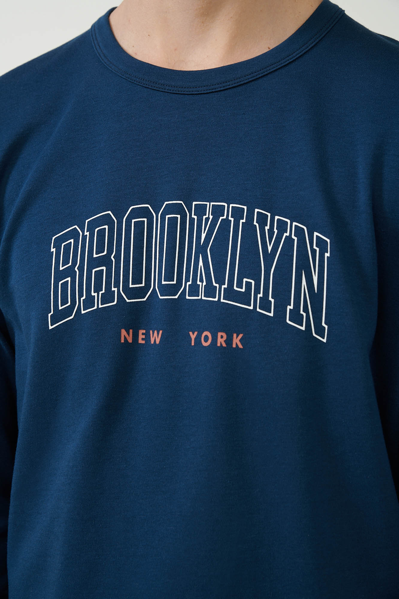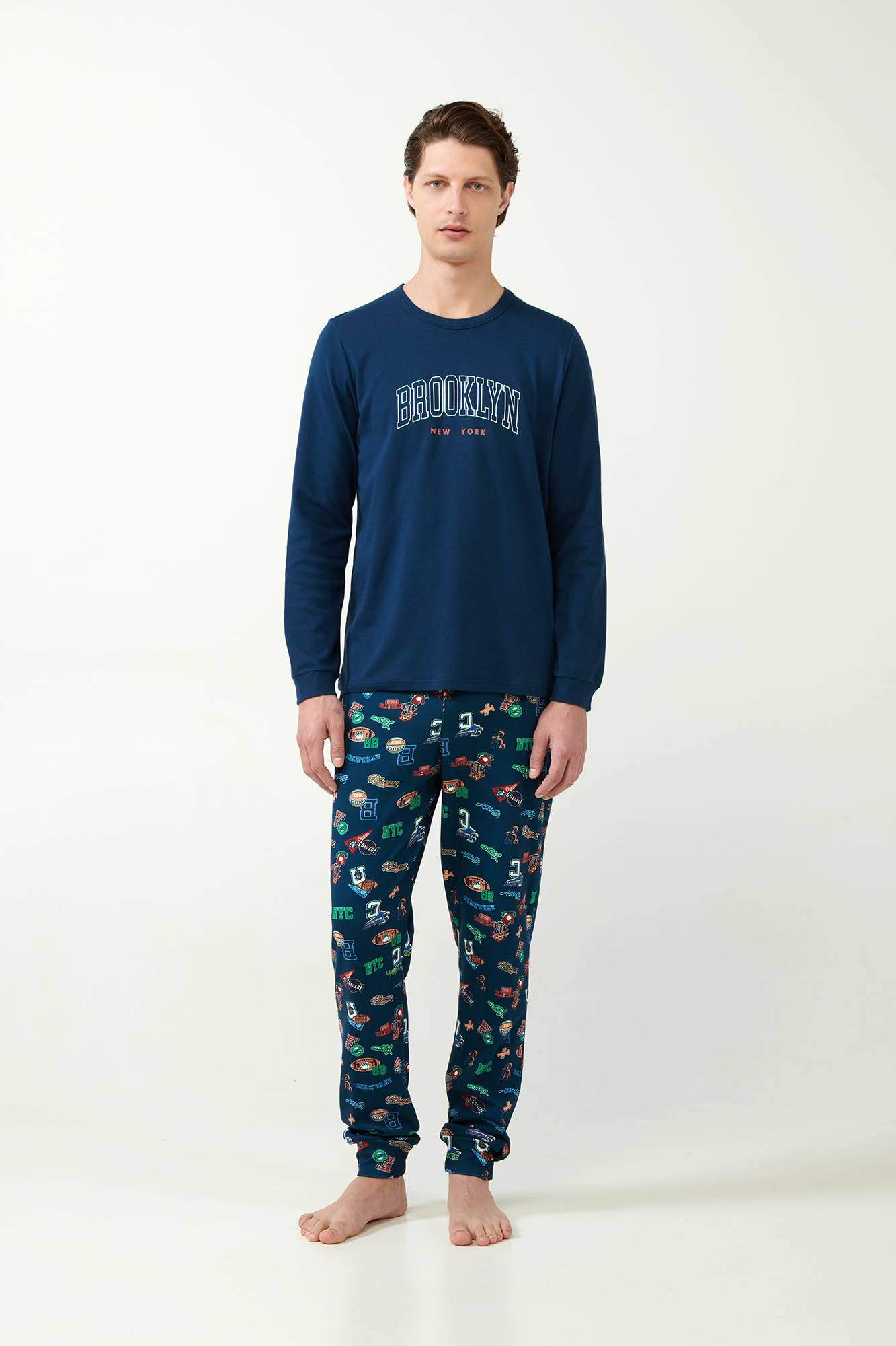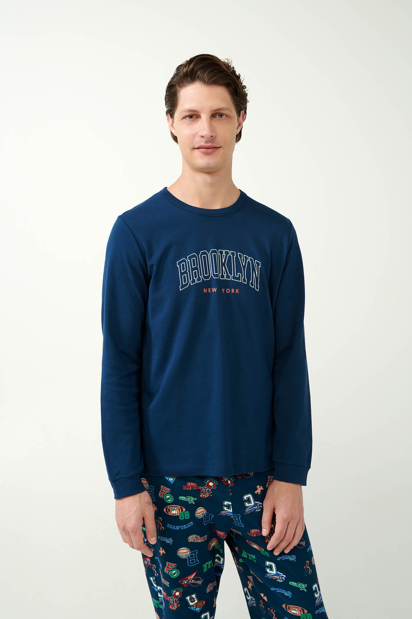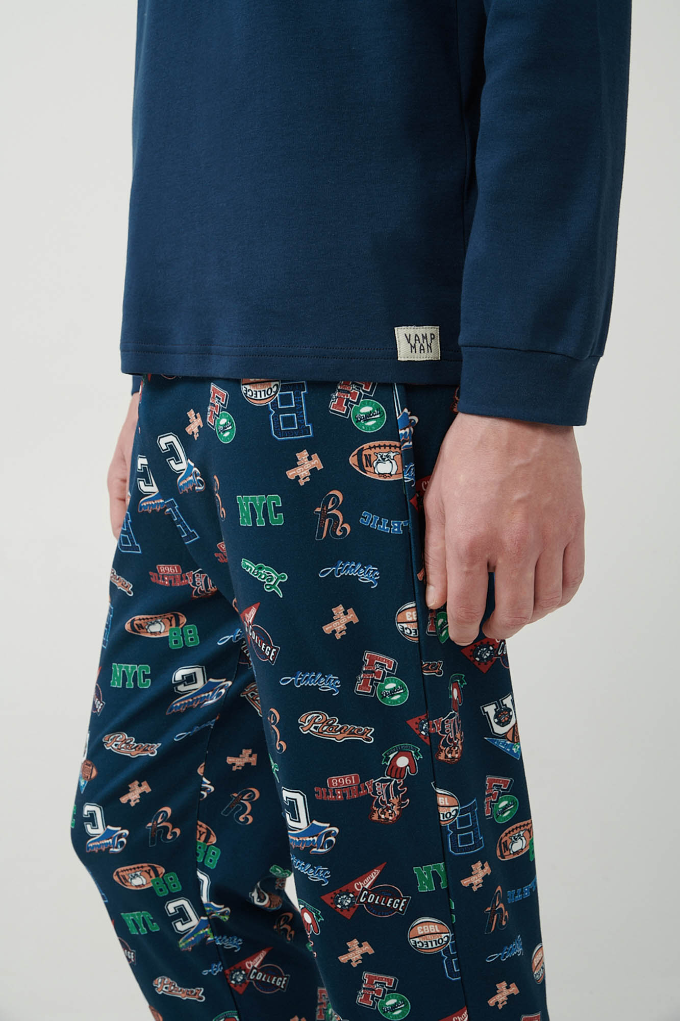 Ανανεώστε τη διάθεση σας με ένα σετ ανδρικές πυτζάμες κατασκευασμένο από 100% βαμβάκι Interlock που επιτρέπει στο σώμα να αναπνέει και χαρίζει ζεστή και απαλή αίσθηση στο δέρμα. Το σετ αποτελείται από μπλούζα με μανσέτες και τύπωμα στο στήθος. Συνοδεύεται από ένα παντελόνι με μανσέτες στο τελείωμα σε κολεγιακό αθλητικό μοτίβο. Μια όμορφη πρόταση για χαλαρά απογεύματα ή ένα ξεκούραστο Σαββατοκύριακο.