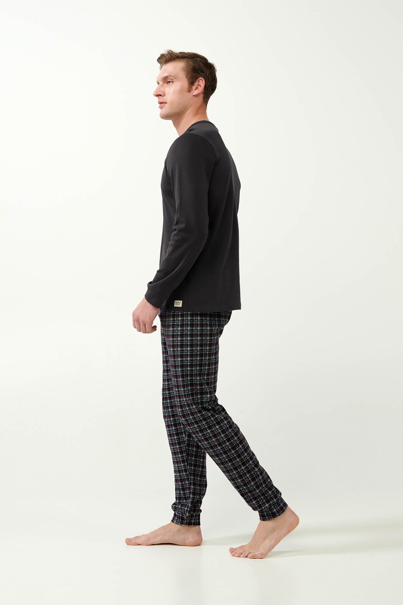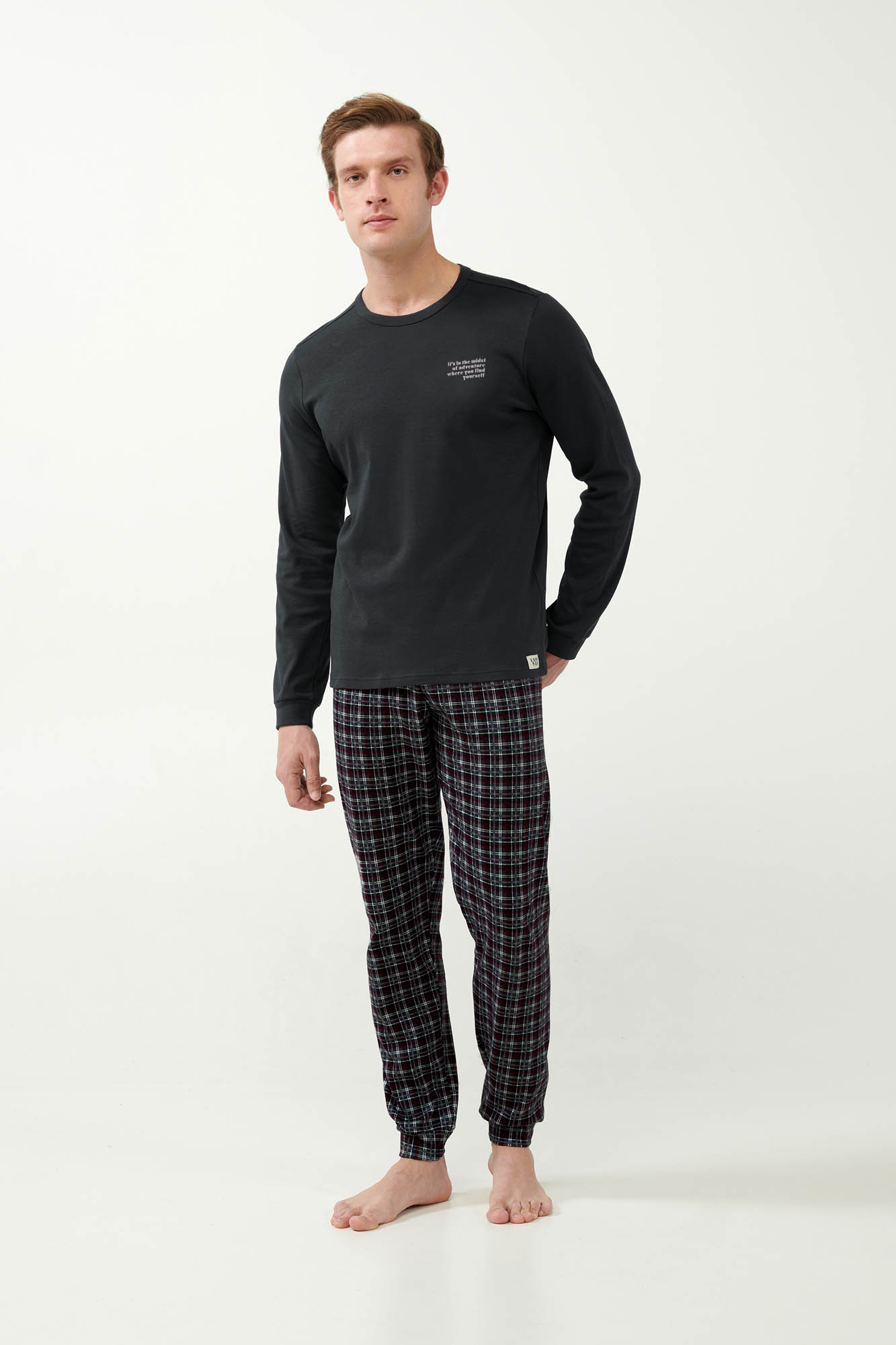 Ανανεώστε τη συλλογή σας με ένα σετ ανδρικές πυτζάμες κατασκευασμένο από 100% βαμβάκι Interlock που επιτρέπει στο σώμα να αναπνέει και χαρίζει ζεστή και απαλή αίσθηση στο δέρμα. Το σετ αποτελείται από μονόχρωμη μπλούζα με μανσέτες και διακριτικό τύπωμα στο στήθος. Συνοδεύεται από παντελόνι με μανσέτες σε μπλε ταρτάν μοτίβο. Μια όμορφη πρόταση που θα σας βοηθήσει να απολαύσετε ένα χαλαρό απόγευμα ή το βραδινό σας ύπνο.