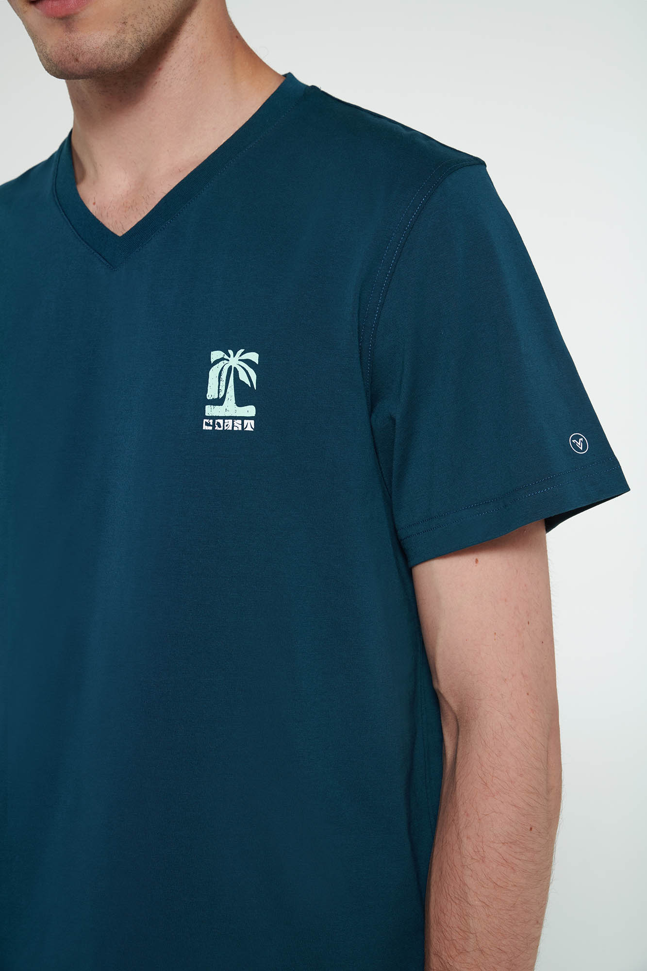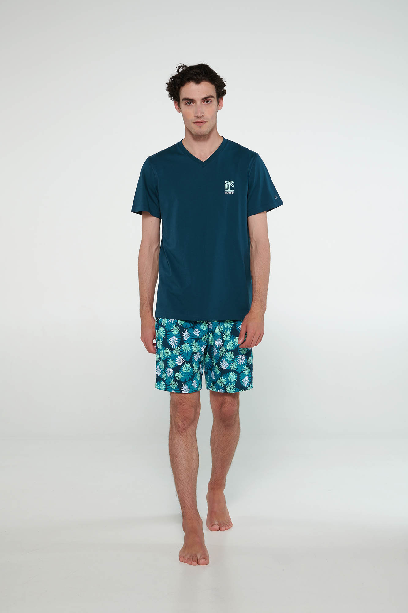 Ανδρική πυτζάμα με V λαιμόκοψη και εμπριμέ, κοντό παντελόνι. Ένα σύνολο που θα απολαύσετε κάθε στιγμή της ημέρας.