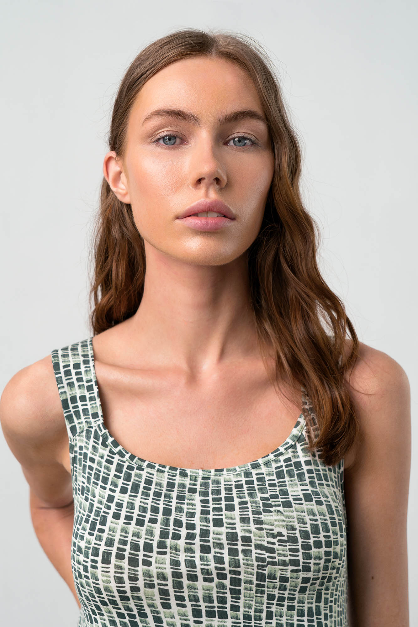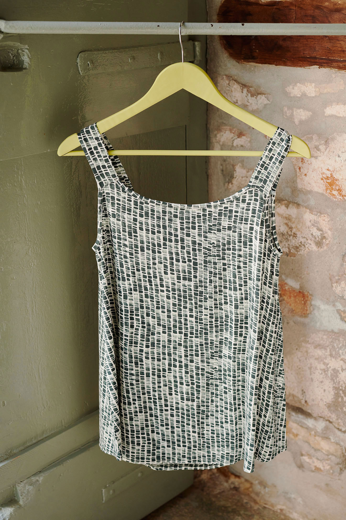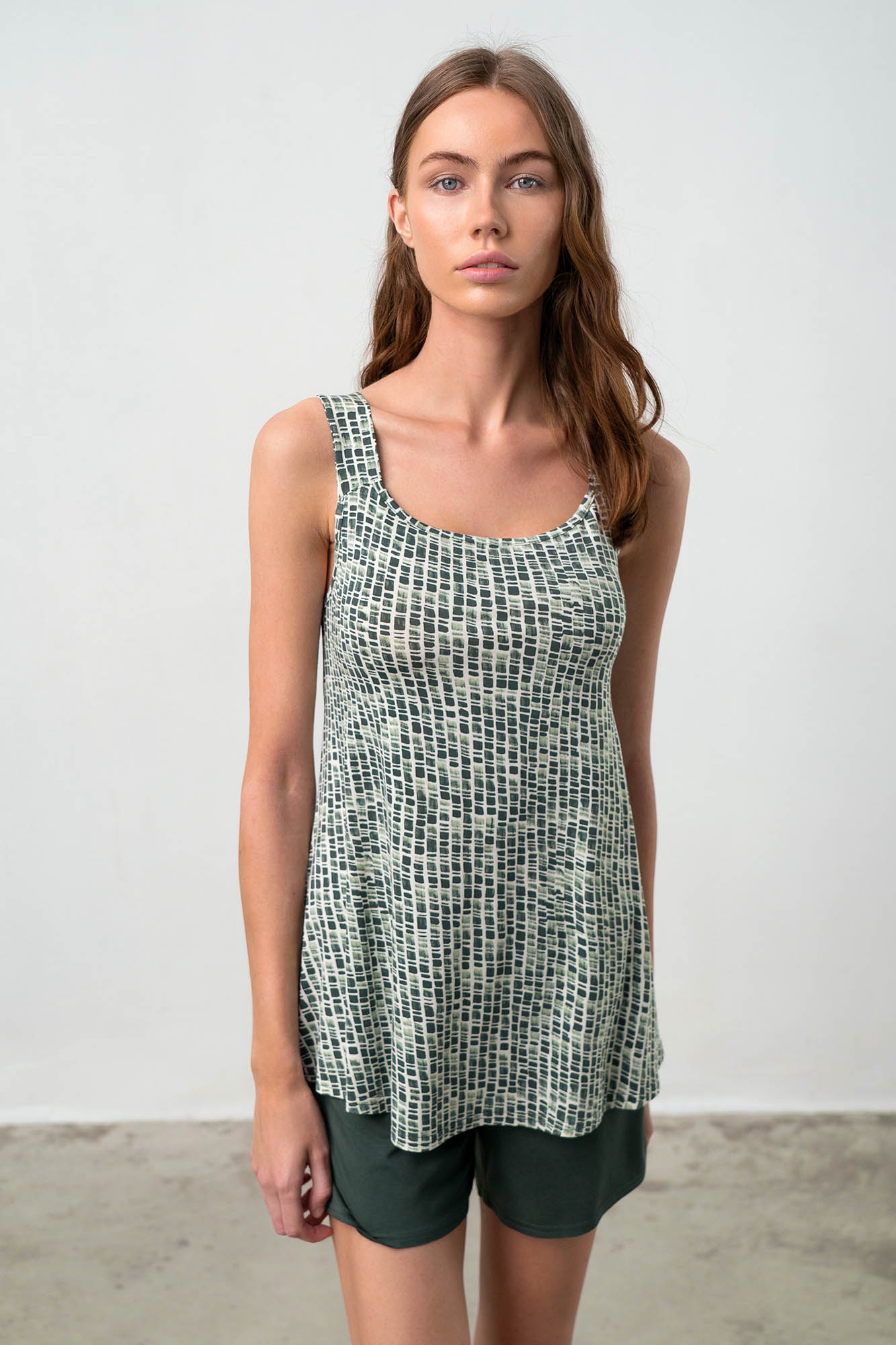 Αμάνικη, γυναικεία πυτζάμα με μονόχρωμο, κοντό παντελόνι. Ένα ιδιαίτερο εμπριμέ σχέδιο σε πράσινη απόχρωση για κάθε καλοκαιρινή ημέρα.