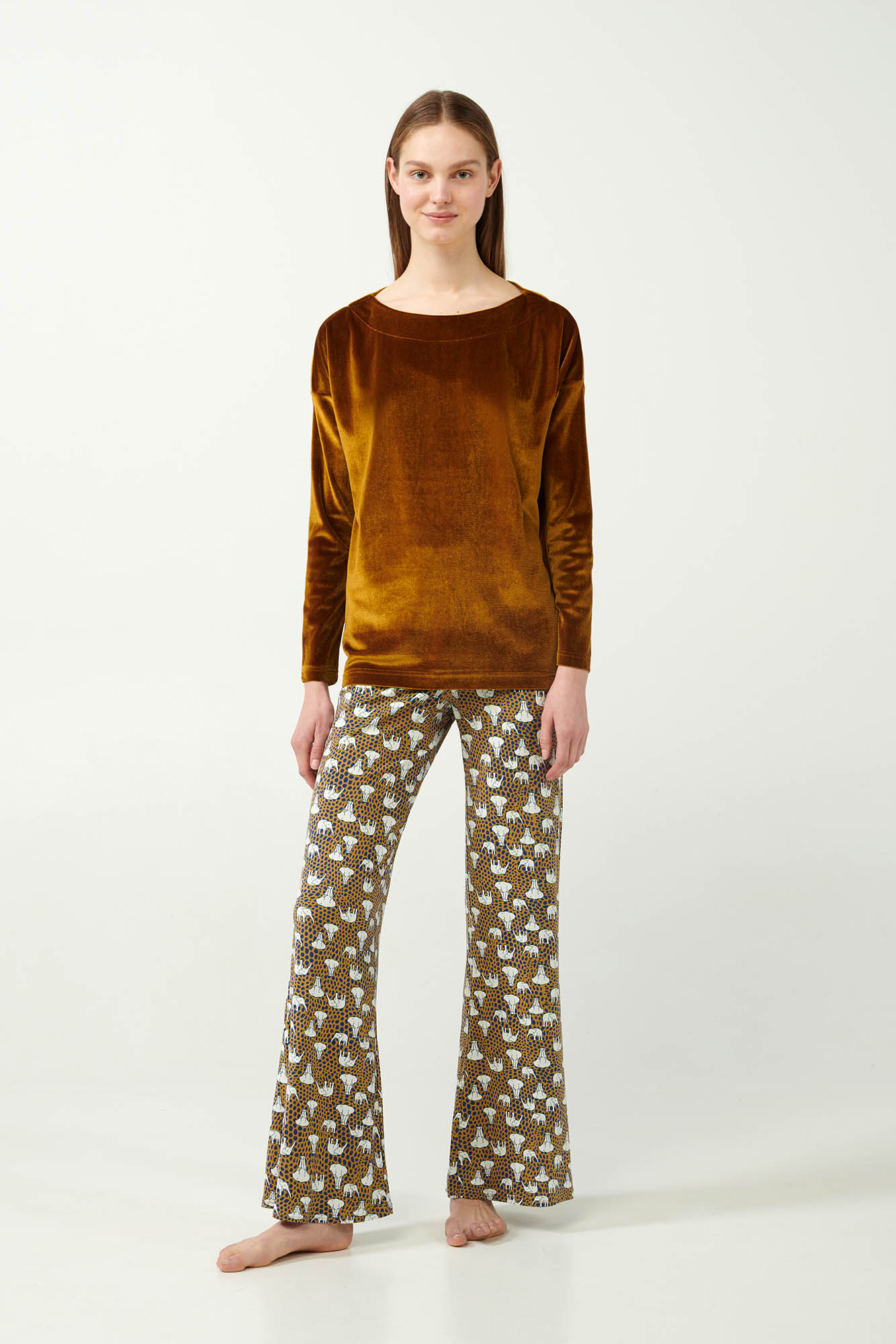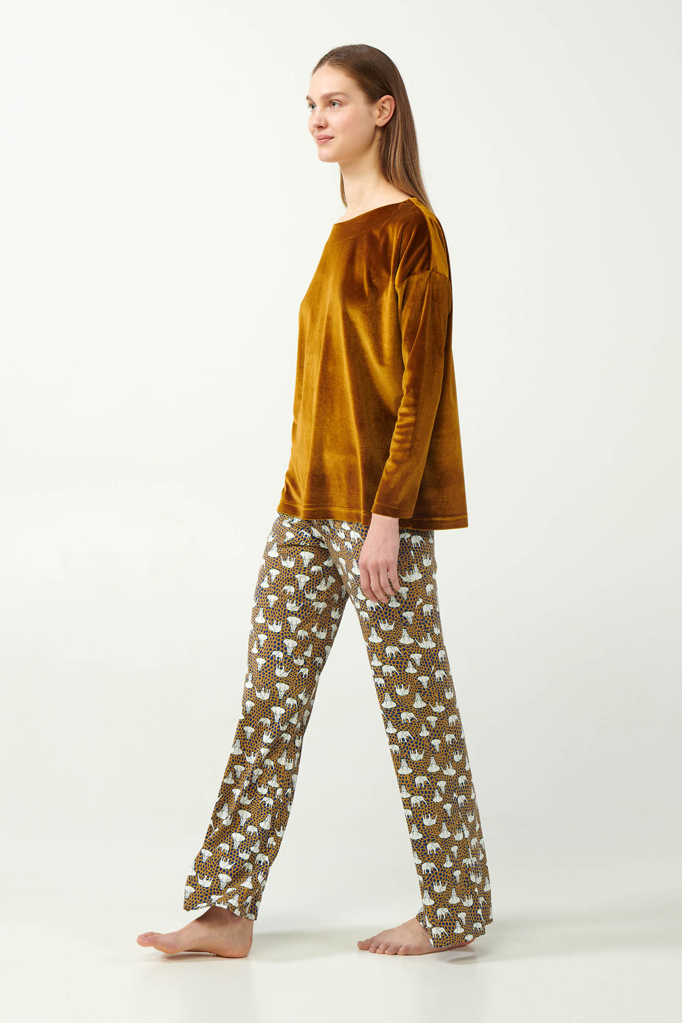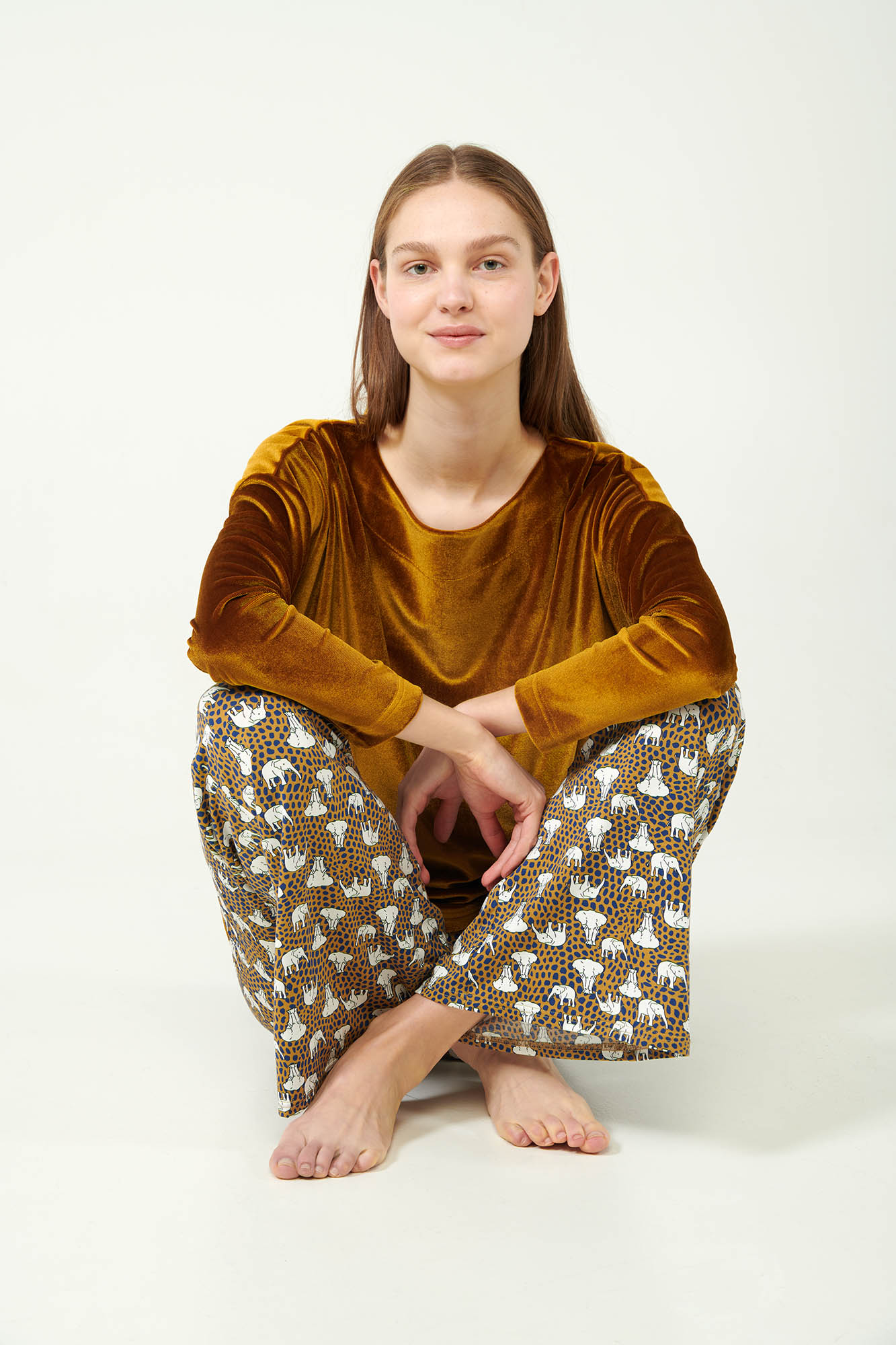 Χαλαρώστε με στυλ επιλέγοντας ένα σετ γυναικείες πυτζάμες , που αποτελείται από ένα παντελόνι καμπάνα με χαριτωμένους ελέφαντες, κατασκευασμένο από εξαιρετικά μαλακό ύφασμα micromodal. Σε συνδυασμό με ένα μονόχρωμο βελούδινο τοπ, αυτό το σετ προσφέρει ένα ιδανικό συνδυασμό άνεσης και κομψότητας. Το παιχνιδιάρικο μοτίβο ελέφαντα στο παντελόνι προσθέτει μια διασκεδαστική πινελιά, ενώ το πολυτελές βελούδινο τοπ προσφέρει ζεστή και κομψή αίσθηση. Είτε χαλαρώνετε στο σπίτι είτε απολαμβάνετε μια χαλαρή μέρα, αυτές οι πυτζάμες θα σας προσφέρουν την άνεση και το στυλ που σας αξίζει.