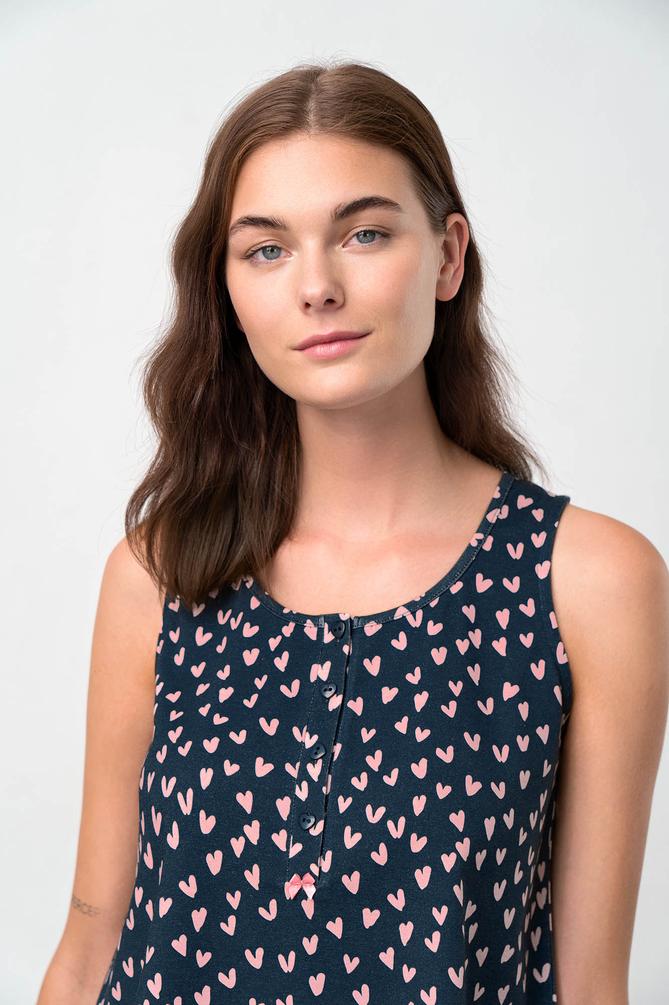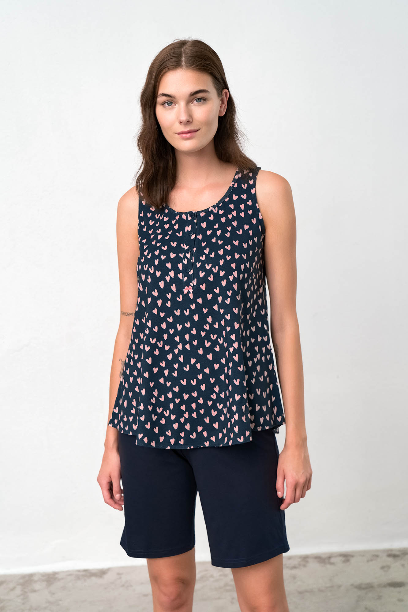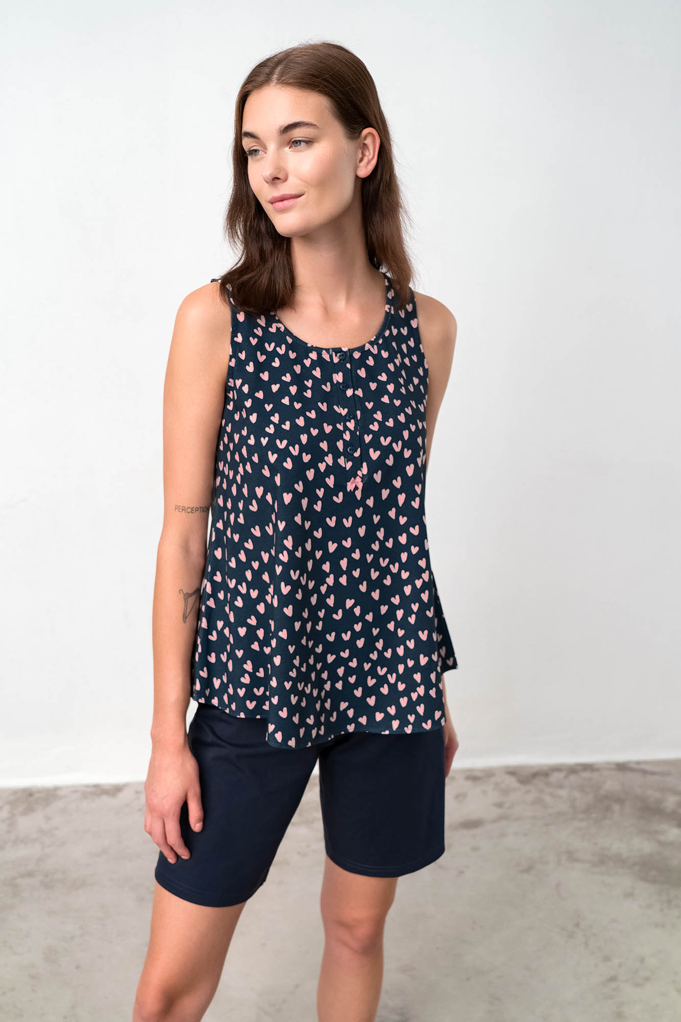 Αμάνικη, γυναικεία πυτζάμα με πατιλέτα και μονόχρωμο παντελόνι. Ένα σχέδιο με νεανική διάθεση, φτιαγμένο από δροσερό βαμβάκι που θα απολαύσετε όλη την ημέρα.