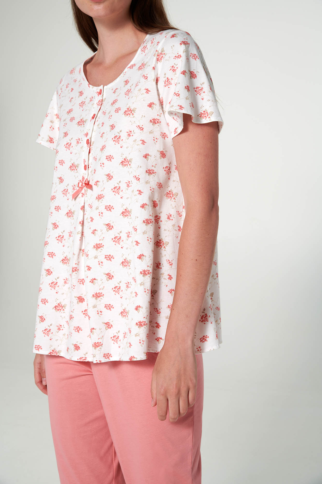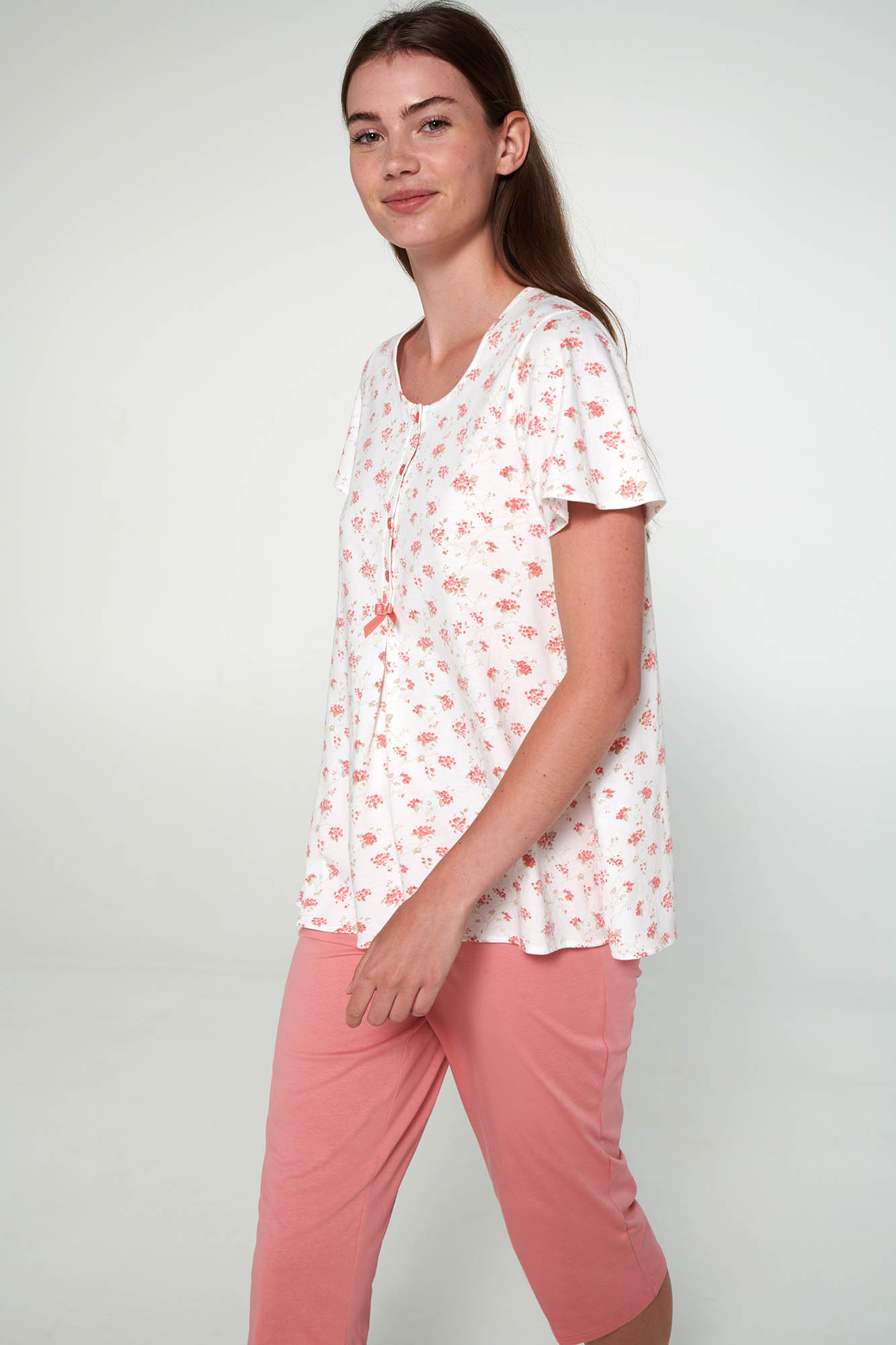 Γυναικεία πυτζάμα με πατιλέτα, κοντό μανίκι, πιέτα και κάπρι παντελόνι. Ένα ρομαντικό, φλοράλ σχέδιο από δροσερό ύφασμα.