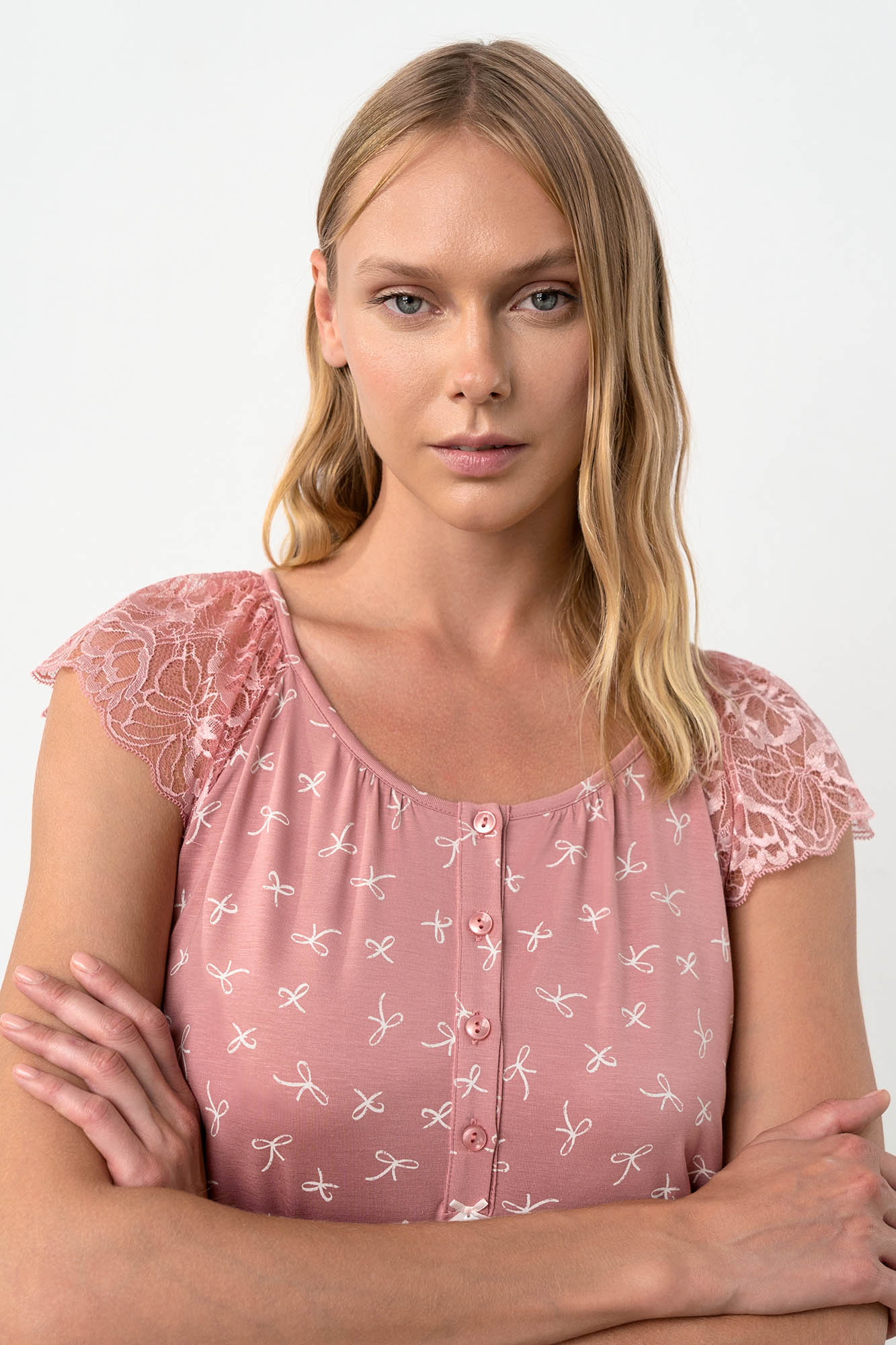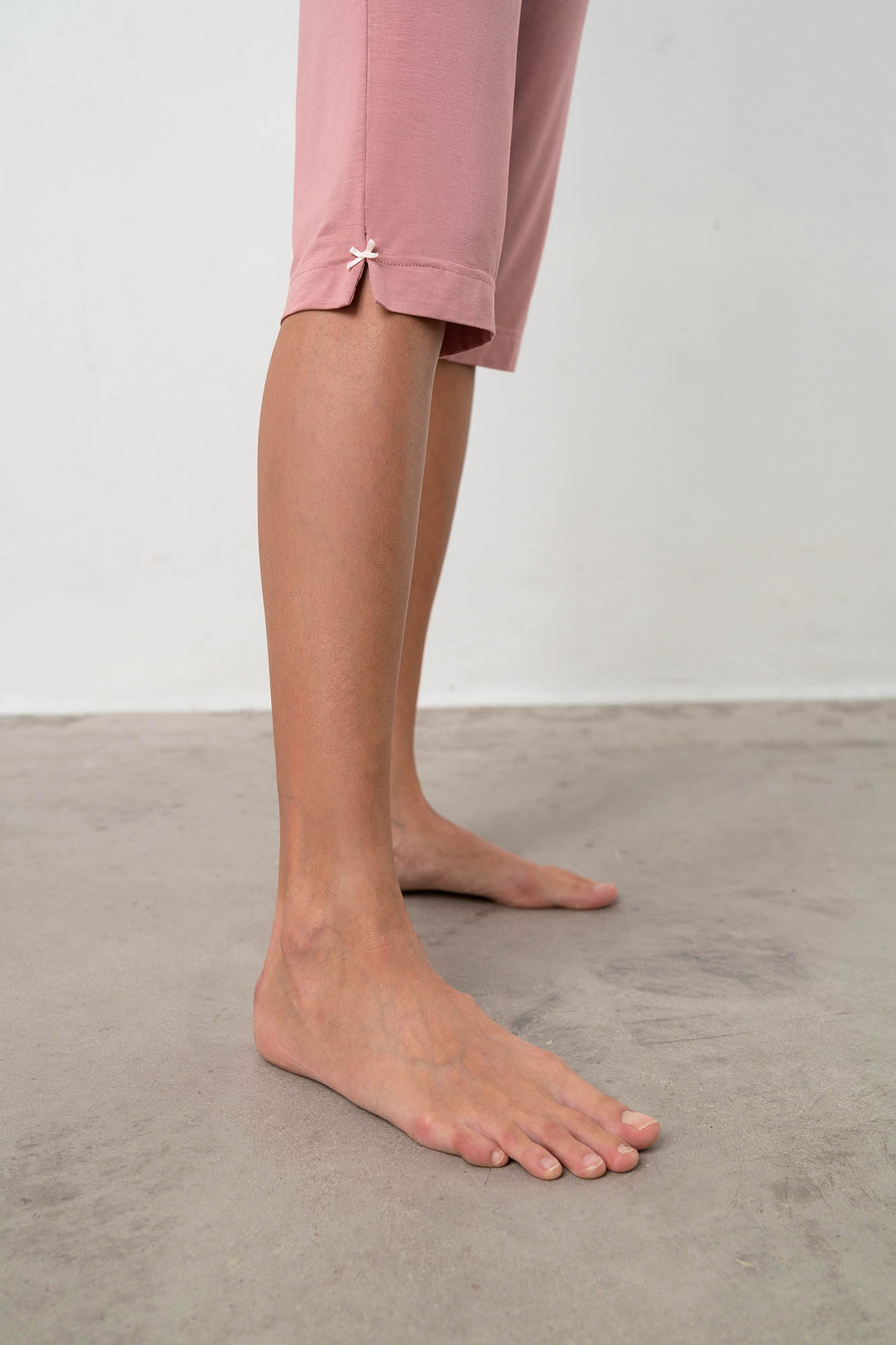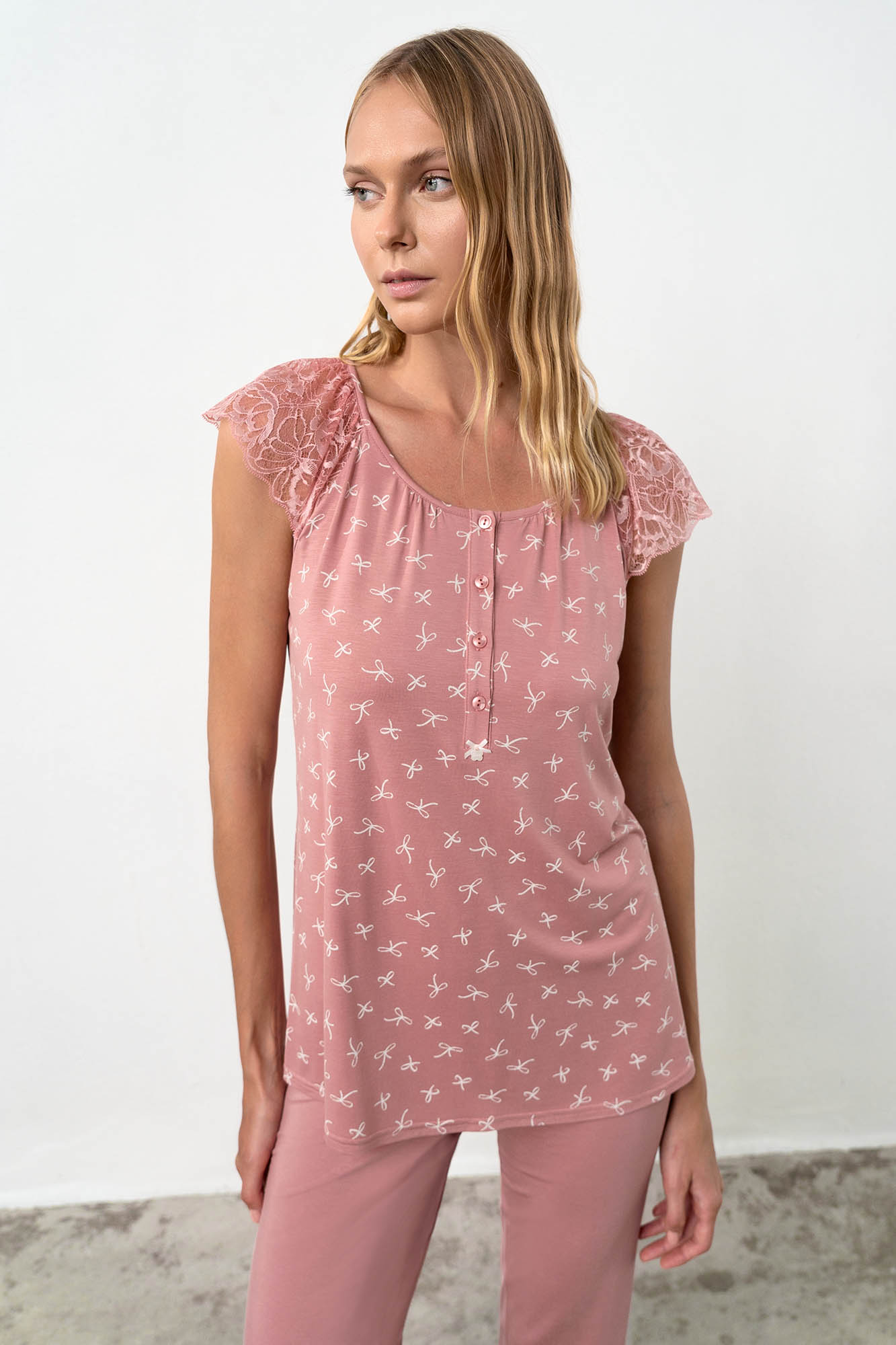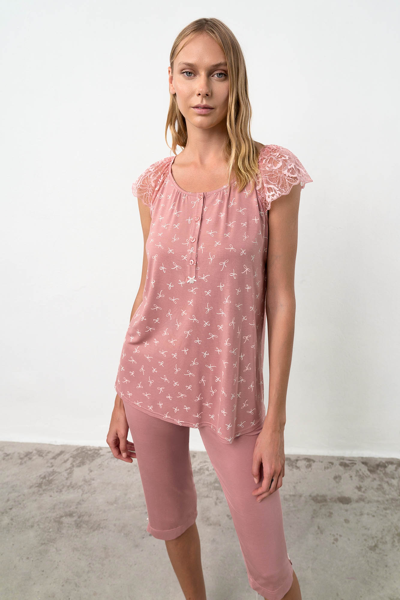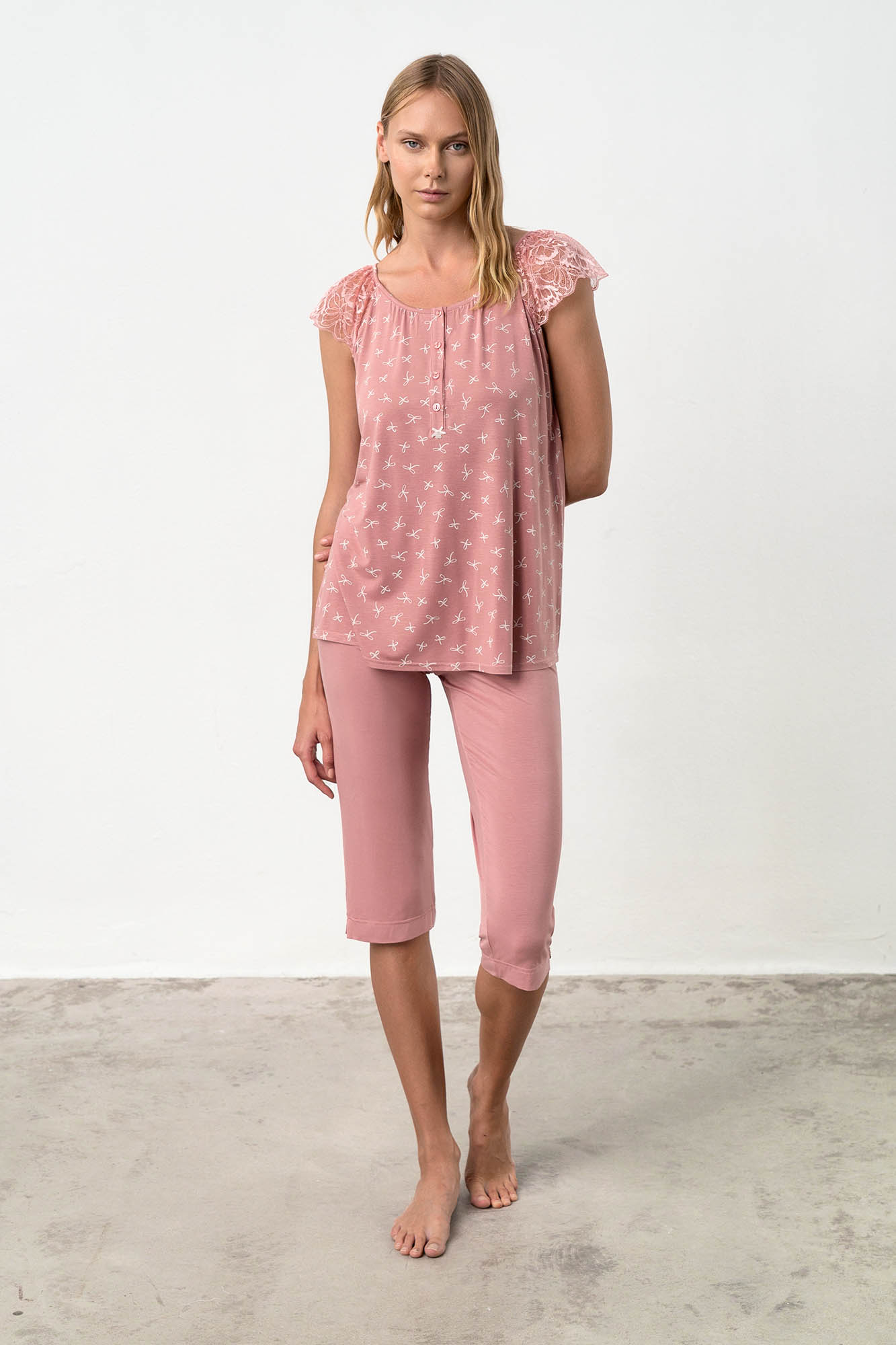 Γυναικεία πυτζάμα με κάπρι παντελόνι, πατιλέτα και κοντό μανίκι από δαντέλα. Ένα σχέδιο με ρομαντικό χαρακτήρα
