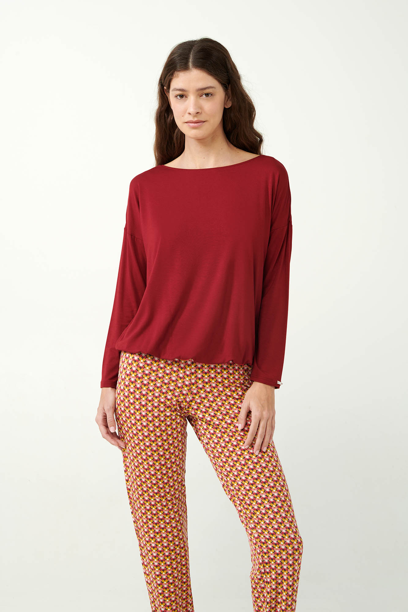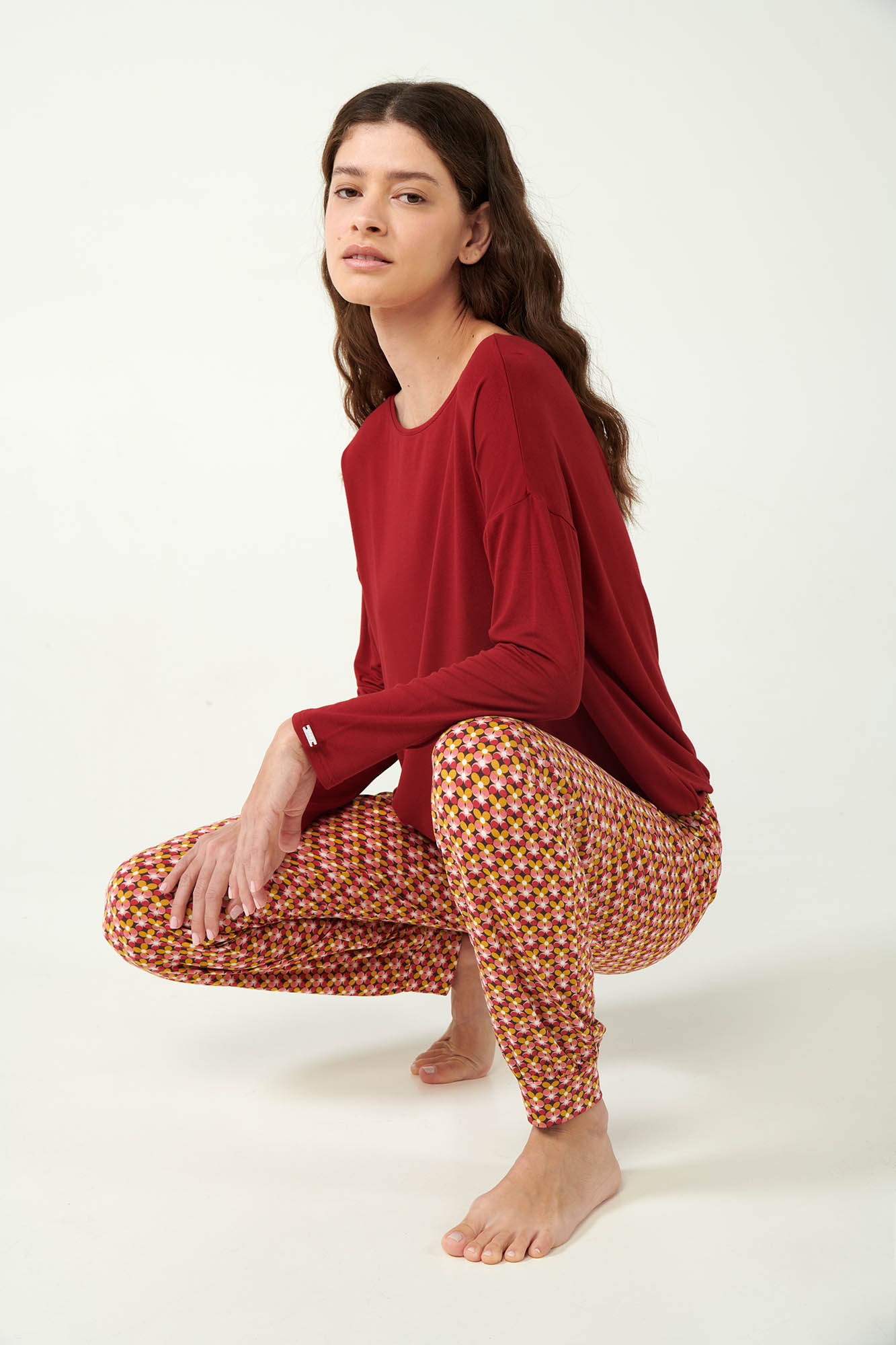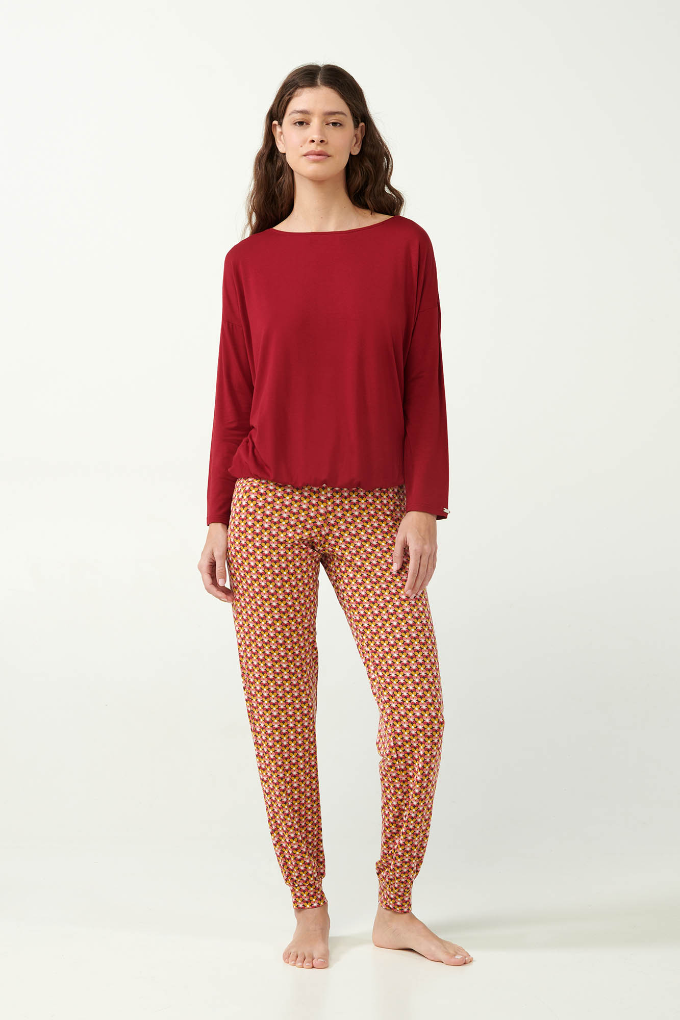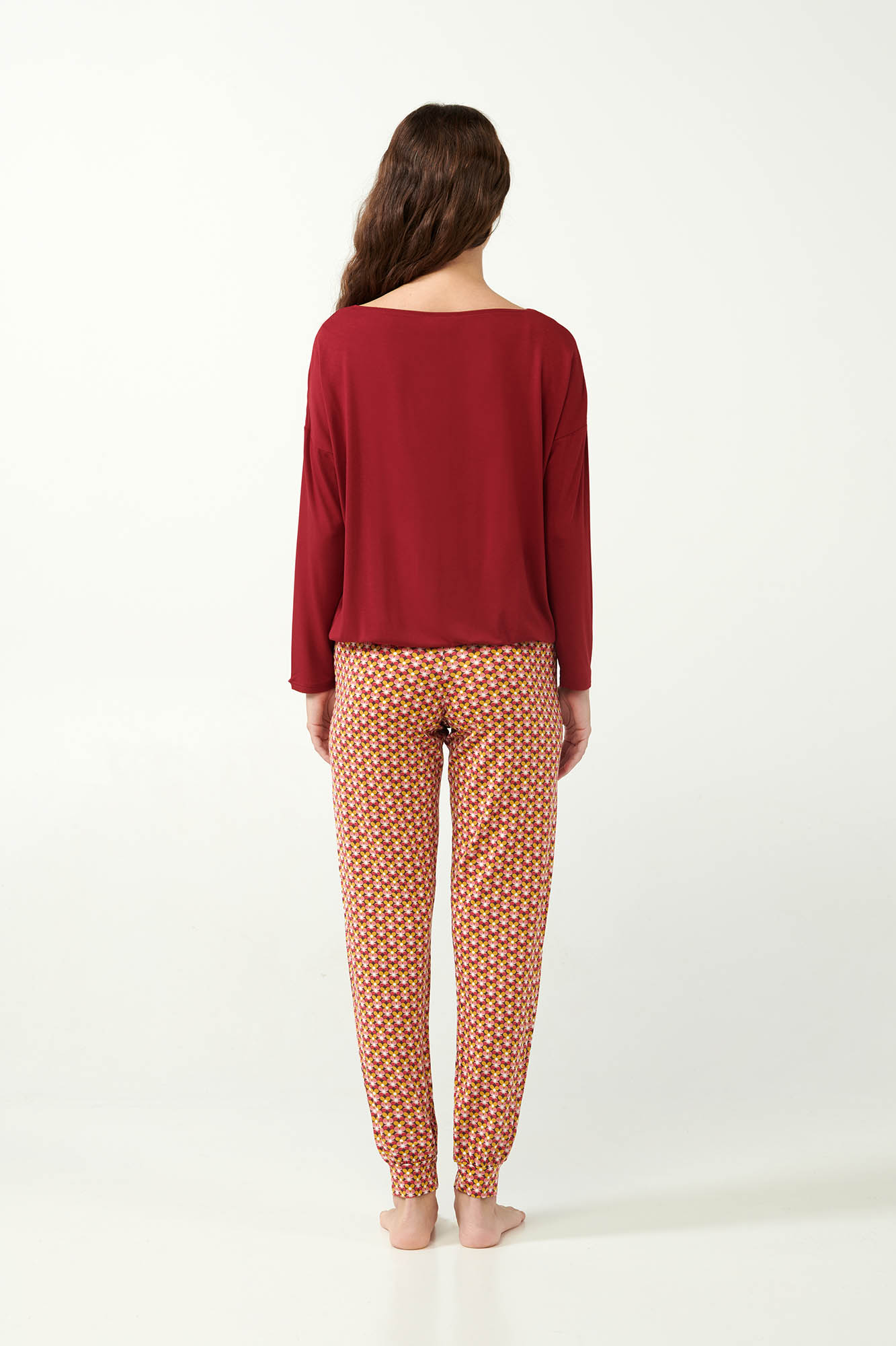 Προσθέστε στη συλλογή σας ένα όμορφο σετ γυναικείες πυτζάμες, που αποτελείται από μονόχρωμη μπλούζα με φαρδιά λαιμόκοψη σε εντυπωσιακή κόκκινη απόχρωση και χαλαρή γραμμή. Το σετ συμπληρώνει ένα παντελόνι με γεωμετρικό φλοράλ μοτίβο και μανσέτες. Κατασκευασμένο από απαλό micromodal που προσφέρει εξαιρετική άνεση και αίσθηση πολυτέλειας. Μια ιδανική επιλογή για να χαλαρώσετε με στυλ έπειτα από μια δύσκολη ημέρα.