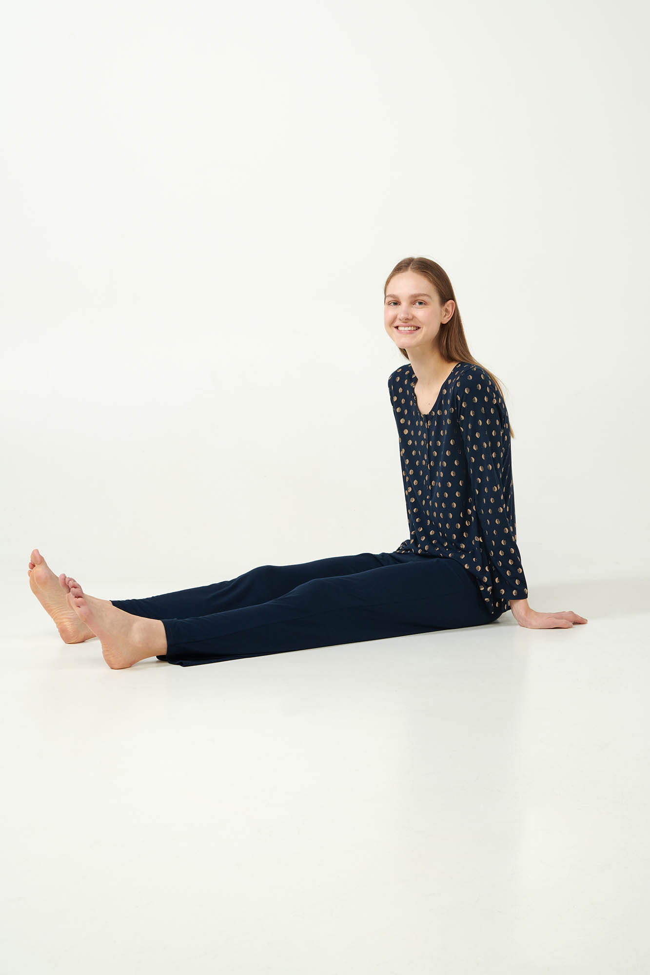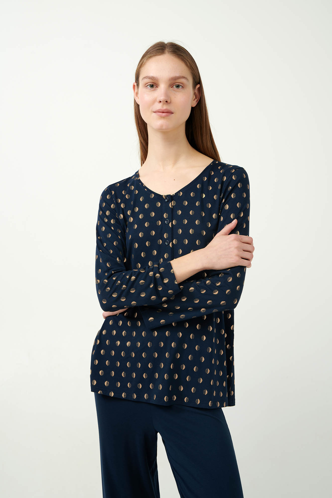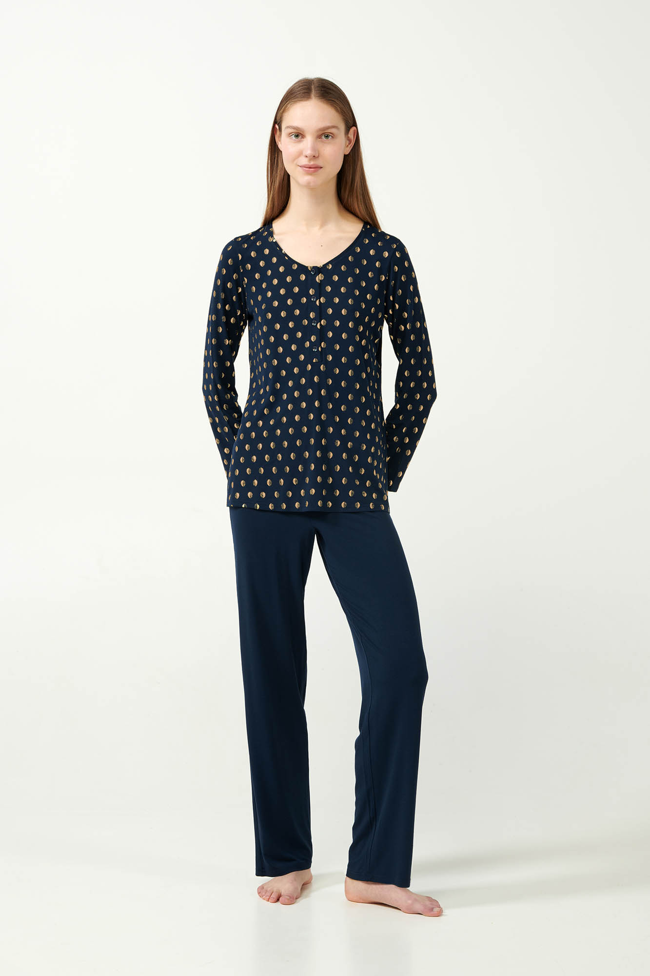 Απολαύστε το τέλειο συνδυασμό κομψότητας και άνεσης με αυτό το σετ γυναικείες πυτζάμες. Η μπλούζα διαθέτει ένα κομψό χρυσό μοτίβο και κλασική πατιλέτα, που συνδυάζεται άψογα με μονόχρωμο παντελόνι για ένα αρμονικό σύνολο. Κατασκευασμένες σε χαλαρή γραμμή, από υψηλής ποιότητας micromodal που επιτρέπει στο σώμα να αναπνέει και ιδιαίτερα απαλό άγγιγμα που εξασφαλίζει έναν άνετο ύπνο. Μια κομψή και πολυτελής προσθήκη στη γκαρνταρόμπα σας.