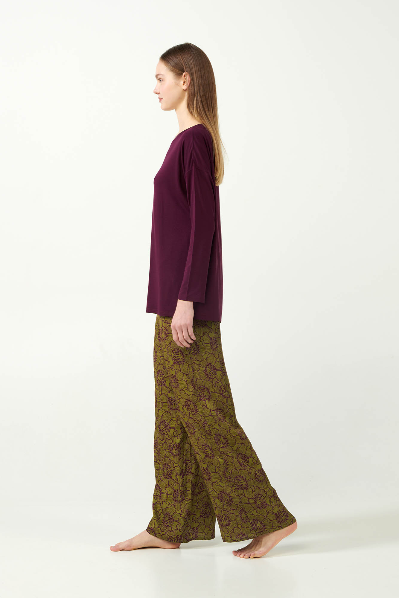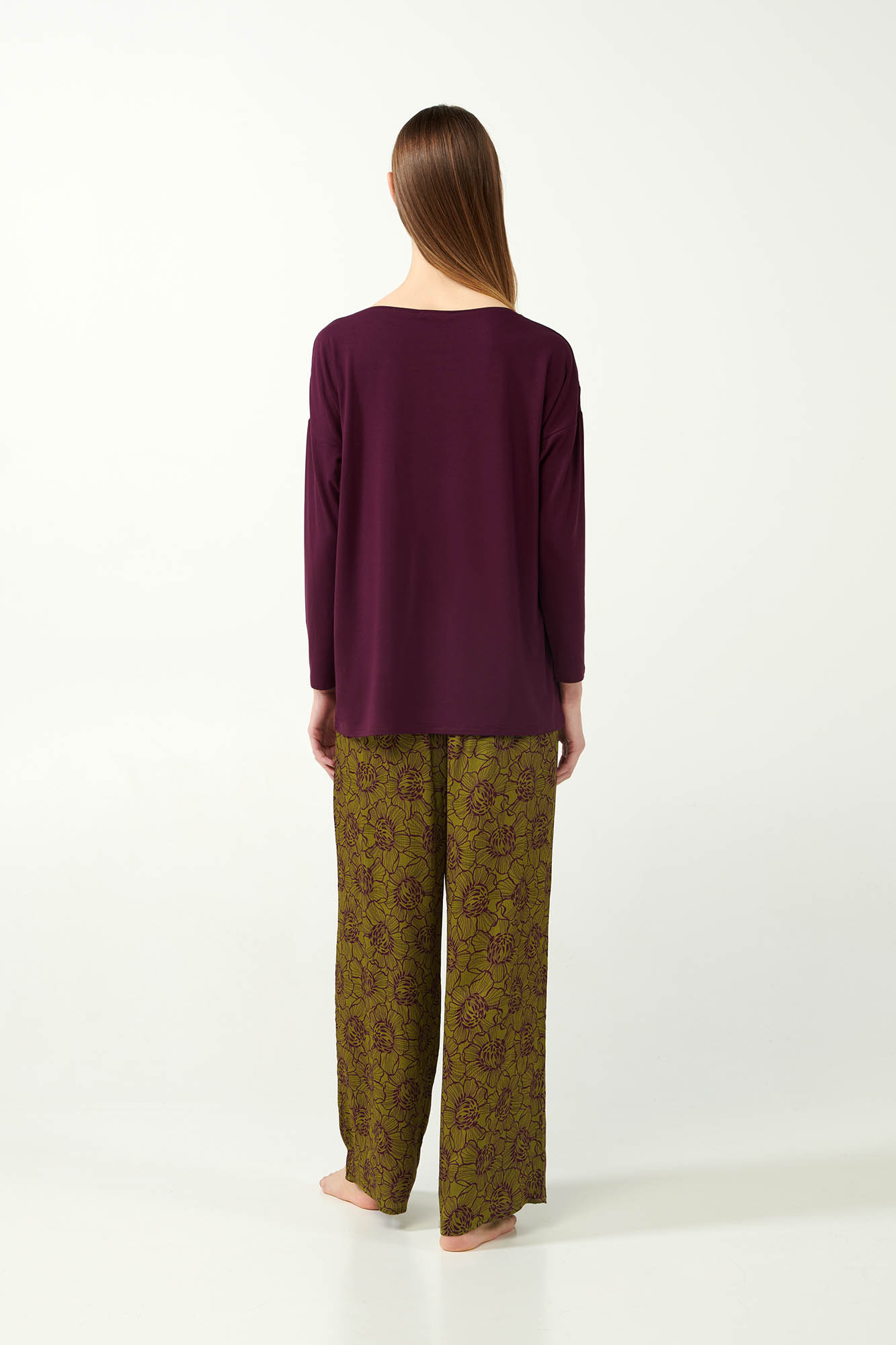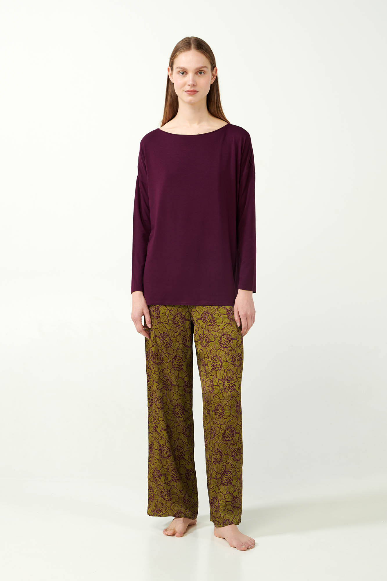 Αυτό το γυναικείο σετ πιτζάμας συνδυάζει ένα μονόχρωμο βιολετί τοπ με ένα φαρδύ παντελόνι, με πολυτελές δίχρωμο φλοράλ μοτίβο με ανεμώνες. Το παντελόνι φτιαγμένο από σταθερή viscose twill προσφέρει χαλαρή και κομψή εφαρμογή. Το μονόχρωμο πάνω μέρος δημιουργεί μια αρμονική αντίθεση κάνοντας το σύνολο μια ιδανική πρόταση που θα ανανεώσει τη συλλογή σας.