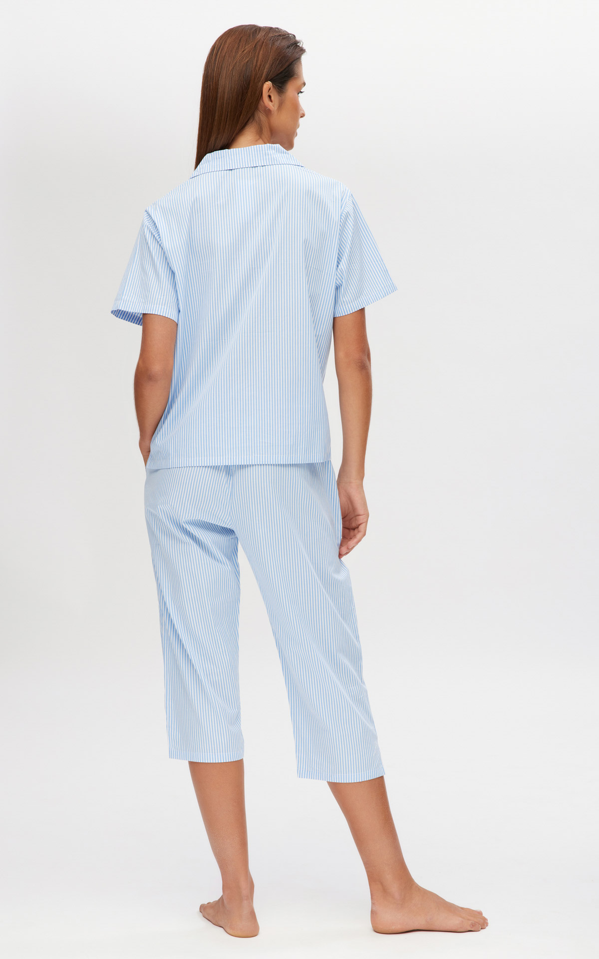 Σετ πυζάμας από 100% βαμβακερή ποπλίνα, ριγέ τυπωμένη. Το σετ αποτελείται από κοντομάνικο κουμπωτό σακάκι με πέτο & γιακά, και παντελόνι capri. Το προϊόν έχει στενή εφαρμογή. Εάν είστε μεταξύ 2 μεγεθών προτιμίστε το μεγαλύτερο. (Ciel-white stripe)