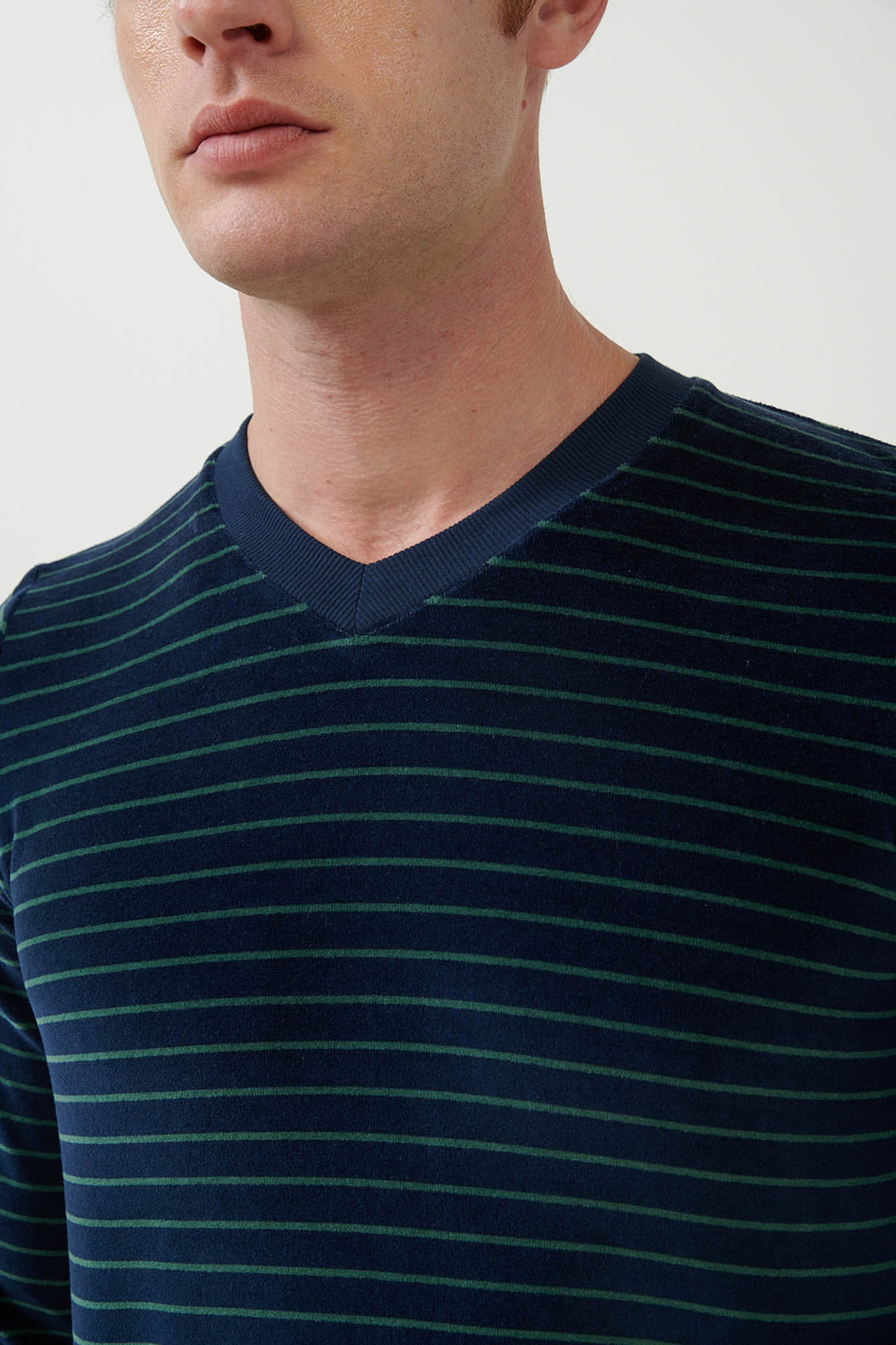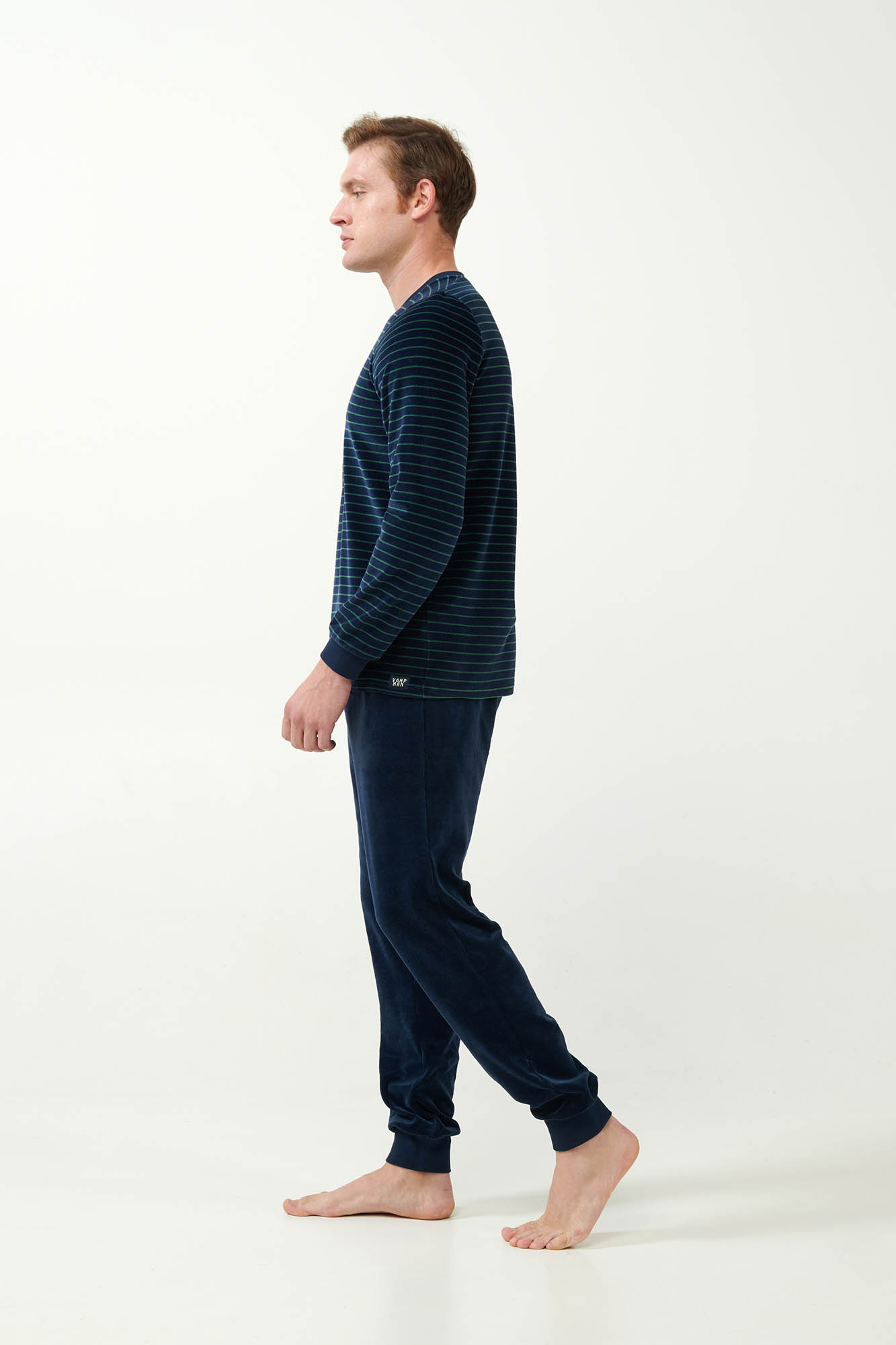 Παραμείνετε άνετος με διαχρονικό στυλ επιλέγοντας ένα σετ ανδρικές πυτζάμες που αποτελείτε από μονόχρωμο παντελόνι με μανσέτες και ριγέ μπλούζα με λαιμόκοψη V και μανσέτες στα μανίκια. Κατασκευασμένο από πλούσιο σε βαμβάκι βελούδο θα σας κρατήσει ζεστούς προσφέροντας απαλή αίσθηση στο σώμα. Ένας όμορφος συνδυασμός κομψότητας και άνεσης που θα εκτιμήσετε τους πιο κρύους μήνες χαλαρώνοντας στο καναπέ σας.