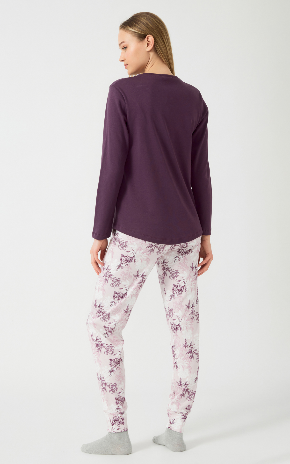 Χειμερινή πυζάμα από 100% βαμβακερό ίντερλοκ ύφασμα, υψηλής ποιότητος. Το σετ περιλαμβάνει μπλούζα μακρυμάνικη με τύπωμα στο στήθος και παντελόνι με εμπριμέ τύπωμα, floral και μπάσκες στα τελειώματα. (Μελιτζανι)