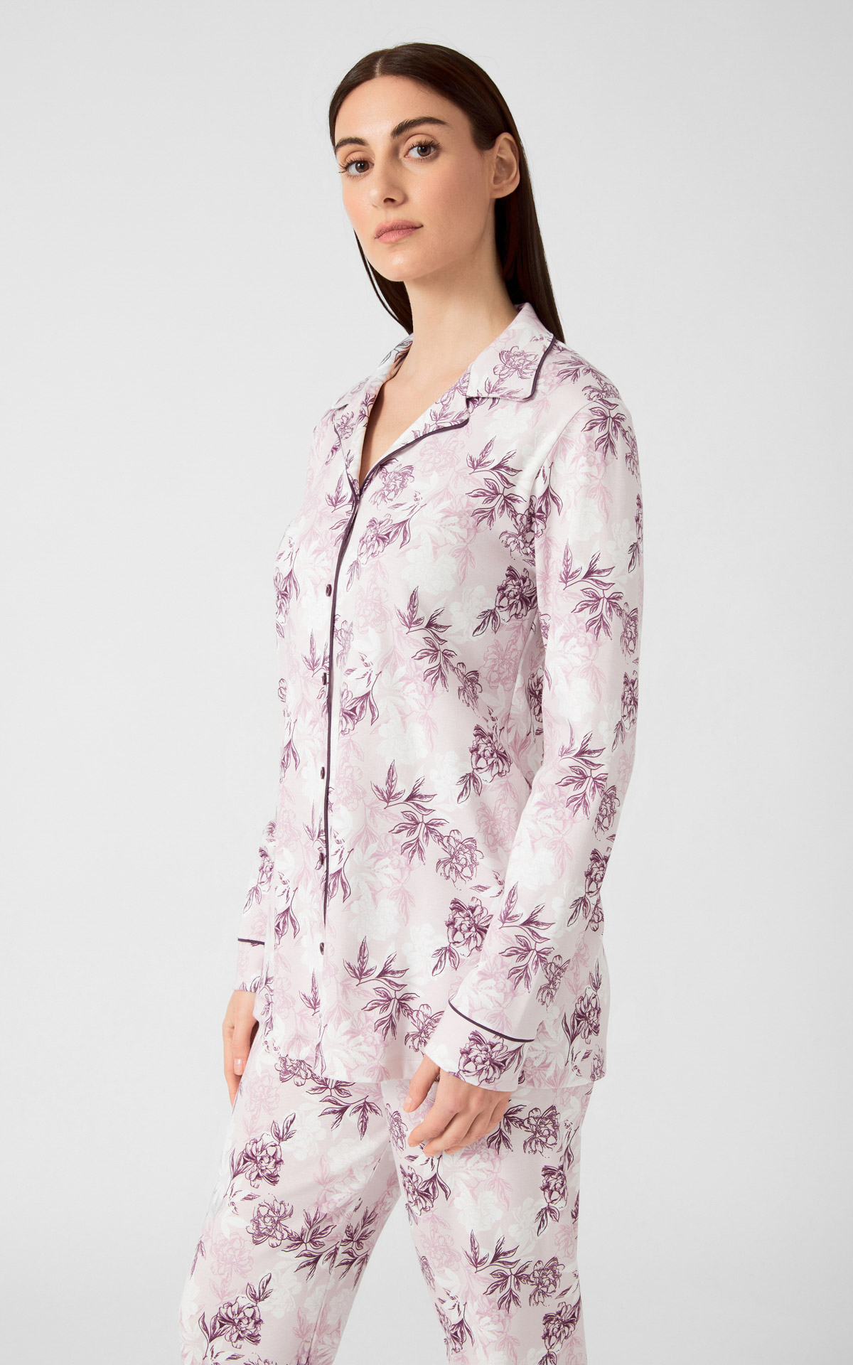 Xειμερινή πυζάμα από 100% βαμβακερό ιντερλόκ ύφασμα, τυπωμένο all over, υψηλής ποιότητος. Το σετ περιλαμβάνει μπλούζα μακρυμάνικη σε ίσια γραμμή με πέτο γιακά, κουμπιά, κοντράστ ρέλια και παντελόνι μακρύ ίσιο. (Pink-plum floral)