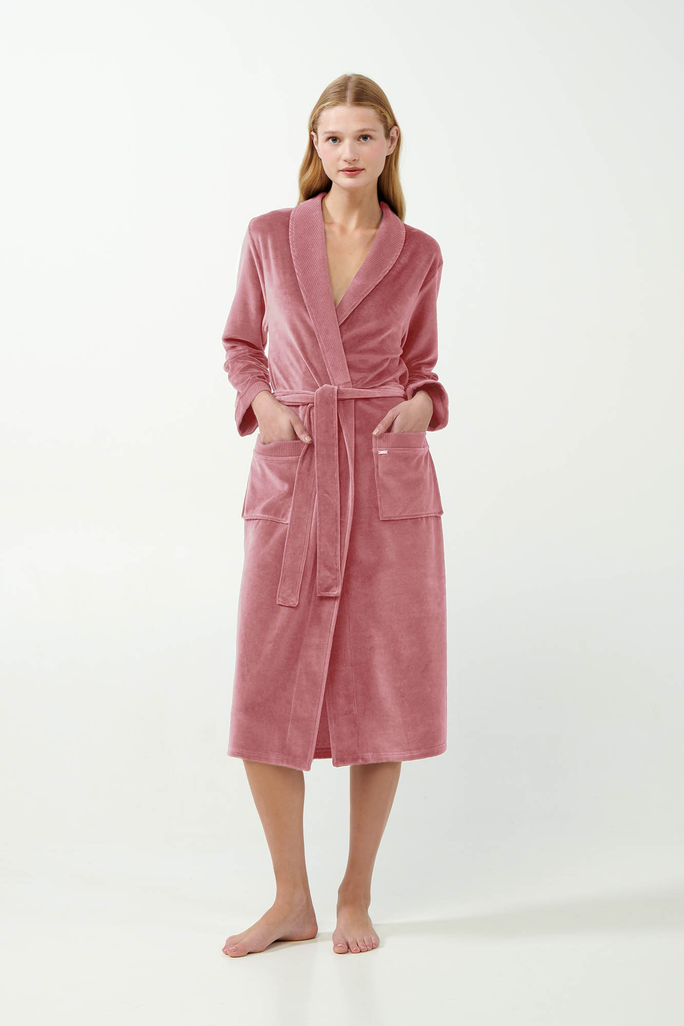 Αφεθείτε στη πολυτέλεια που σας προσφέρει μια μονόχρωμη μακριά γυναικεία ρόμπα από πλούσιο σε βαμβάκι βελούδο. Σχεδιασμένη σε κλασικό σταυρωτό πατρόν με ζώνη και πρακτικές τσέπες στο πλάι. Το rib πέτο προσθέτει μια νότα κομψότητας κάνοντας τη ιδανική για χαλαρές στιγμές στο σπίτι. Φορέστε τη ρόμπα σας κλείνοντας την με την άνετη μακριά ζώνη της ή ανοιχτή για πιο ανάλαφρο στυλ και συμπληρώστε το σύνολο σας.