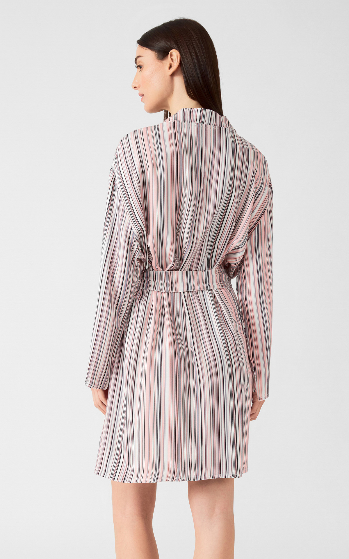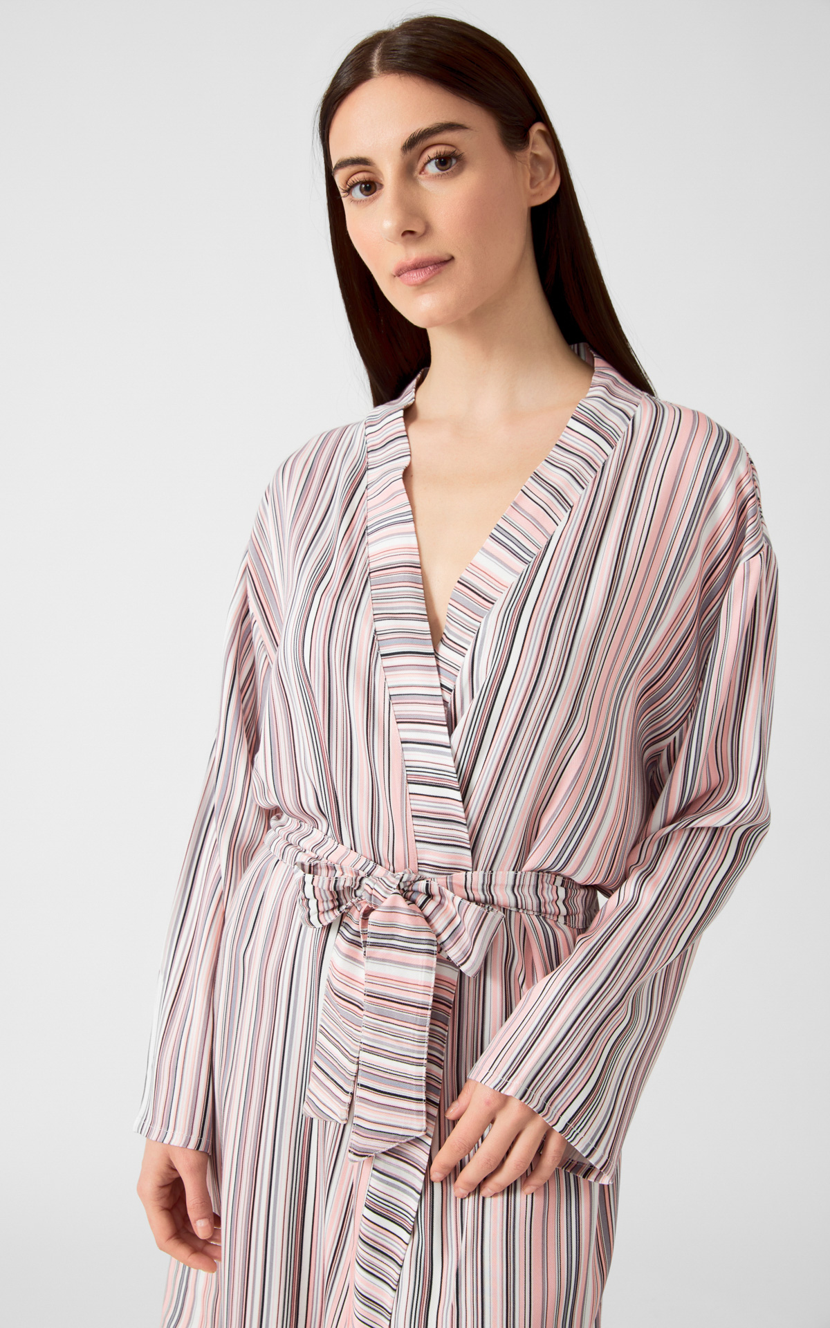 Ρόμπα ριγέ τυπωμένη από 100% viscose, υψηλής ποιότητος, με μήκος πάνω από το γόνατο. Συνδυάστε τη με την ίδια πυζάμα ή παντελόνι για ένα πιο ολοκληρωμένο και κομψό σύνολο. (Pink stripe)