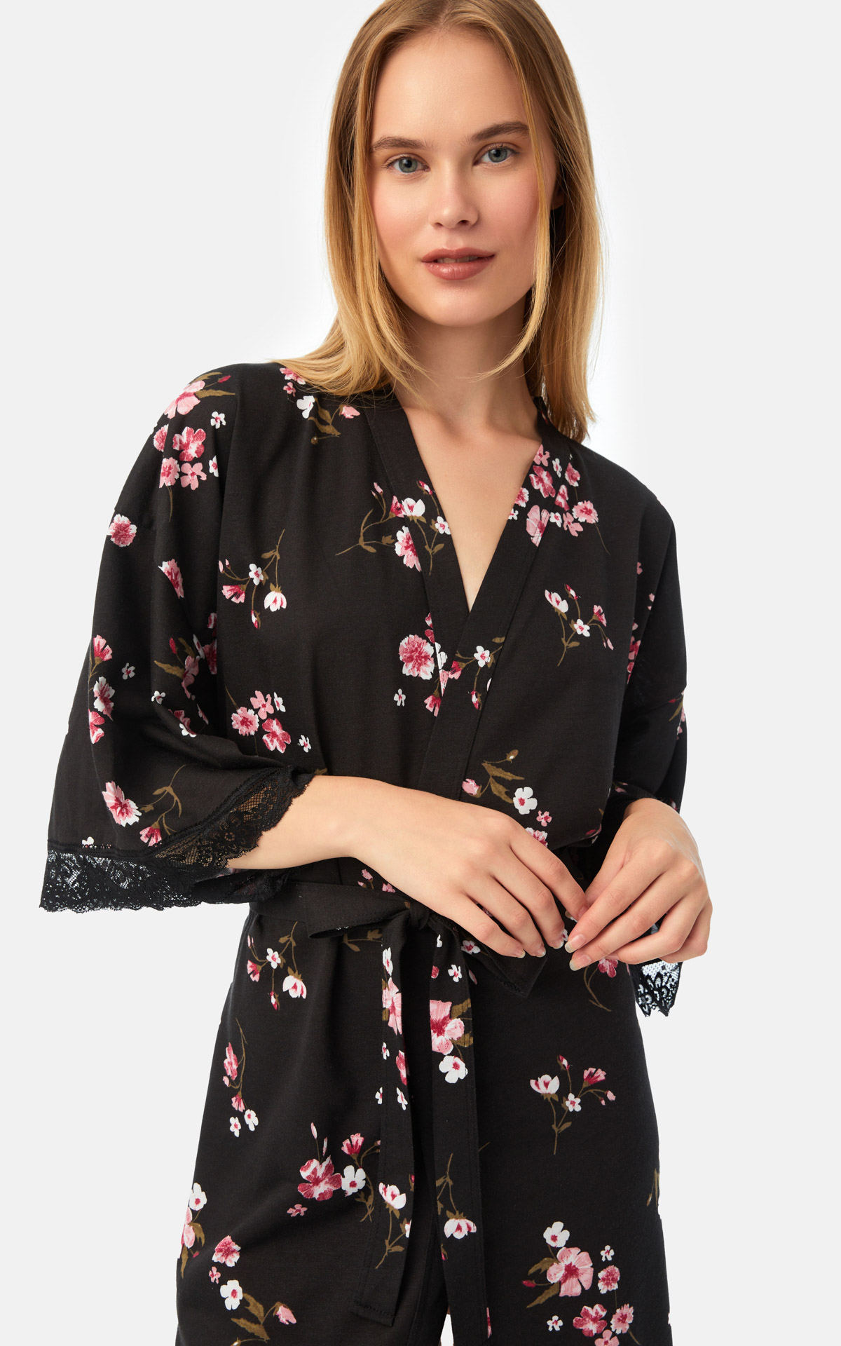 Ρόμπα κιμονό, από 50% Βαμβάκι & 50% TENCEL™ Modal, εξαιρετικής ποιότητας, τυπωμένη all over, με δαντέλα στο τελείωμα από τα μανίκια. Μπορείτε να τη συνδυάσετε με τις ασορτί μονόχρωμες και εμπριμέ πυζάμες και νυχτικιές, της ίδιας συλλογής. (Black-pink floral)