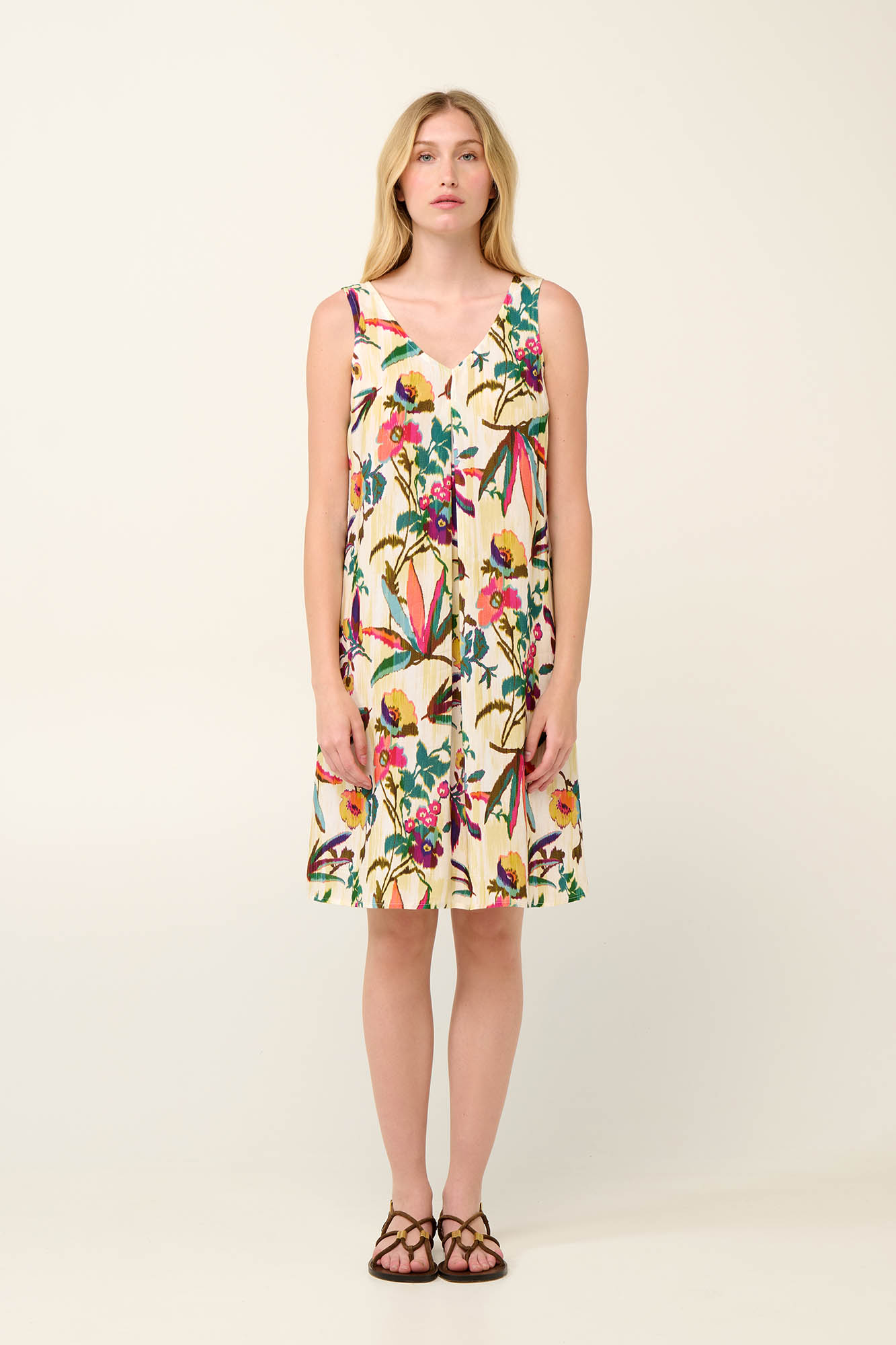 Απογειώστε την εμφάνιση σας με ένα αμάνικο καλοκαιρινό φόρεμα, διακοσμημένο με ζωηρό τροπικό φλοράλ μοτίβο σε γήινες αποχρώσεις. Κατασκευασμένο από ανάφρη viscose ποπλίνα, προσφέρει απαλή υφή και δροσερή αίσθηση. Η άνετη Α γραμμή αναδεικνύεται με μία πιέτα στο μπροστινό μέρος που προσθέτει κίνηση και κομψότητα σε κάθε βήμα. Σχεδιασμένο με κολακευτική V λαιμόκοψη, είναι ιδανικό για ζεστές ημέρες στη παραλία ή βόλτες στην πόλη.
