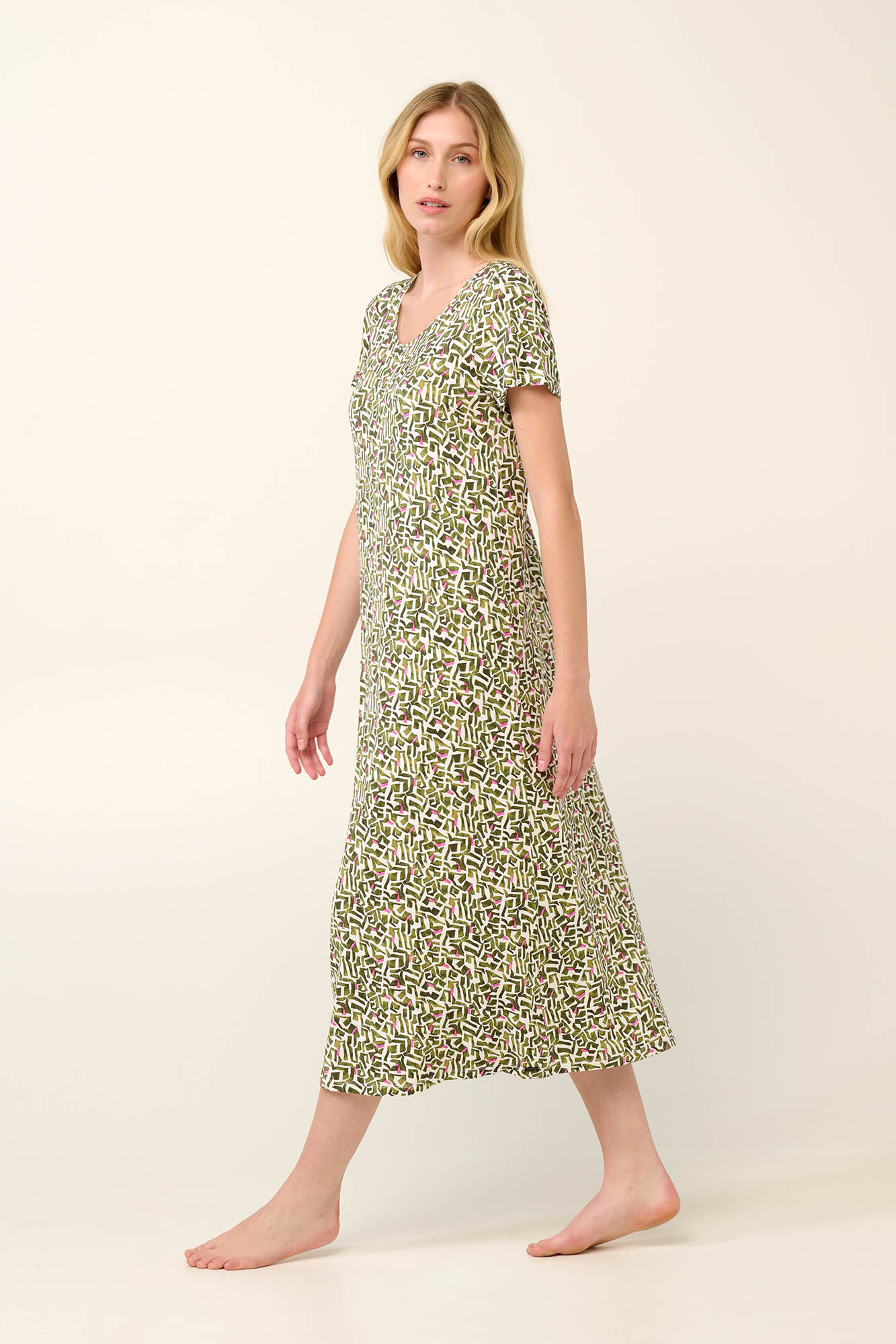 Προσθέστε στη συλλογή σας ένα αέρινο μακρύ καλοκαιρινό νυχτικό σε γεωμετρικό μοτίβο. Σχεδιασμένο με κοντό μανίκι και κολακευτική λαιμόκοψη V σε χαλαρή γραμμή για άνετη εφαρμογή. Είναι κατασκευασμένο από απαλό ύφασμα micromodal που επιτρέπει στο δέρμα να αναπνέει και χαρίζει απαλή σα μετάξι αίσθηση στο σώμα. Μια πρόταση με διαχρονικό χαρακτήρα που θα απολαύσετε κάθε σας στιγμή στο σπίτι.