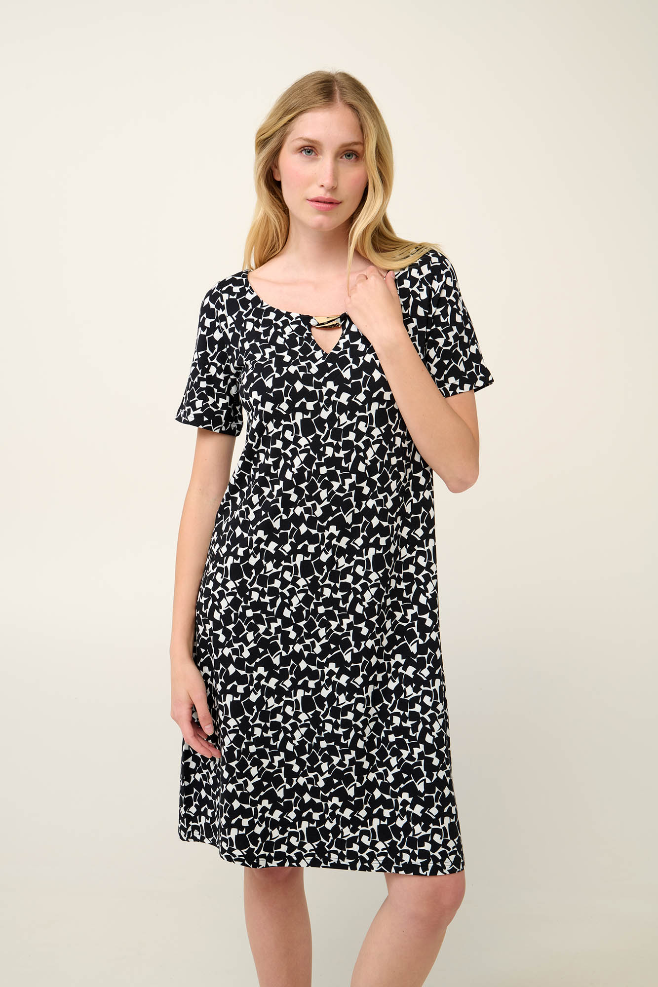 Απολαύστε τη κομψότητα που σας χαρίζει αυτό το καλοκαιρινό φόρεμα σε ασπρόμαυρο αφηρημένο μοτίβο, κατασκευασμένο από απαλή και ελαστική viscose που προσφέρει απόλυτη άνεση. Η χαλαρή γραμμή του κολακεύει κάθε σιλουέτα, ενώ τα κοντά μανίκια προσφέρουν μια αίσθηση ελευθερίας και δροσιάς. Η μοναδική λαιμόκοψη με μεταλλική λεπτομέρεια προσδίδει ιδιαίτερο χαρακτήρα, καθιστώντας το ιδανικό για κάθε περίσταση, από casual εμφανίσεις μέχρι χαλαρές βραδινές εξόδους.