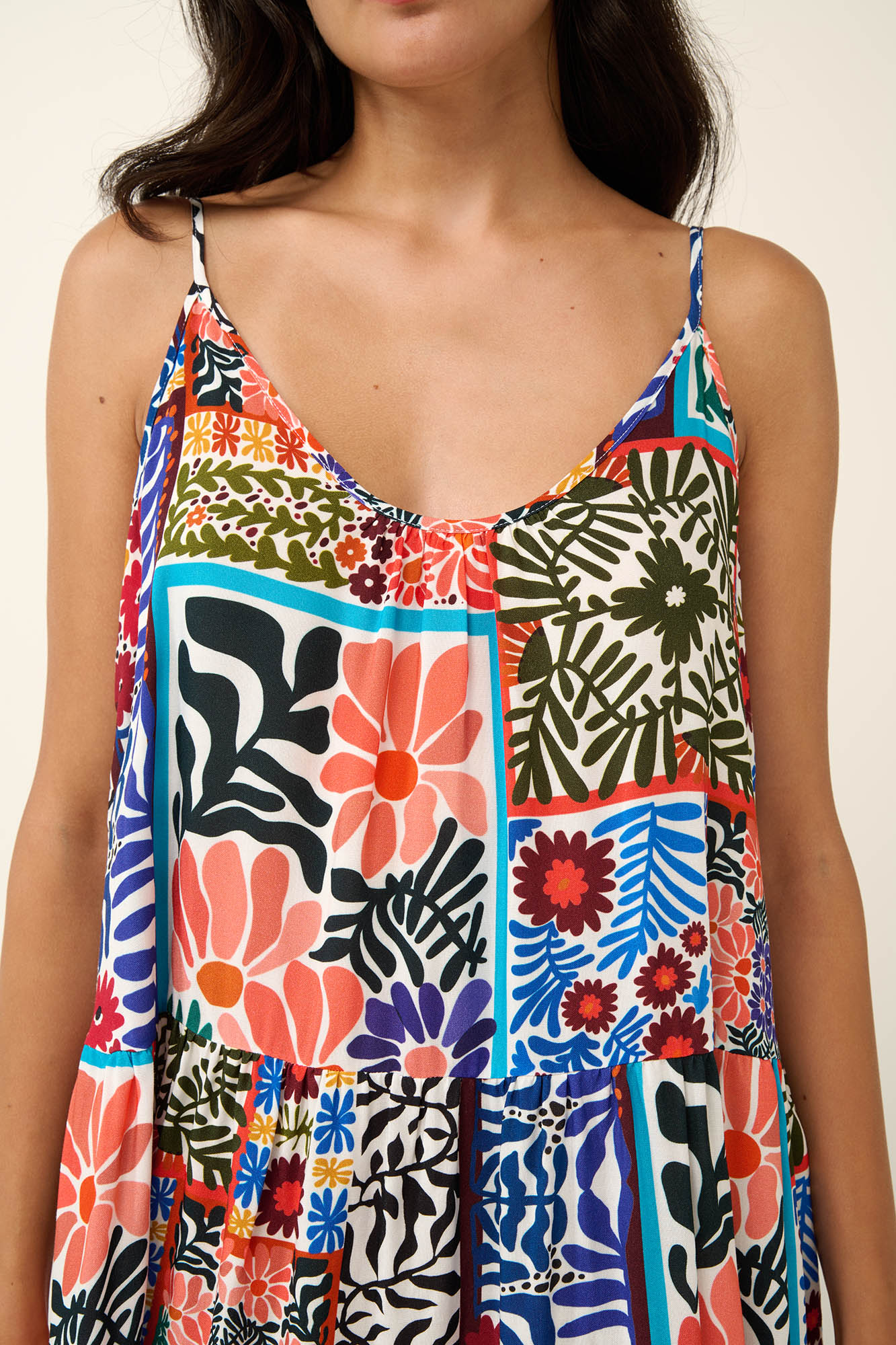 Επιλέξτε ένα ελαφρύ και αέρινο καλοκαιρινό φόρεμα σε μοτίβο εμπνευσμένο από την βραζιλιάνικη τέχνη μωσαϊκών πλακιδίων. Σχεδιασμένο με τιράντες και βαθιά λαιμόκοψη V στο στήθος και τη πλάτη που χαρίζει θηλυκότητα και δροσιά. Κατασκευασμένο σε χαλαρή γραμμή με χυτή εφαρμογή στο σώμα, από απαλή viscose ποπλίνα. Απολαύστε το τις ηλιόλουστες ημέρες των διακοπών σας.