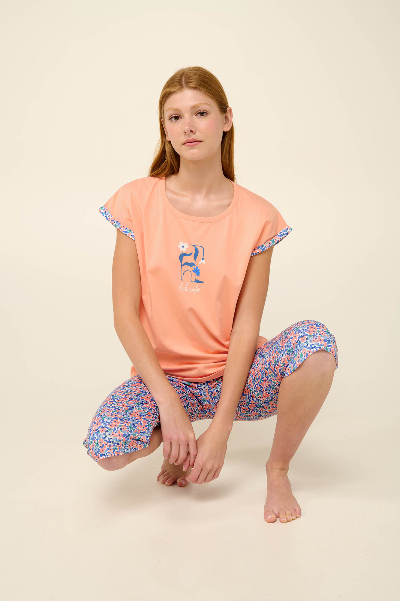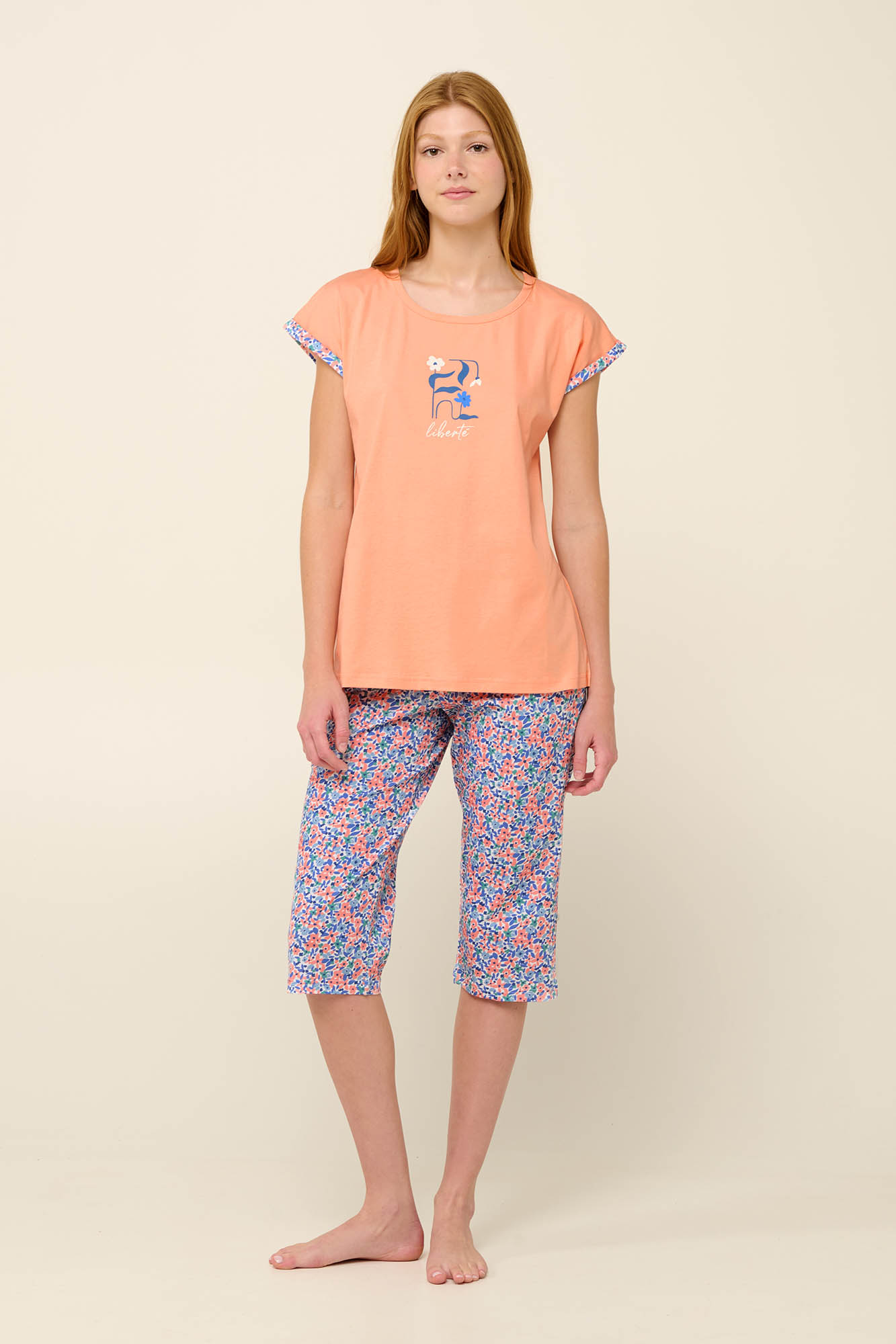Παραμείνετε δροσερή και άνετη με ένα σετ καλοκαιρινές γυναικείες πυτζάμες κατασκευασμένο από 100% βαμβάκι single jersey που επιτρέπει στο δέρμα να αναπνέει . Το σετ αποτελείται από κάπρι παντελόνι σε γοητευτικό παστέλ φλοράλ μοτίβο και μπλούζα με κοντό μανίκι και τύπωμα στο στήθος. Σχεδιασμένο σε κανονική γραμμή για άνετη εφαρμογή θα σας βοηθήσει να απολαύσετε τις στιγμές χαλάρωσης σας και το βραδινό σας ύπνο.