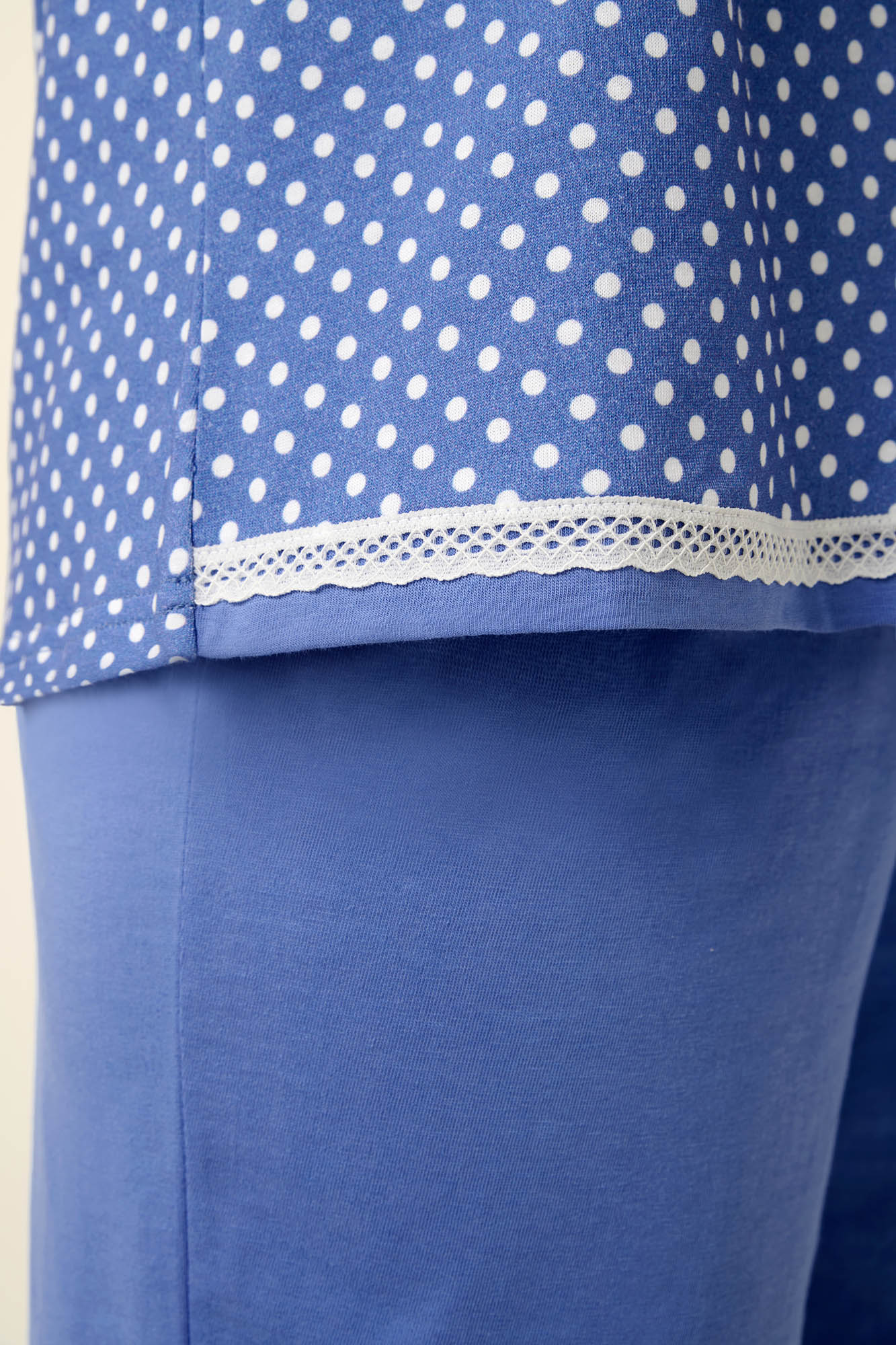 Παραμείνετε δροσερή με ένα ανάλαφρο σετ καλοκαιρινές γυναικείες πυτζάμες που αποτελείται από μονόχρωμο κοντό παντελόνι και αμάνικο τοπ σε γαλάζιο πουά μοτίβο. Σχεδιασμένο σε κανονική γραμμή με πατιλέτα και διακοσμημένο με δαντέλα στο κάτω μέρος. Είναι κατασκευασμένο από 100% βαμβάκι single jersey που προσφέρει απαλότητα και επιτρέπει στο σώμα να αναπνέει. Μια ιδανική πρόταση για χαλάρωση όλο το καλοκαίρι.