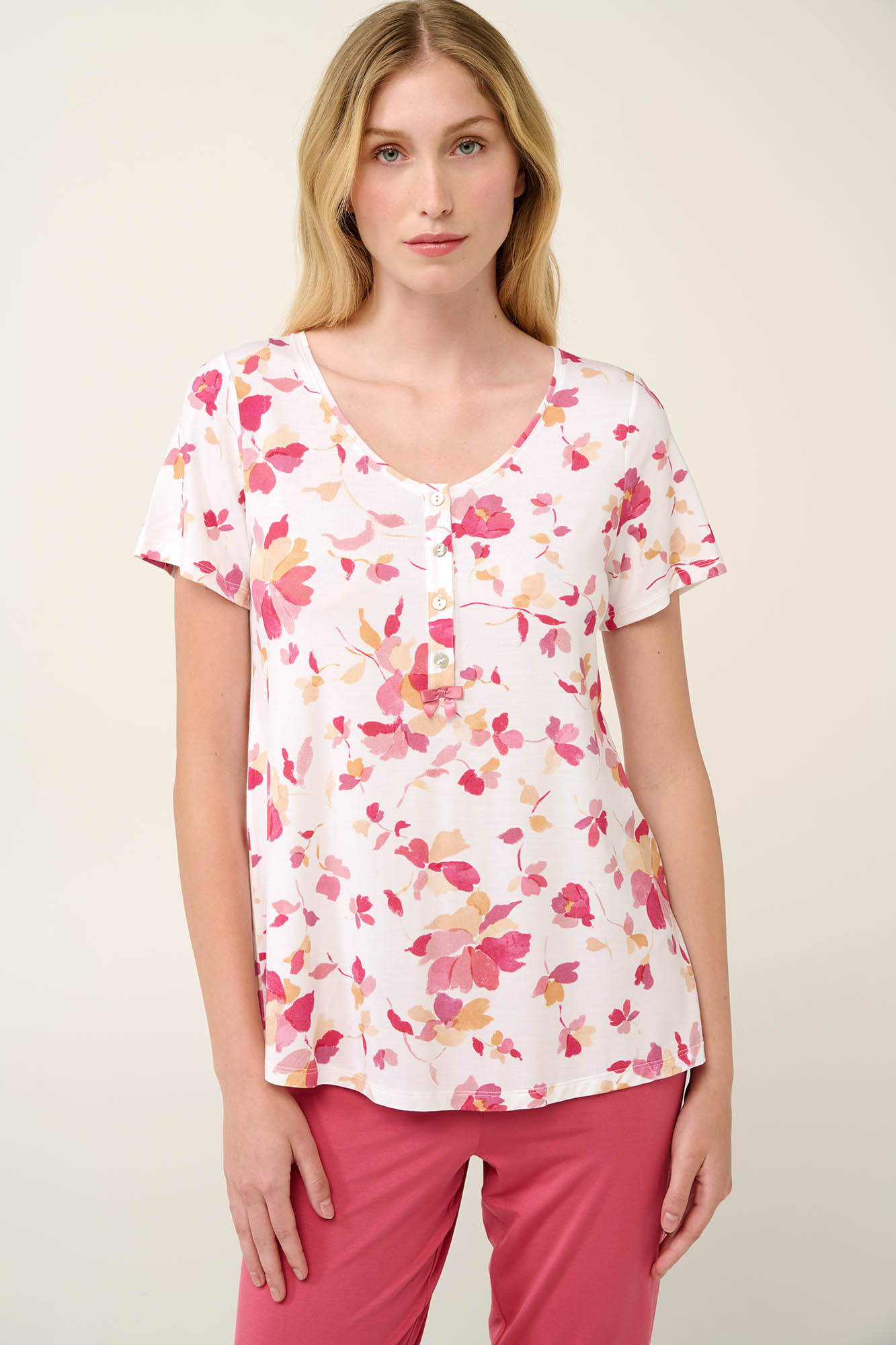 Αφεθείτε στην άνεση που σας προσφέρει ένα σετ καλοκαιρινές γυναικείες πυτζάμες. Αποτελείται από ροζ κάπρι παντελόνι και λευκή μπλούζα με κοντό μανίκι και πατιλέτα σε παστέλ φλοράλ μοτίβο. Φτιαγμένο από διαπνέον micromodal χαρίζει απαλή σα μετάξι αίσθηση στο σώμα και είναι σχεδιασμένο σε κανονική γραμμή για ανάλαφρη εφαρμογή. Απολαύσετε ένα χαλαρό απόγευμα στο καναπέ ή το βραδινό σας ύπνο με άνεση και ρομαντική διάθεση.