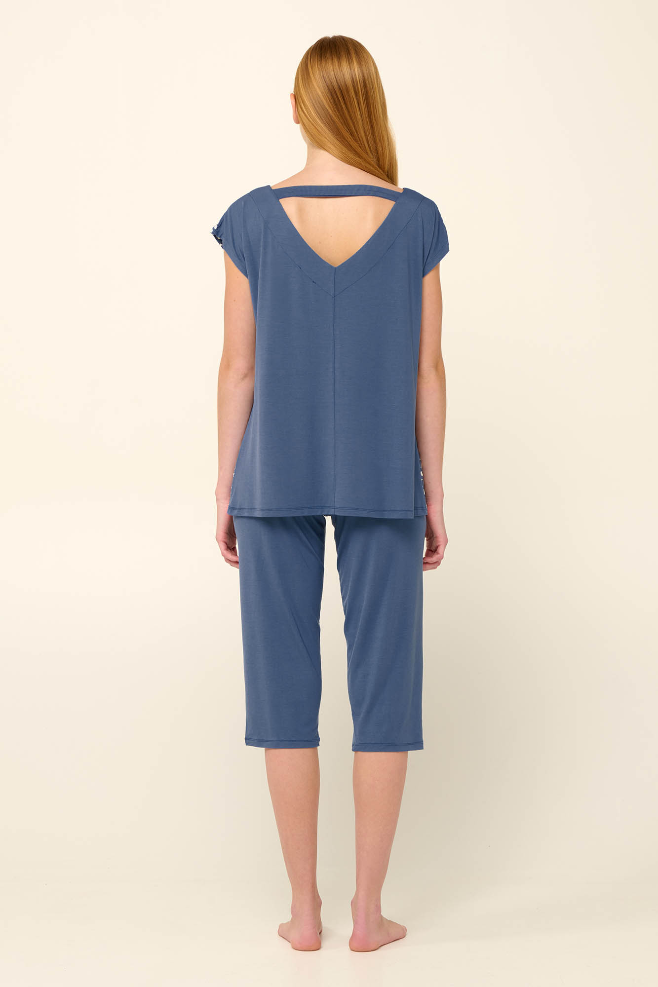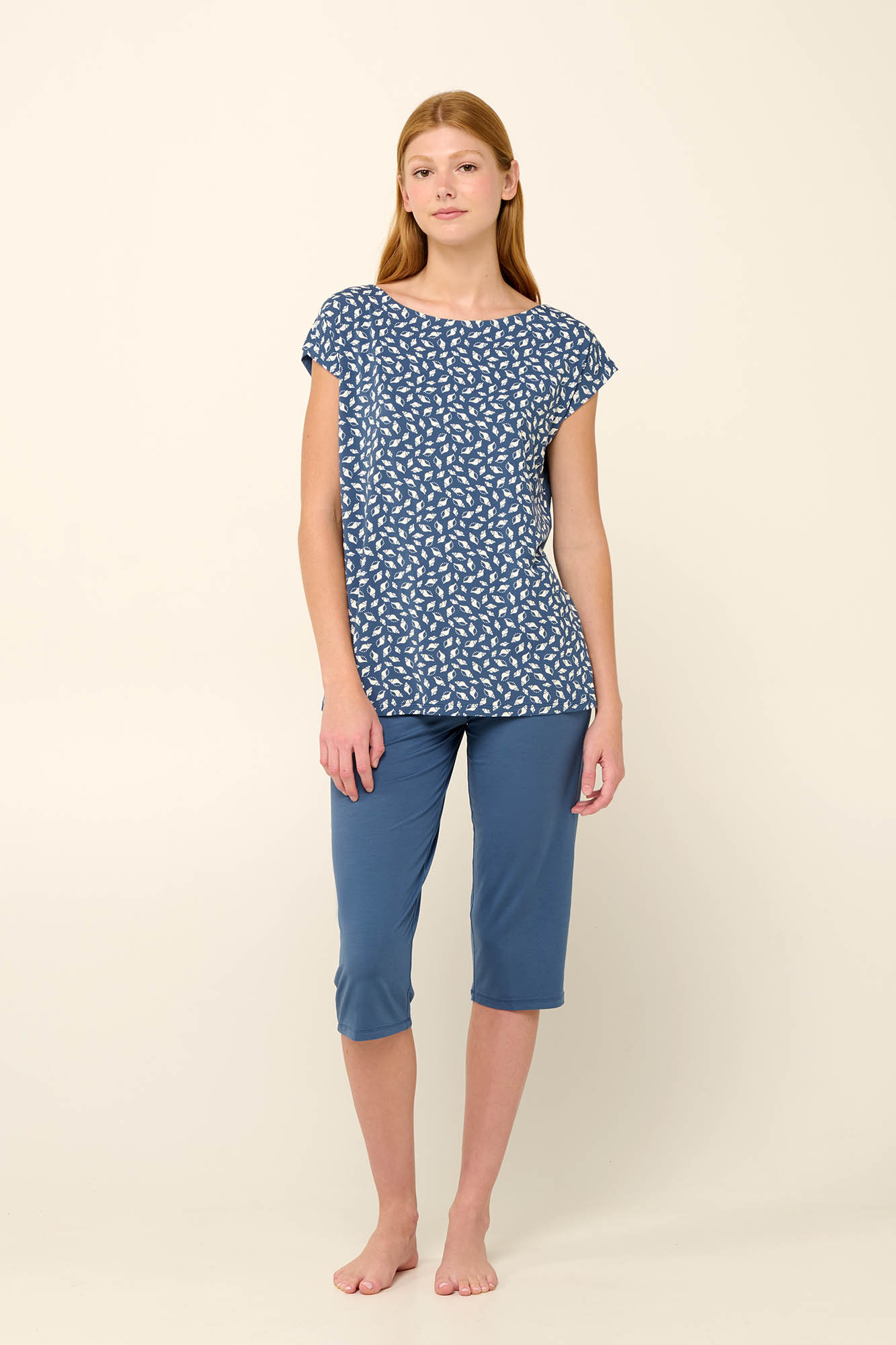 Βυθιστείτε στην άνεση με ένα σετ καλοκαιρινές γυναικείες πυτζάμες σε μπλε αποχρώσεις. Αποτελείται από μονόχρωμο κάπρι παντελόνι που συνοδεύεται από μπλούζα με τύπωμα κοχύλια στο μπροστινό μέρος και κοντό μανίκι. Σχεδιασμένο σε κανονική γραμμή και κατασκευασμένο από απαλό micromodal που επιτρέπει στο σώμα να αναπνέει, προσφέρει ανάλαφρη αίσθηση που θυμίζει θάλασσα και καλοκαιρινές διακοπές.