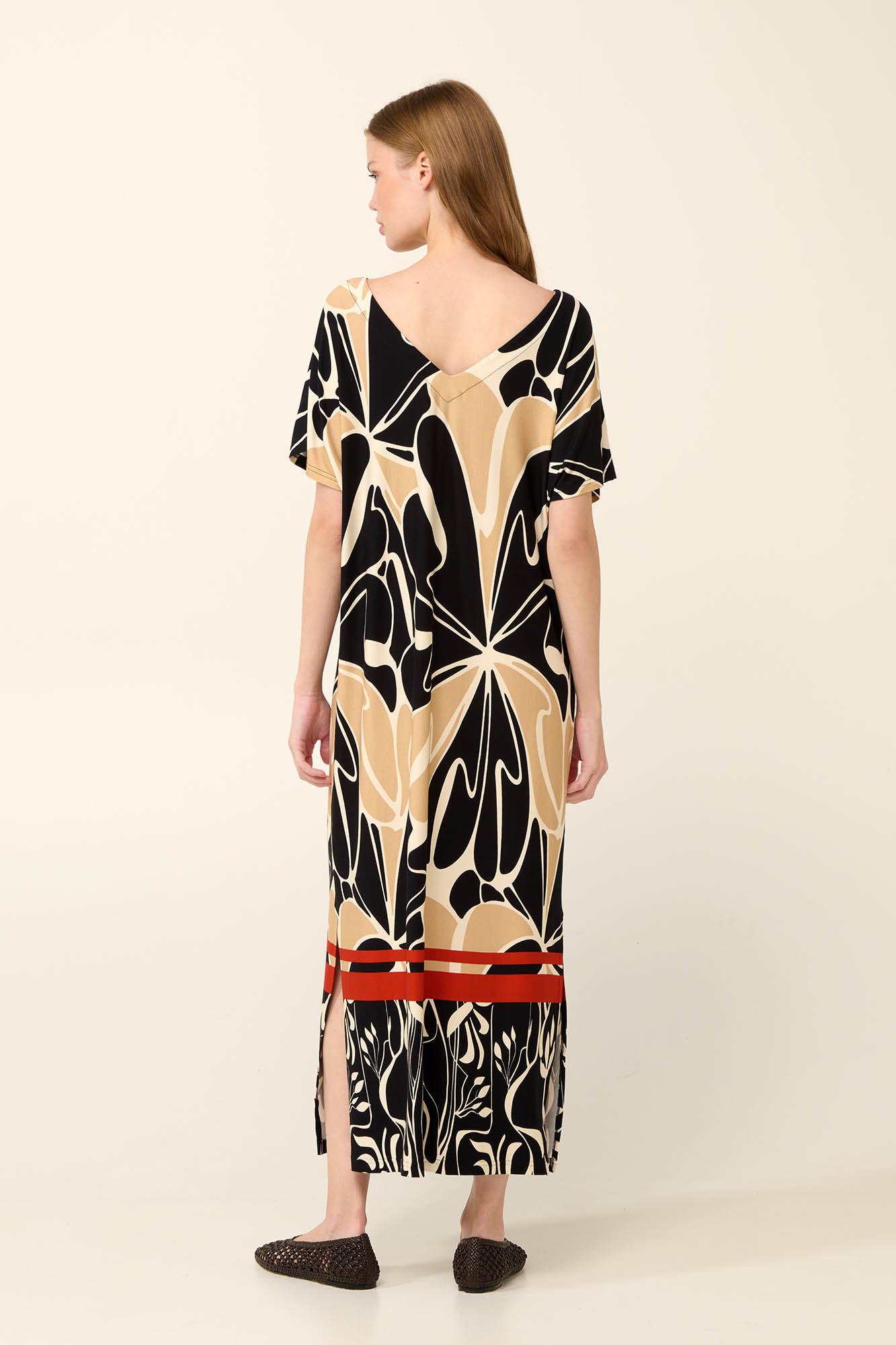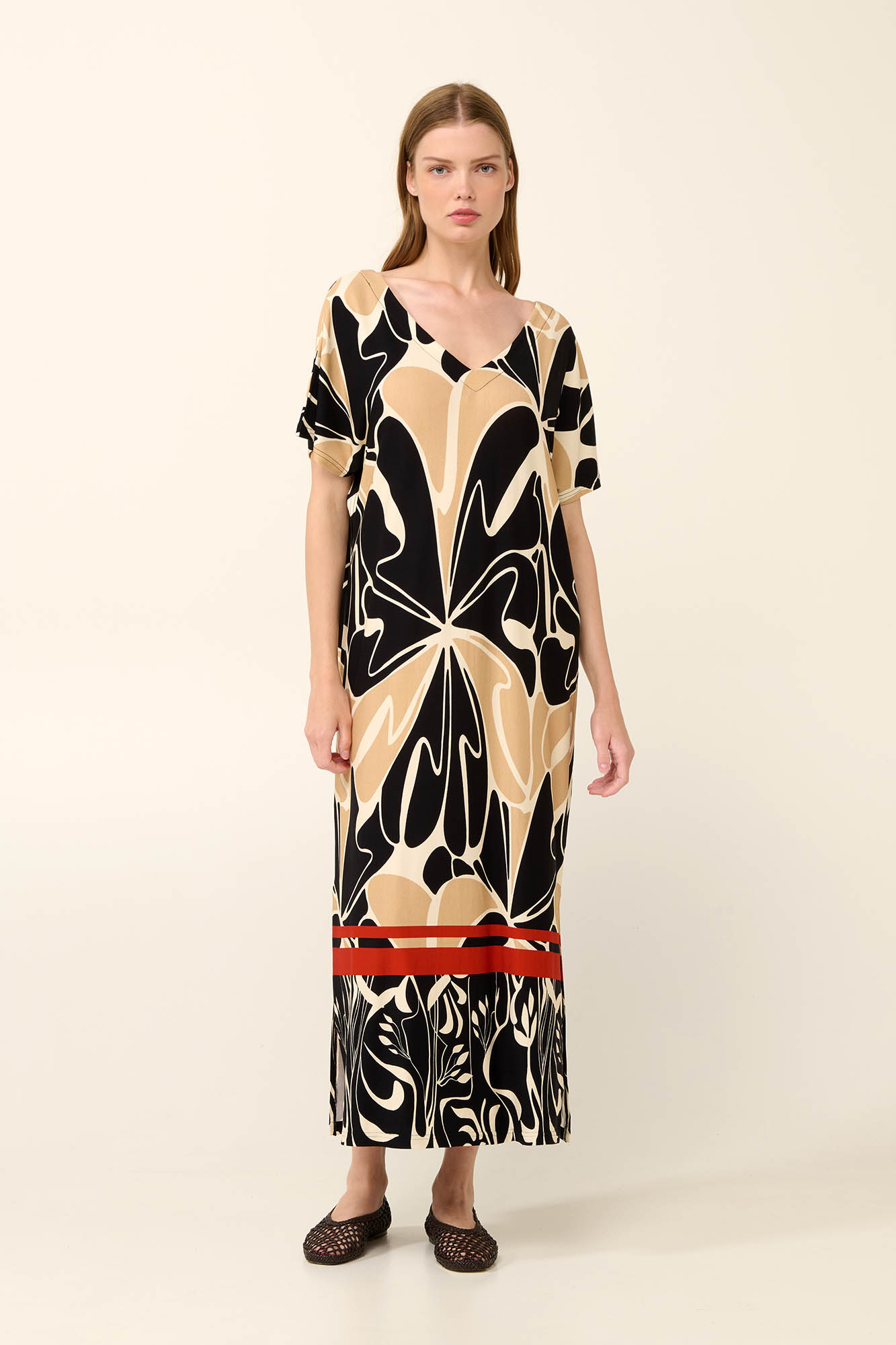 Επιλέξτε ένα κομψό καφτάνι σε μοτίβο με ζωγραφισμένα λουλούδια, , ιδανικό για τις ζεστές καλοκαιρινές ημέρες. Φτιαγμένο από απαλή και δροσερή viscose, διαθέτει χαλαρή, αέρινη γραμμή, V λαιμόκοψη μπροστά και πίσω, φαρδιά κοντά μανίκια και πλαϊνά ανοίγματα για μεγαλύτερη άνεση και ελευθερία κινήσεων. Το ελαφρύ ύφασμά του αγκαλιάζει το σώμα, καθιστώντας το τέλειο για την παραλία, ή χαλαρές ημέρες στη πόλη με casual εμφάνιση.
