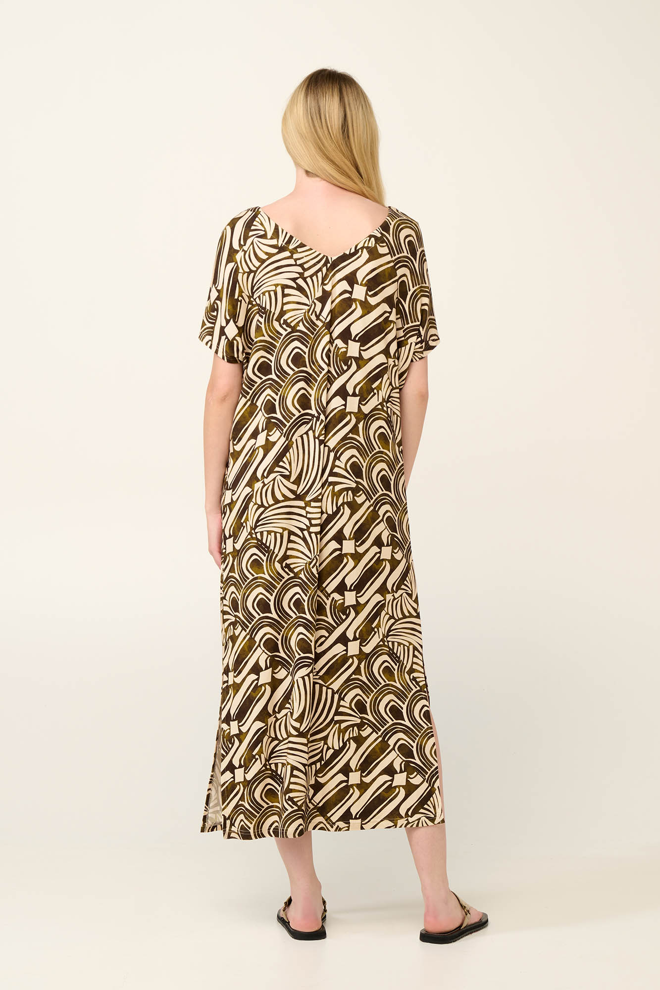 Προσθέστε στη συλλογή σας ένα εντυπωσιακό καφτάνι με Μαροκέν patchwork μοτίβο που συνδυάζει ιδιαίτερα σχέδια με γήινες αποχρώσεις. Σχεδιασμένο για να χαρίσει καλοκαιρινή κομψότητα, με λαιμόκοψη V και ανοίγματα στο πλάι για μεγαλύτερη ελευθερία κινήσεων. Είναι κατασκευασμένο από ελαστική viscose που πέφτει χυτά στο σώμα διασφαλίζοντας άνεση και κίνηση σε κάθε βήμα.
