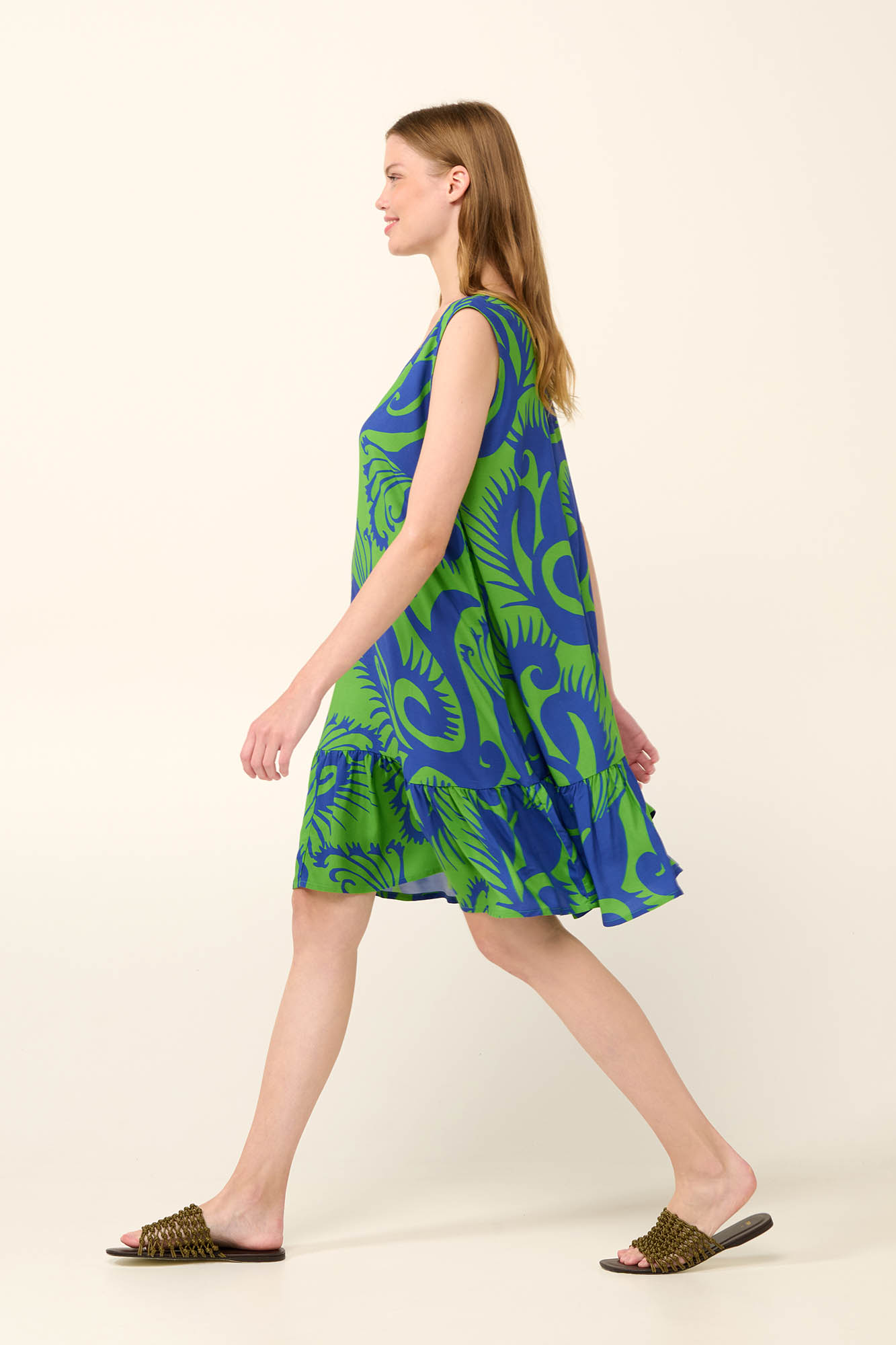 Αναδείξτε το καλοκαιρινό σας στυλ με αυτό το αέρινο, αμάνικο φόρεμα, διακοσμημένο με αφηρημένο μοτίβο θαλάσσιας ζωής σε έντονες, ζωντανές αποχρώσεις. Φτιαγμένο από ελαφριά viscose ποπλίνα, πέφτει όμορφα στο σώμα για μια αβίαστα κομψή εμφάνιση. Η V λαιμόκοψη κολακεύει τη σιλουέτα, ενώ το βολάν στο κάτω μέρος χαρίζει κίνηση και φρεσκάδα. Ιδανικό για ηλιόλουστες ημέρες, προσφέρει άνεση για βόλτες στη πόλη ή καλοκαιρινές αποδράσεις.