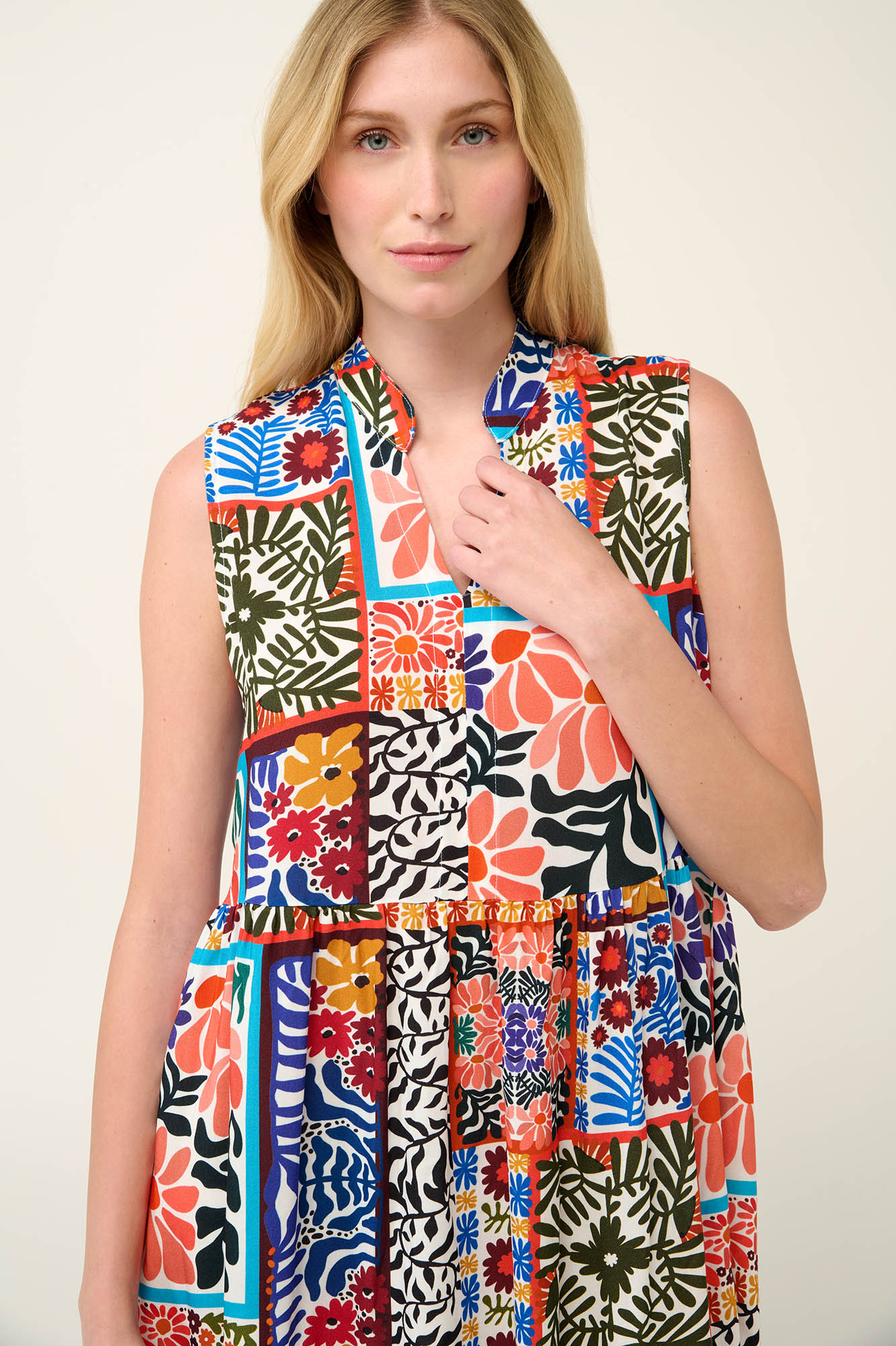 ‘Ένα καλοκαιρινό αμάνικο φόρεμα εμπνευσμένο από την βραζιλιάνικη τέχνη μωσαϊκών πλακιδίων που θα δώσει έντονη νότα στη γκαρνταρόμπα σας. Σχεδιασμένο με θηλυκή λαιμόκοψη V και σούρες για μεγαλύτερη άνεση και ελεύθερη κίνηση. Είναι κατασκευασμένο από viscose ποπλίνα για να προσφέρει ελαφριά και αέρινη αίσθηση. Μια πρόταση για τις ζεστές ημέρες και καλοκαιρινές αποδράσεις με άνεση και μοναδικό στυλ.