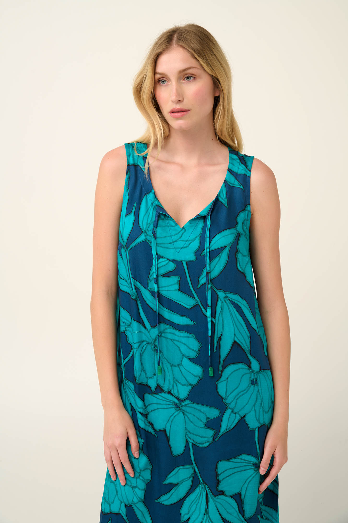 Επιλέξτε για τις διακοπές σας ένα αμάνικο καλοκαιρινό φόρεμα σε μπλε φλοράλ μοτίβο με παιώνιες. Είναι σχεδιασμένο σε χαλαρή γραμμή για άνετη εφαρμογή με V λαιμόκοψη που δένεται με διακριτικά κορδόνια για προσαρμοζόμενη εμφάνιση. Κατασκευασμένο από ελαφριά και δροσερή viscose ποπλίνα είναι μια ιδανική επιλογή για τις ζεστές μέρες του καλοκαιριού.