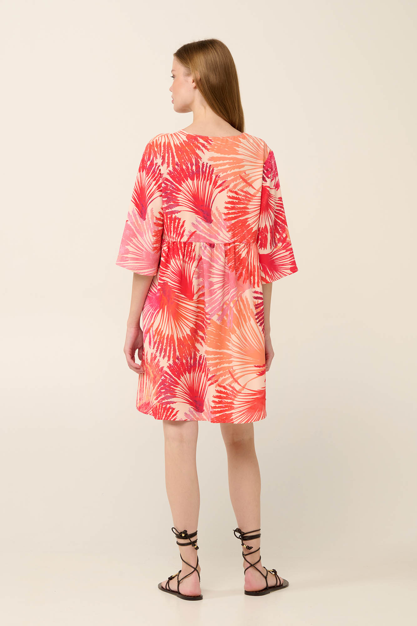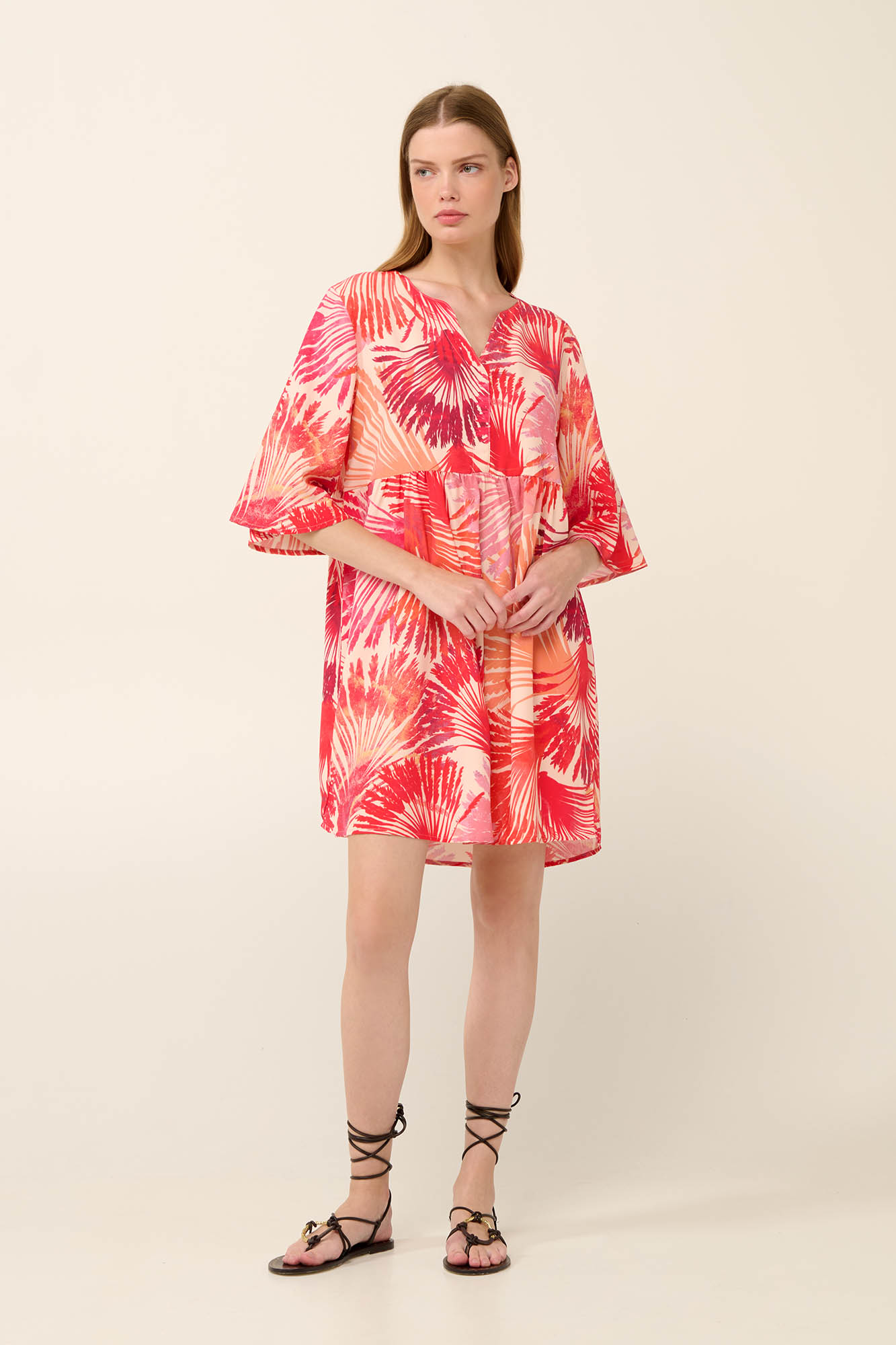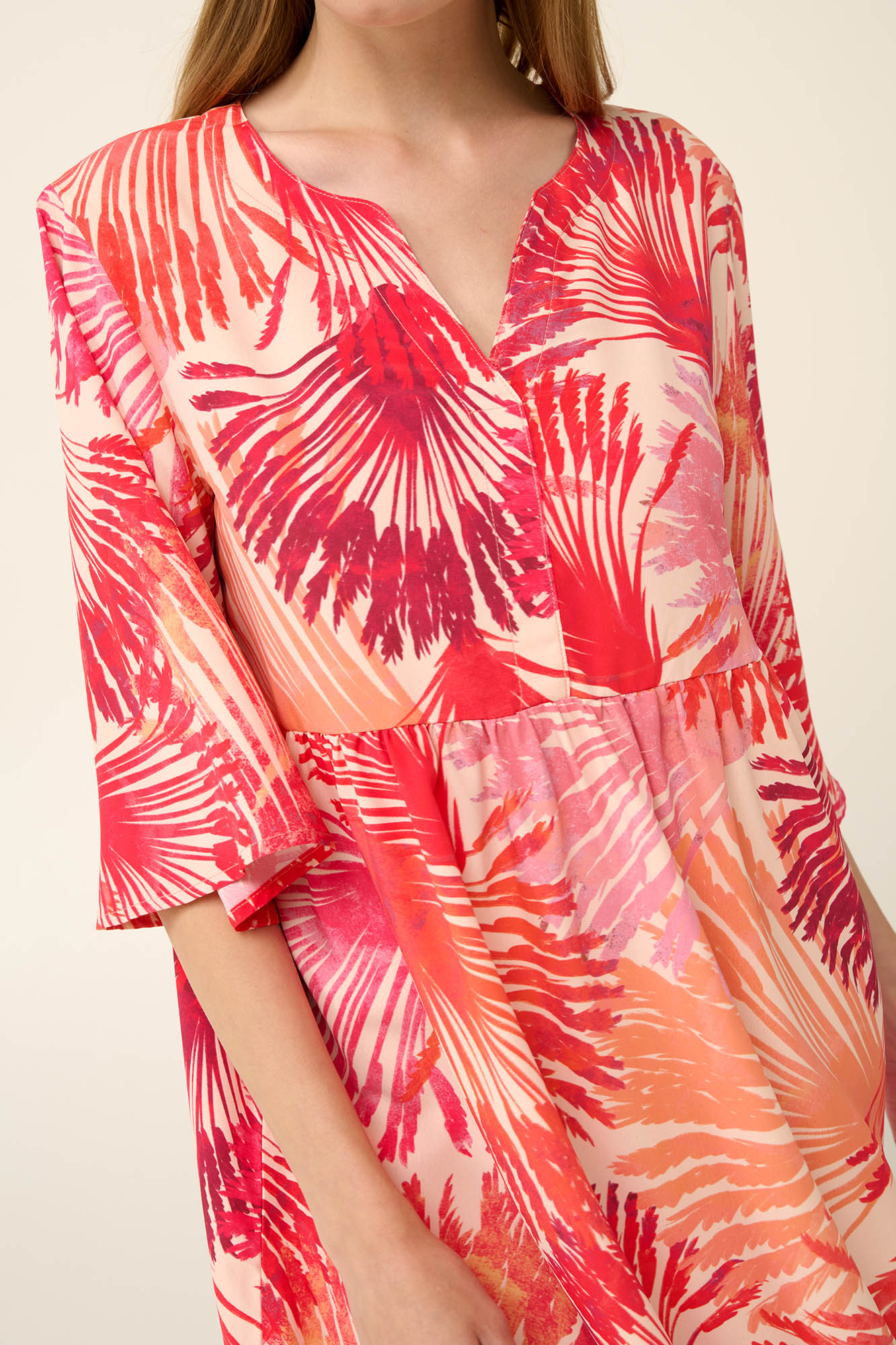Επιλέξτε ένα αέρινο καλοκαιρινό φόρεμα με το εντυπωσιακό μοτίβο με φοίνικες σε αποχρώσεις του ηλιοβασιλέματος. Είναι κατασκευασμένο από ανάλαφρη viscose ποπλίνα που χαρίζει απαλή και δροσερή αίσθηση στο σώμα.. Σχεδιασμένο σε χαλαρή γραμμή, με αέρινα μανίκια 3/4 και κολακευτική λαιμόκοψη V, αποπνέει ανεπιτήδευτη κομψότητα. Ιδανικό για βόλτες στην παραλία, καλοκαιρινές αποδράσεις και casual εμφανίσεις.