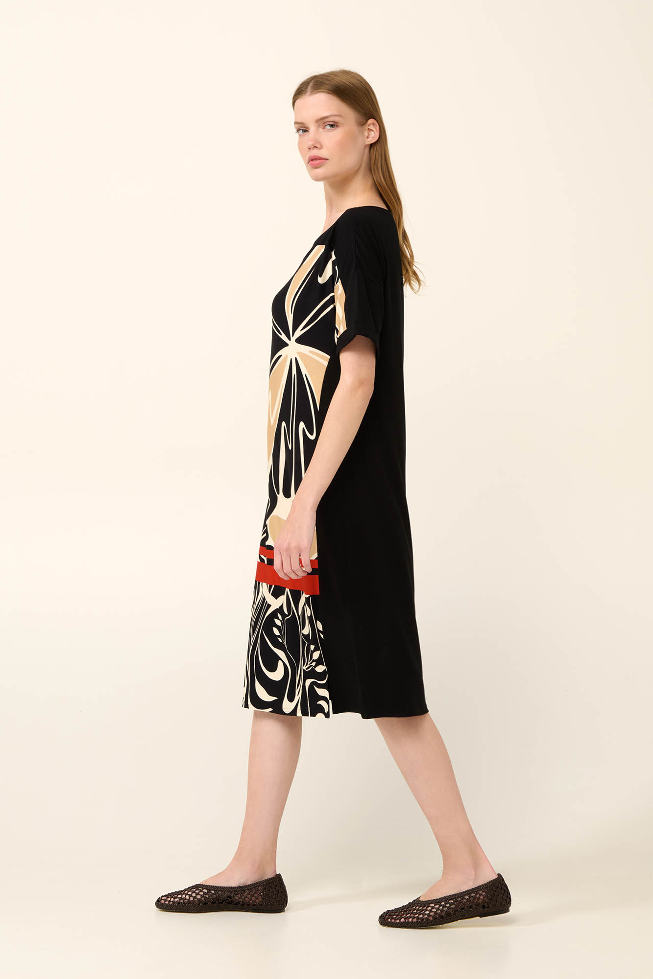 Αέρινο καλοκαιρινό φόρεμα με αφηρημένο μοτίβο με ζωγραφισμένα λουλούδια. Είναι σχεδιασμένο για να σας χαρίσει κομψότητα, με φαρδιά λαιμόκοψη, κοντά μανίκια και χαλαρή γραμμή που αγκαλιάζει το σώμα. Κατασκευασμένο από ελαστική viscose, με χαλαρή εφαρμογή και μονόχρωμη πλάτη που δημιουργεί μια διακριτική αντίθεση. Ένα άνετο φόρεμα που θα απολαύσετε όλη την ημέρα.