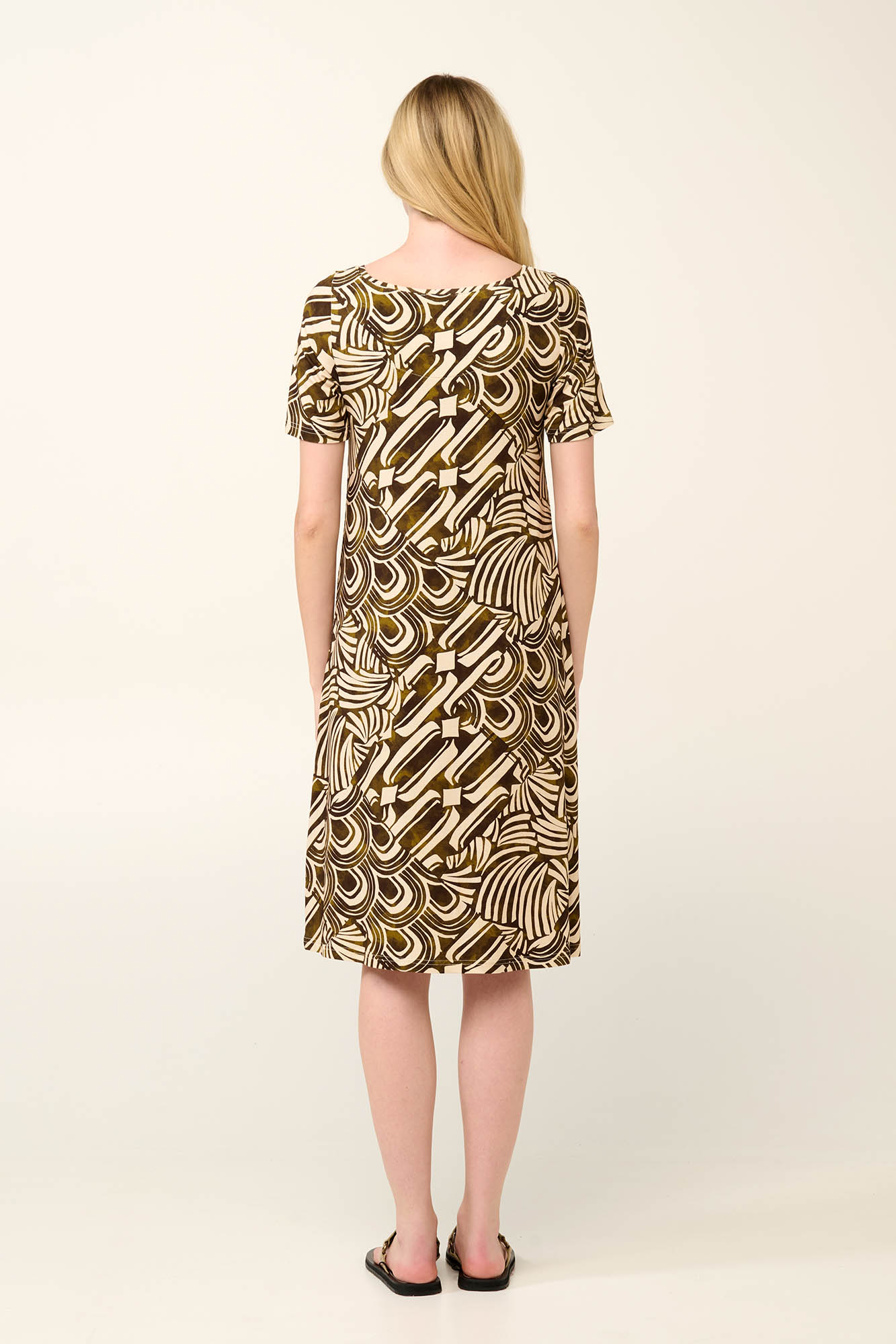Ανανεώστε τη γκαρνταρόμπα σας με ένα κομψό καλοκαιρινό φόρεμα μέχρι το γόνατο, διακοσμημένο με ένα εντυπωσιακό μαροκέν patchwork μοτίβο. Είναι φτιαγμένο από απαλή, ελαστική viscose που προσφέρει δροσερή αίσθηση και τέλεια εφαρμογή. Με στρογγυλή λαιμόκοψη και κοντά μανίκια, είναι ιδανικό για χαλαρές casual εμφανίσεις και χαλαρές βόλτες στη παραλία. Συνδυάστε το με ένα απλό ζευγάρι σανδάλια για αβίαστη κομψότητα.