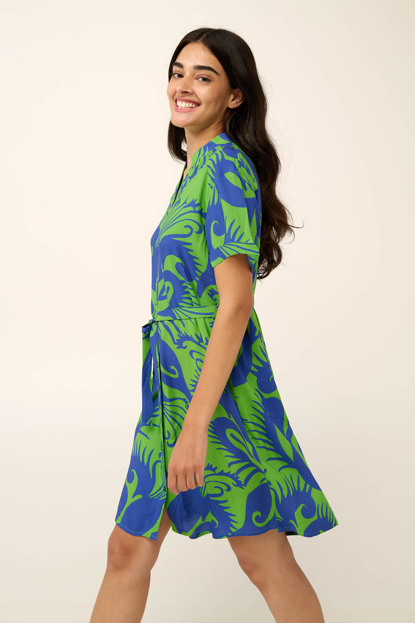 Ανανεώστε τη διάθεση σας με αυτό το αέρινο καλοκαιρινό κουμπωτό φόρεμα, διακοσμημένο εντυπωσιακό μοτίβο θαλάσσιας ζωής. Κατασκευασμένο από δροσερή viscose ποπλίνα, προσφέρει ανάλαφρη αίσθηση, ιδανική για τις ζεστές ημέρες. Σχεδιασμένο με πιέτα στην πλάτη που χαρίζει άνεση και ζώνη στη μέση αναδεικνύει τη σιλουέτα σας. Μια εξαιρετική επιλογή για βόλτες στην πόλη ή καλοκαιρινές αποδράσεις.