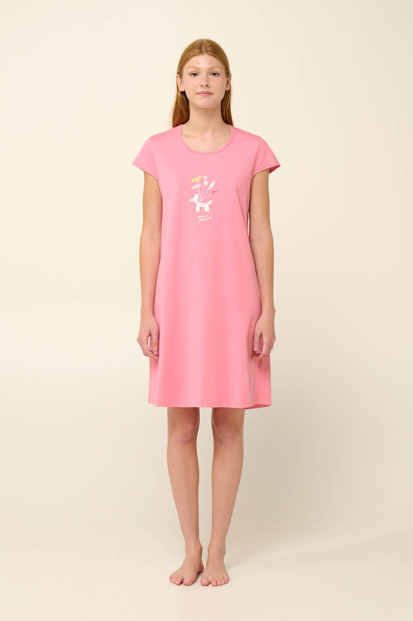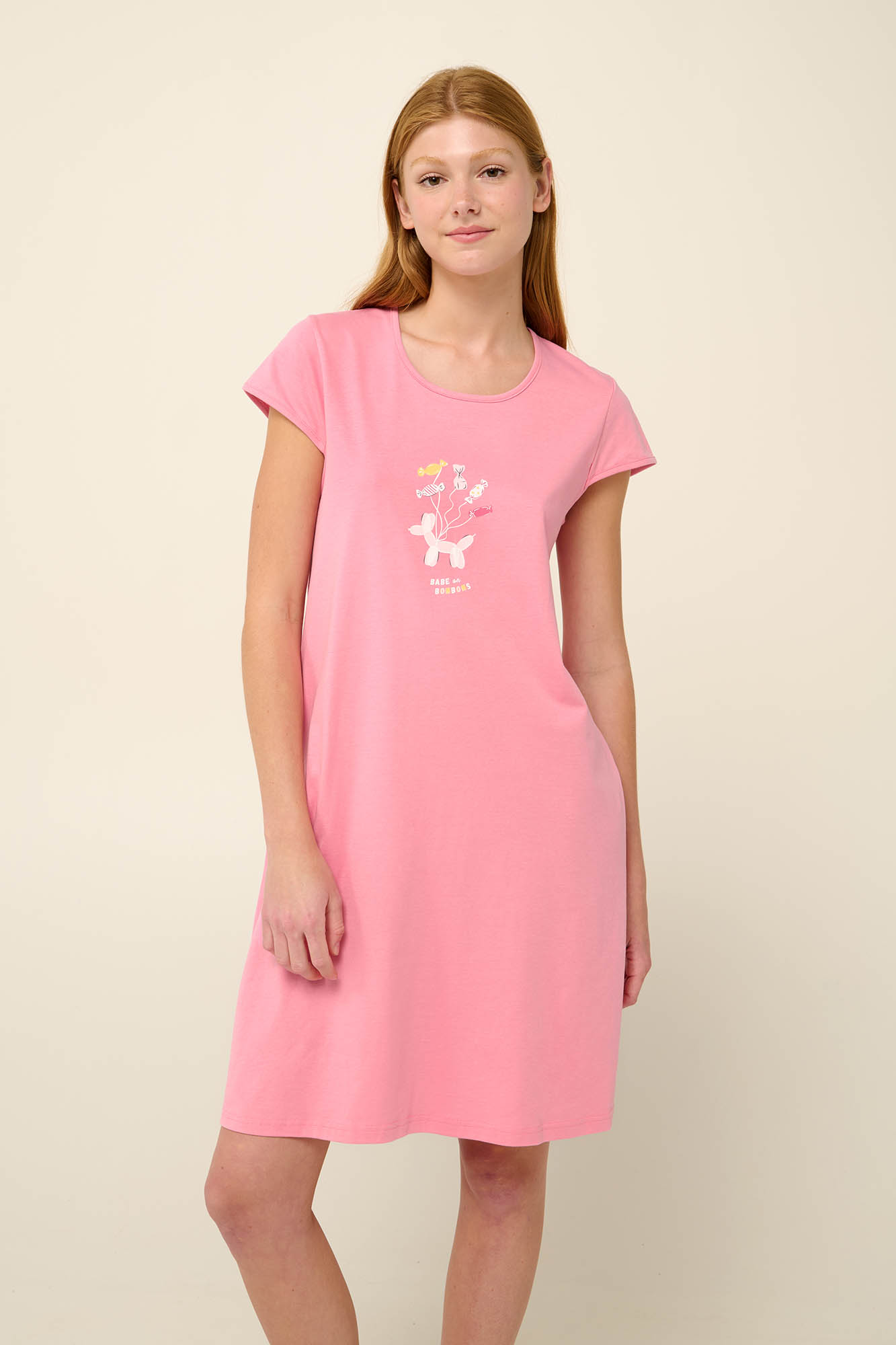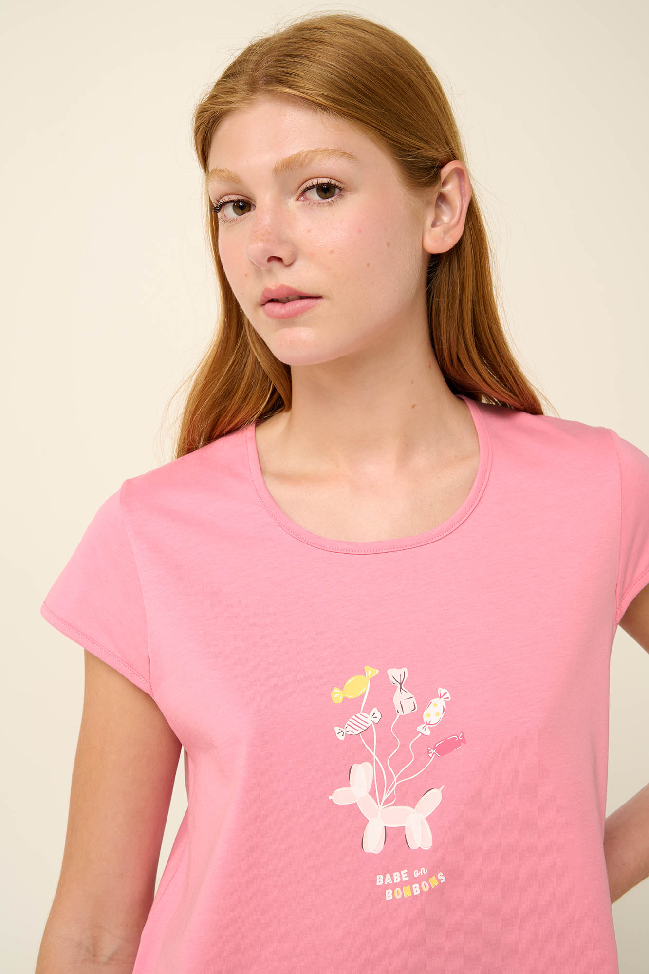 Προσθέστε μια νεανική νότα στη καθημερινότητα σας με ένα καλοκαιρινό νυχτικό σε απαλή ροζ απόχρωση με κοντό μανίκι και χαριτωμένο τύπωμα με καραμέλες και πινιάτα στο στήθος. Σχεδιασμένο σε κανονική γραμμή για άνετη εφαρμογή και κατασκευασμένο από 100% βαμβάκι signle jersey χαρίζει ανάλαφρη και διαπνέουσα αίσθηση στο σώμα, ιδανική για τις στιγμές χαλάρωσης σας ή το βραδινό σας ύπνο.