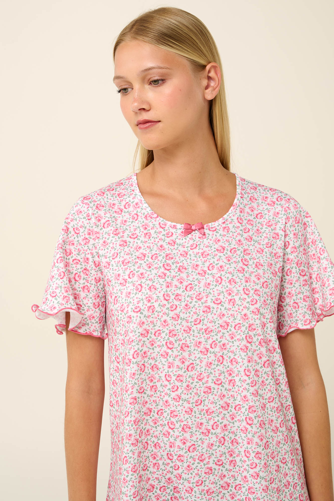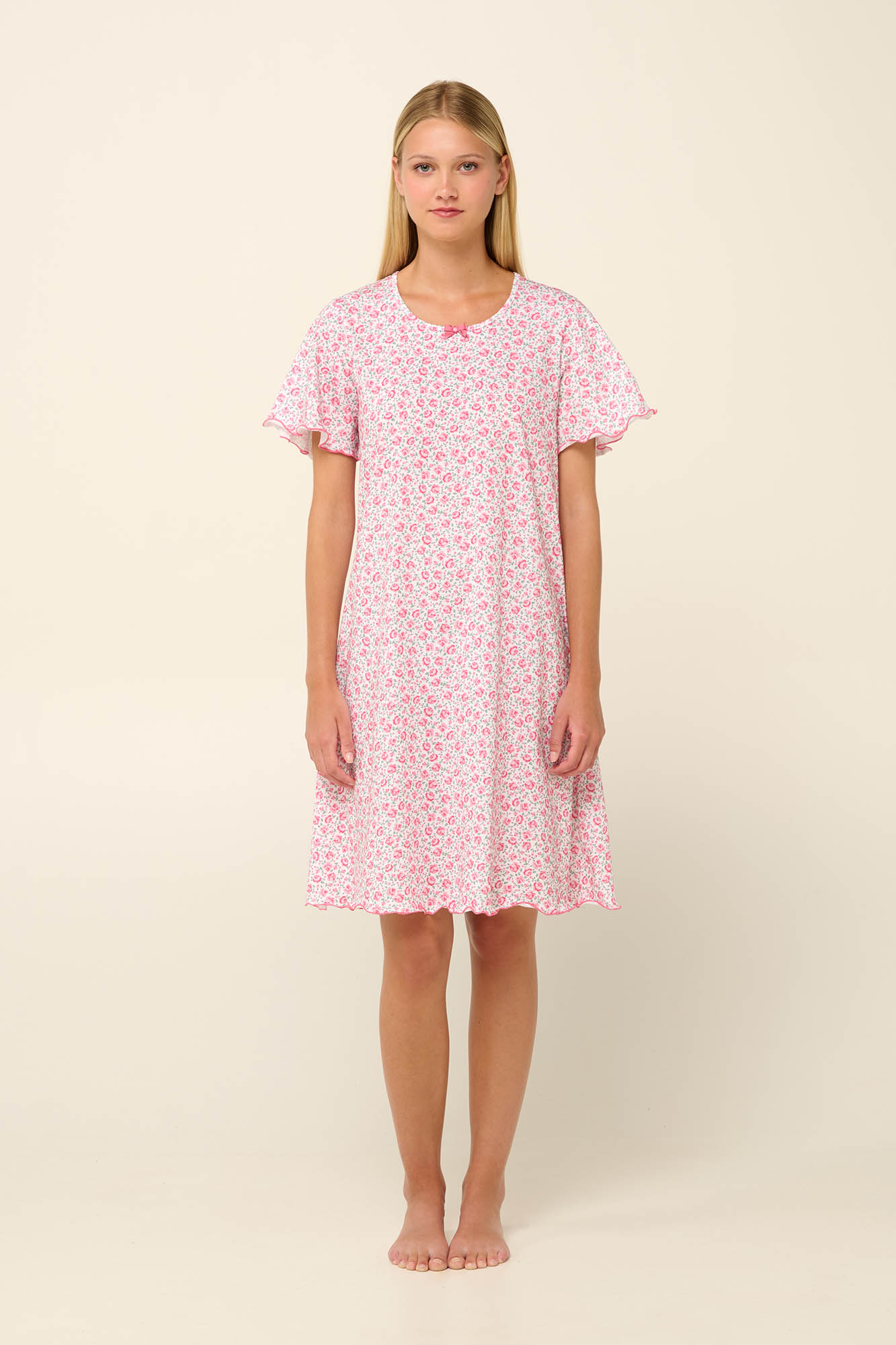 Επιλέξτε ένα καλοκαιρινό νυχτικό σε ρομαντικό μοτίβο με ανθισμένα τριαντάφυλλα, σχεδιασμένο με κοντό μανίκι και στρογγυλή λαιμόκοψη διακοσμημένη με ένα διακριτικό φιογκάκι. Είναι κατασκευασμένο από 100% βαμβάκι single jersey, που επιτρέπει στο σώμα να αναπνέει και χαρίζει απαλή αίσθηση στο σώμα. Ένα νυχτικό με κλασικό χαρακτήρα που θα σας βοηθήσει να απολαύσετε το βραδινό σας ύπνο ή ένα χαλαρό απόγευμα στο σπίτι.