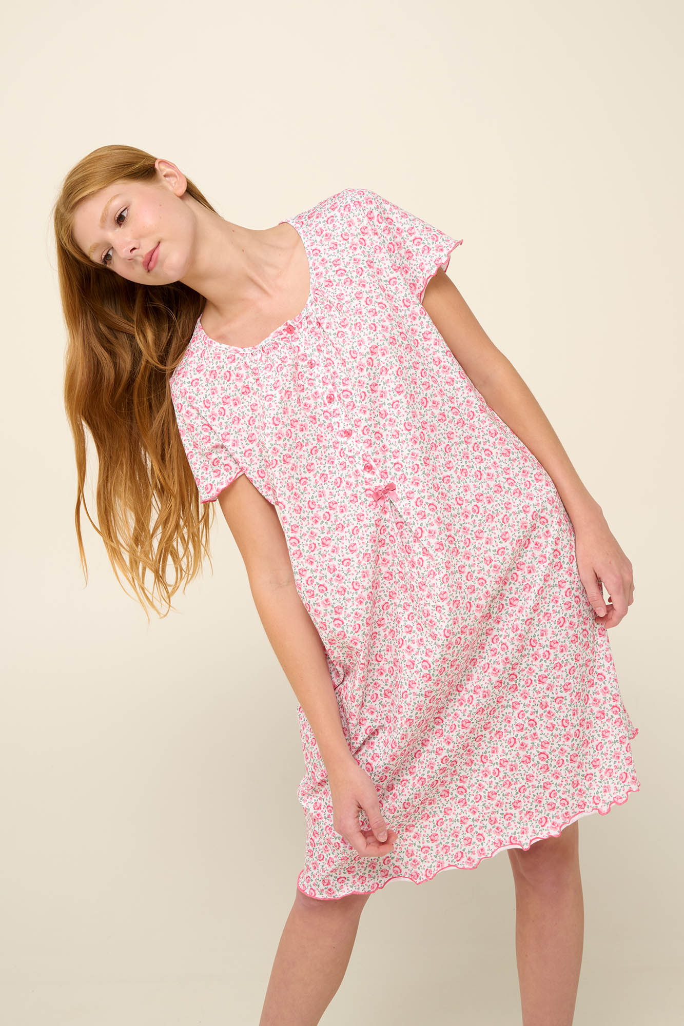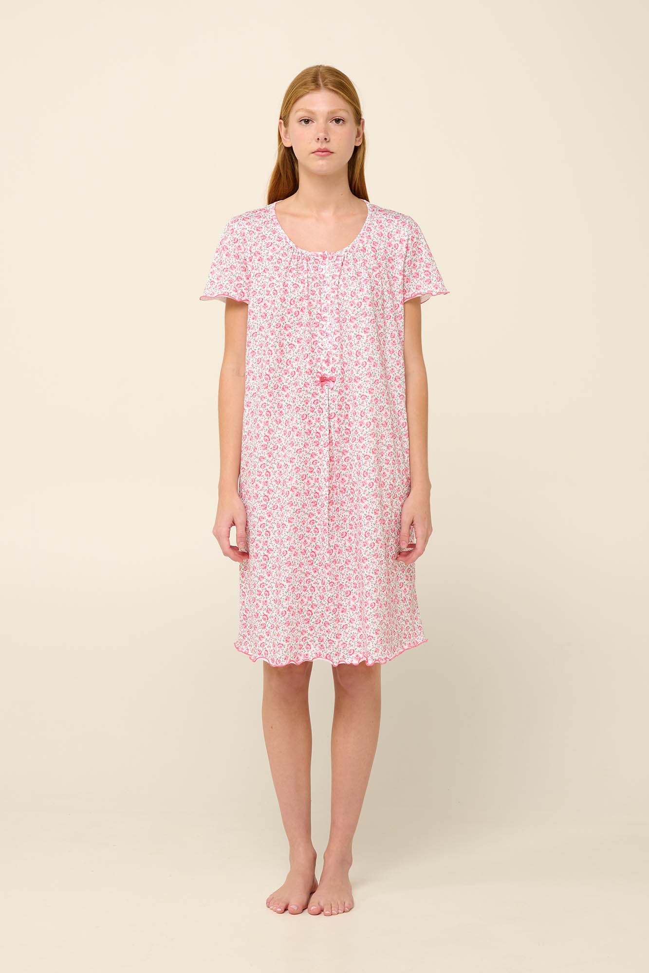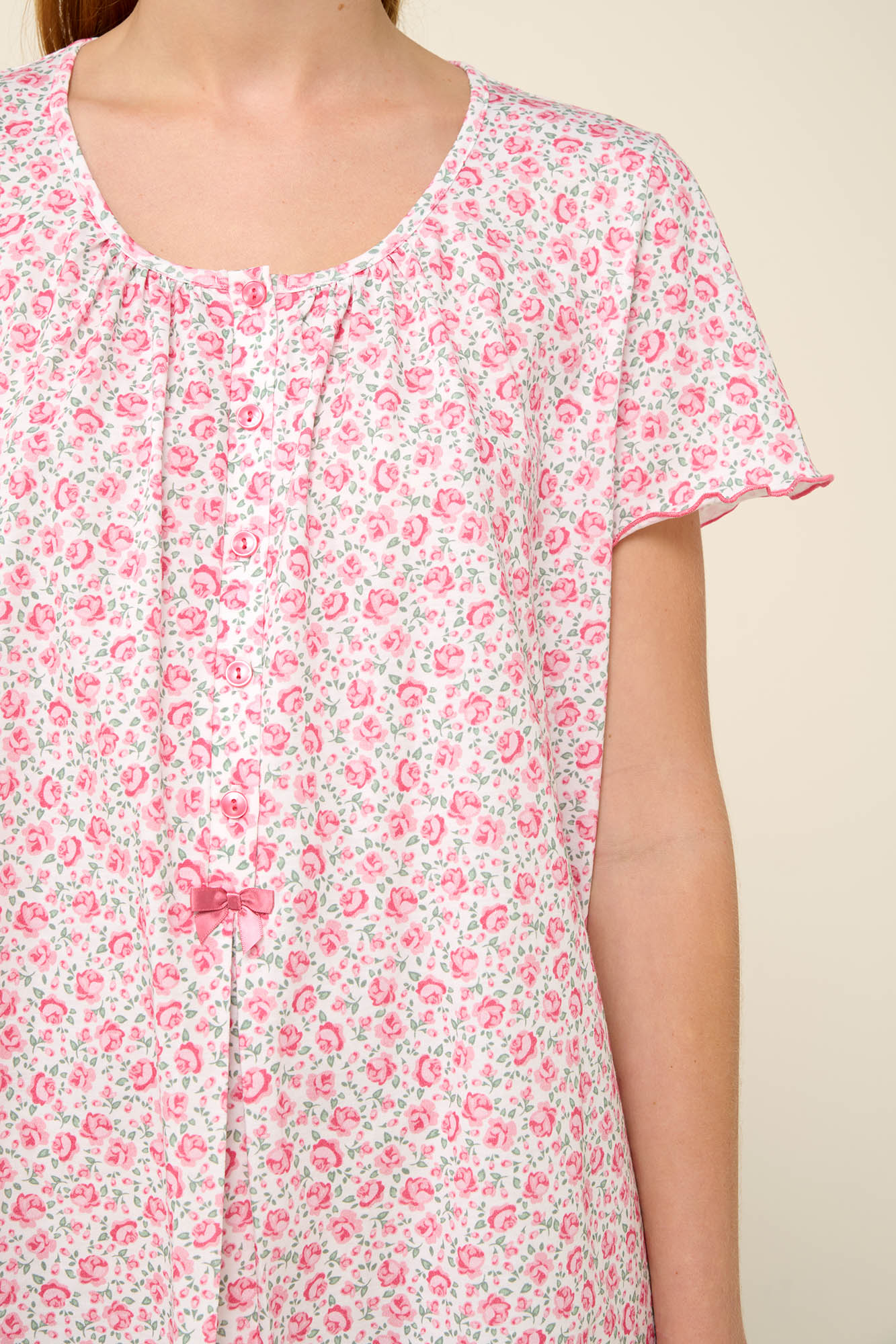 Αγκαλιάστε την ομορφιά ενός ζεστού απογεύματος με ένα καλοκαιρινό νυχτικό σε μοτίβο με ανθισμένα τριαντάφυλλα. Είναι σχεδιασμένο με κοντό μανίκι, πατιλέτα και σούρες στο στήθος που χαρίζουν μια νότα ρομαντικής κομψότητας. Σχεδιασμένο σε χαλαρή γραμμή με πιετά μπροστά που δίνει ακόμα μεγαλύτερη άνεση και ελευθερία κινήσεων. Ένα νυχτικό από 100% διαπνέον βαμβάκι single jersey που θα απολαύσετε όλο το καλοκαίρι.
