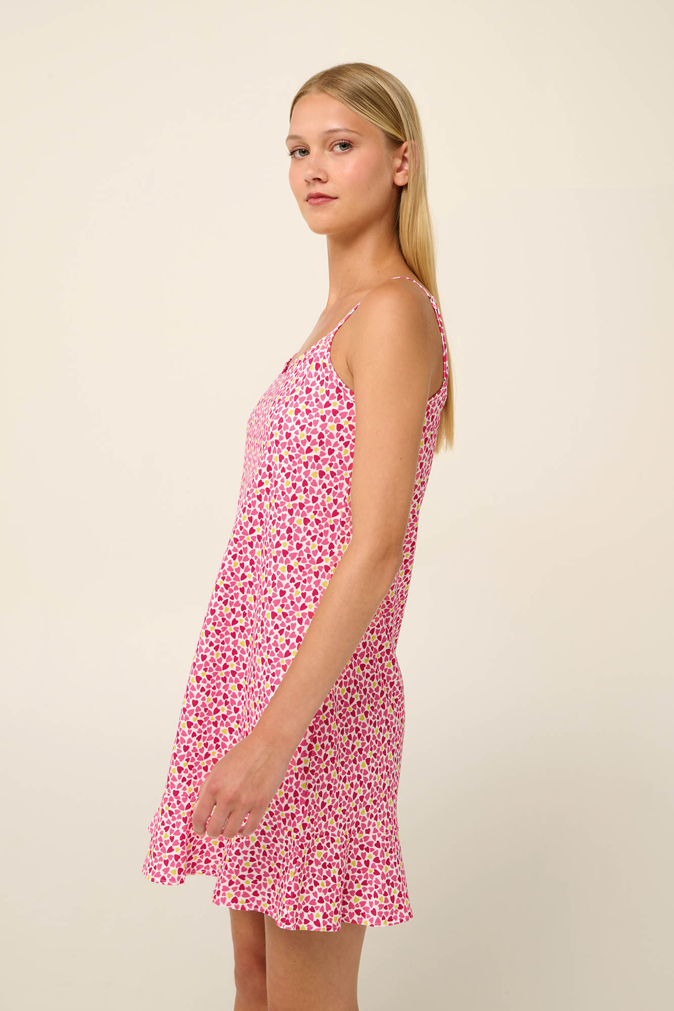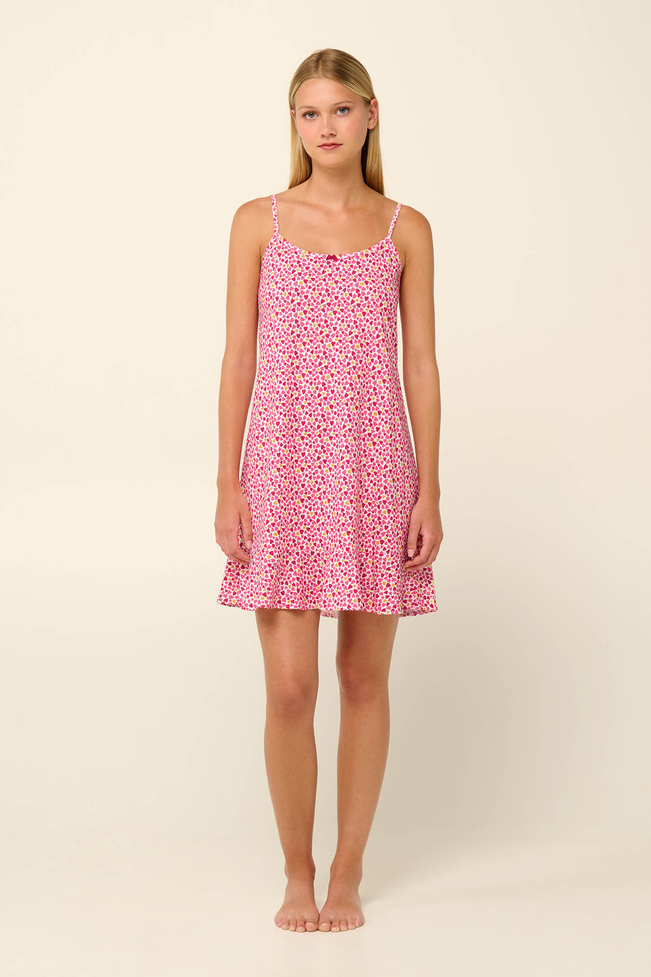 Προσθέστε στη συλλογή σας ένα δροσερό καλοκαιρινό νυχτικό με ρυθμιζόμενες τιράντες διακοσμημένο με ένα μωσαϊκό από καρδιές. Σχεδιασμένο σε χαλαρή γραμμή για ανάλαφρη και αέρινη αίσθηση που θα αναδείξει τη θηλυκότητα σας. Είναι κατασκευασμένο από 100% βαμβάκι single jersey που επιτρέπει στο δέρμα να αναπνέει και χαρίζει απαλή αίσθηση στο δέρμα για να απολαύσετε τον βραδινό σας ύπνο η ένα χαλαρό πρωινό.