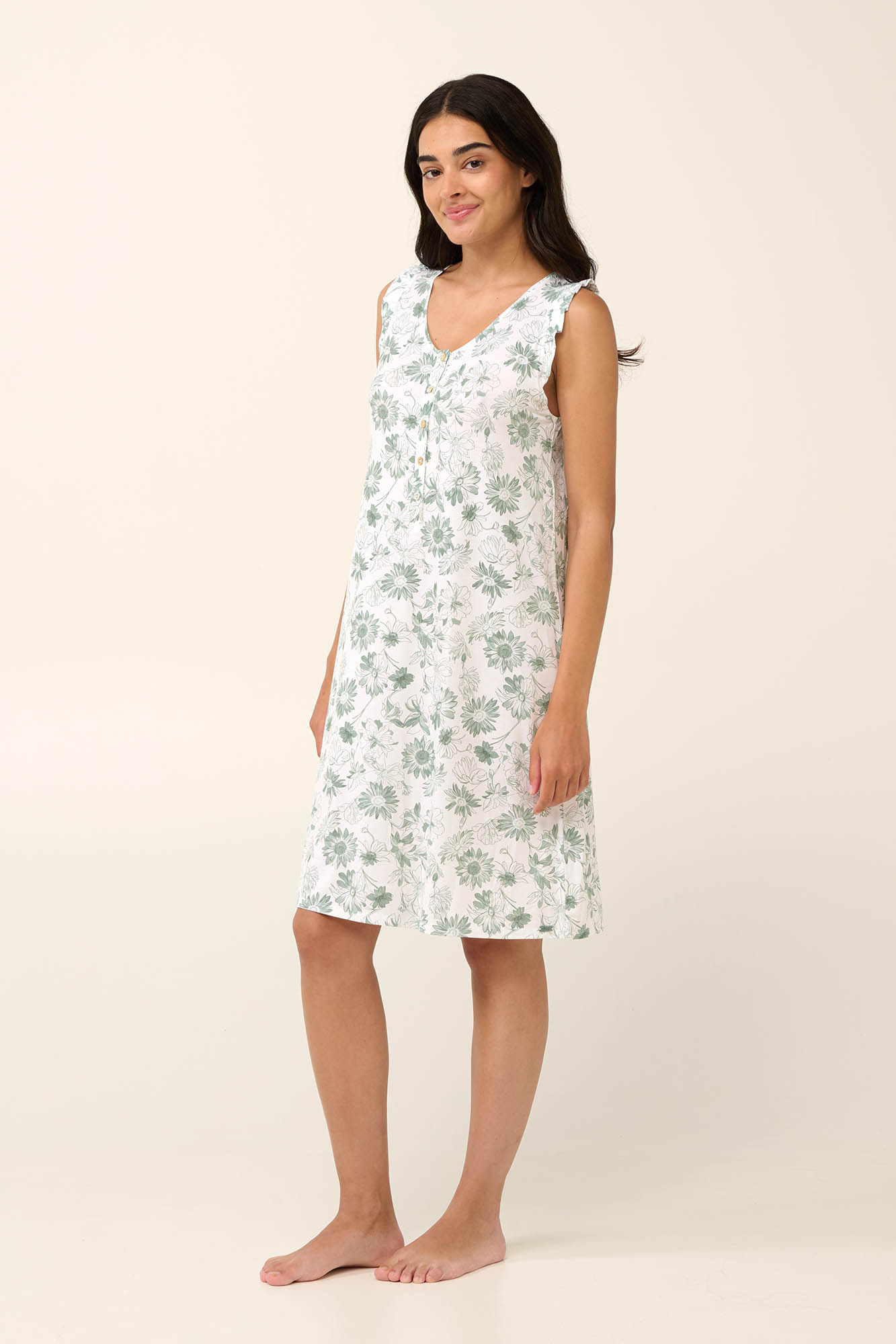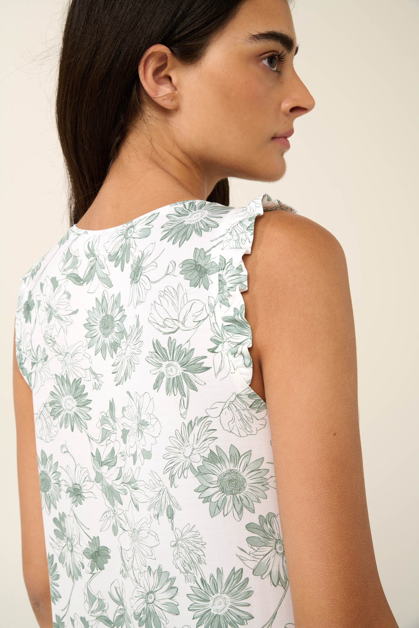 Αγκαλιάστε την άνεση που σας προσφέρει ένα αμάνικο καλοκαιρινό νυχτικό με ηλιοτρόπια σε γαλαζοπράσινες αποχρώσεις. Σχεδιασμένο με πατιλέτα σε κανονική γραμμή για δροσερή και άνετη εφαρμογή. Είναι κατασκευασμένο από διαπνέον micromodal που προσφέρει απαλή σα μετάξι αίσθηση στο δέρμα και αγκαλιάζει ευχάριστα το σώμα. Απολαύστε ακόμα και τις πιο ζεστές νύχτες ή ένα χαλαρό πρωινό στο σπίτι με φρεσκάδα και θηλυκότητα.