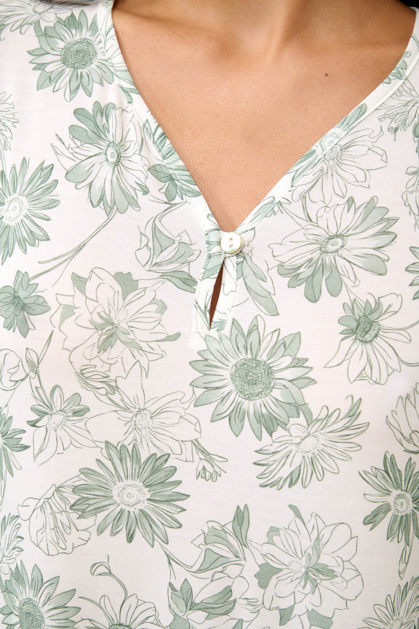 Απολαύστε τη γοητεία και τη διαχρονική κομψότητα που προσφέρει ένα καλοκαιρινό νυχτικό με γαλαζοπράσινα ηλιοτρόπια. Σχεδιασμένο με κοντό μανίκι και κουμπωτή V λαιμόκοψη σε κανονική γραμμή για άνετη εφαρμογή. Είναι κατασκευασμένο από εξαιρετικά απαλό micromodal που επιτρέπει στο δέρμα να αναπνέει και αγκαλιάζει ευχάριστα το σώμα αναδεικνύοντας κάθε σιλουέτα. Απολαύστε κάθε στιγμή στ σπίτι.