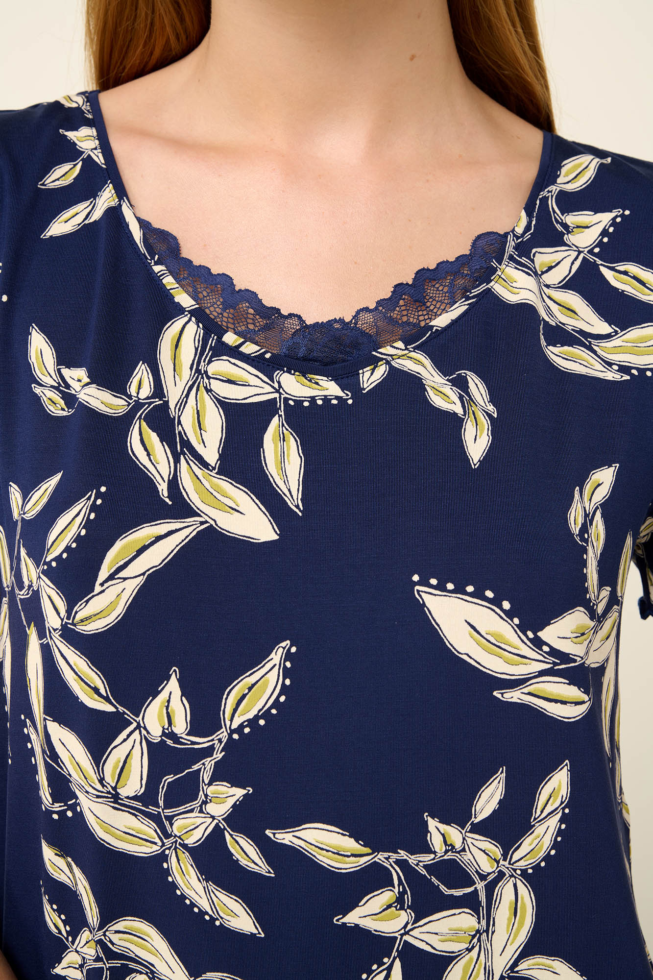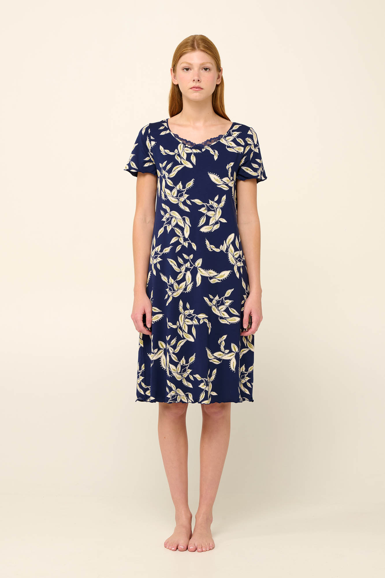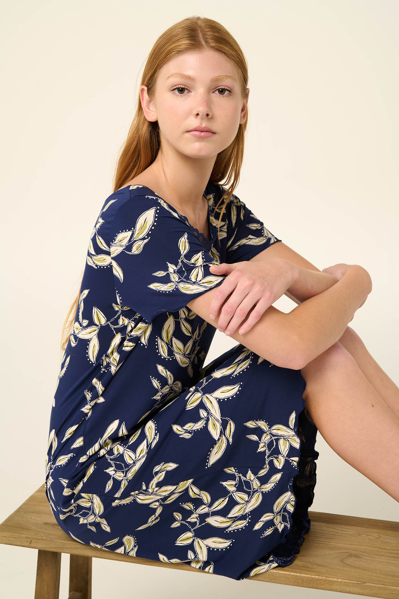Ενδώστε στην άνεση και τη κομψότητα που μπορεί να σας χαρίσει ένα καλοκαιρινό νυχτικό σε μοτίβο με φύλλα του ωκεανού. Σχεδιασμένο με κοντό μανίκι και λαιμόκοψη διακοσμημένη με δαντέλα που προσδίδει μια ρομαντική νότα. Κατασκευασμένο από εξαιρετικά απαλό και ελαφρύ micromodal σε χαλαρή γραμμή, επιτρέπει στο δέρμα να αναπνέει και θα σας βοηθήσει να απολαύσετε ένα χαλαρό καλοκαιρινό πρωινό ή ένα ήρεμο απόγευμα.
