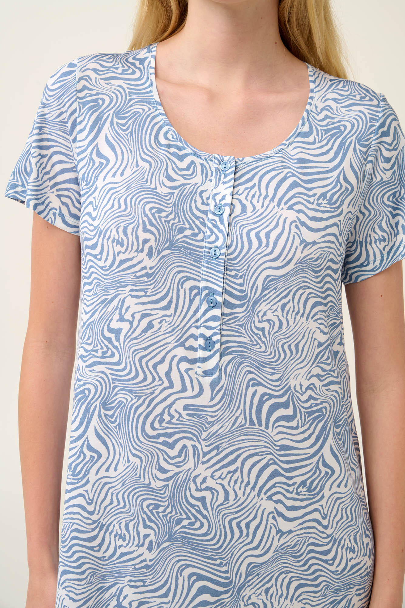 Αφεθείτε στην δροσερή άνεση που χαρίζει ένα καλοκαιρινό νυχτικό με εντυπωσιακό μοτίβο ζέβρας σε γαλάζια απόχρωση. Σχεδιασμένο με κοντό μανίκι και πατιλέτα, έχει χαλαρή εφαρμογή, ιδανική για τα ζεστά βράδια. Κατασκευασμένο από ελαφρύ micromodal που χαρίζει μεταξένια αίσθηση στο δέρμα και επιτρέπει στο σώμα να αναπνέει θα ντύσει με άνεση τα απογεύματα σας ή το βραδινό σας ύπνο.