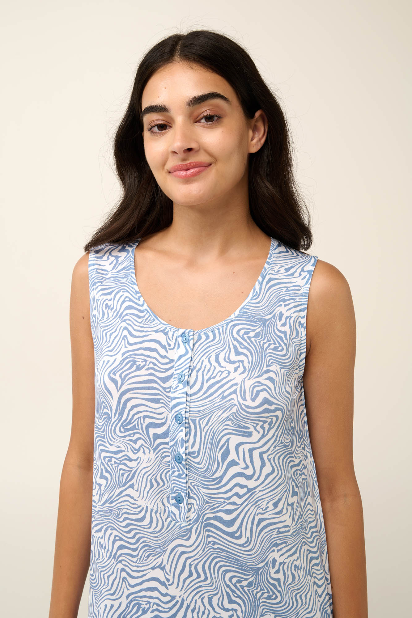 Παραμείνετε δροσερή και κομψή φορώντας ένα αμάνικο καλοκαιρινό νυχτικό με μοτίβο ζέβρας σε γαλάζια απόχρωση. Σχεδιασμένο με πατιλέτα στο στήθος για μεγαλύτερη άνεση, και κατασκευασμένο από ελαφρύ micromodal που χαρίζει μεταξένια αίσθηση στο δέρμα και επιτρέπει στο σώμα να αναπνέει είναι μια ιδανική πρόταση για να χαλαρώσετε το απόγευμα ή να απολύσετε με άνεση και στυλ το βραδινό σας ύπνο.