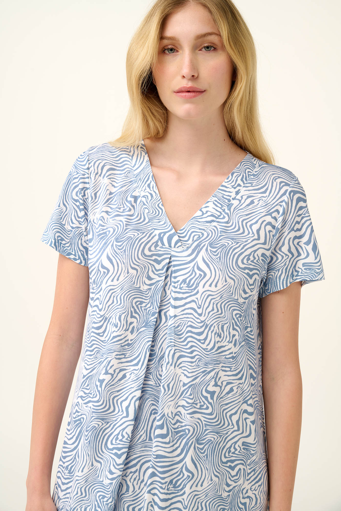 Αφεθείτε στη δροσερή γοητεία με ένα καλοκαιρινό νυχτικό με λαιμόκοψη V σε μοτίβο ζέβρας. Σχεδιασμένο σε χαλαρή γραμμή, με κοντό μανίκι και πιέτα στο στήθος είναι ιδανικό για τις ζεστές καλοκαιρινές νύχτες. Κατασκευασμένο από απαλό micromodal που επιτρέπει στο δέρμα να αναπνέει και διασφαλίζει πολυτελή και ανάλαφρη αίσθηση που θα απολαύσετε στο βραδινό σας ύπνο ή χαλαρώνοντας στον καναπέ.