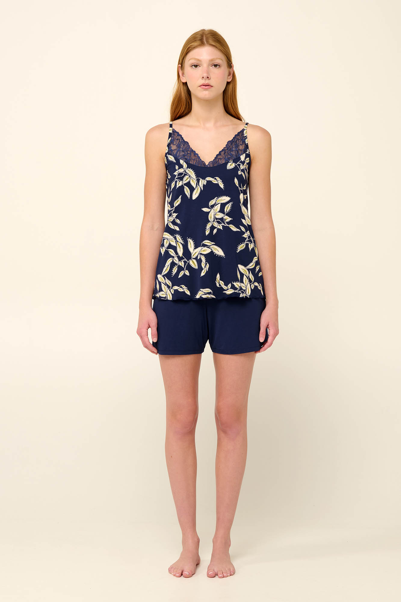 Προσθέστε στη συλλογή σας ένα ανάλαφρο babydoll με μονόχρωμο μπλε παντελόνι και μπλούζα σε μοτίβο με φύλλα του ωκεανού. Σχεδιασμένο με ρυθμιζόμενες τιράντες και λαιμόκοψη από κομψή δαντέλα. Είναι κατασκευασμένο από εξαιρετικά απαλό micromodal που αγκαλιάζει ευχάριστα στο σώμα. Θα σας βοηθήσει να απολαύσετε το βραδινό σας ύπνο και κάθε στιγμή στο σπίτι με θηλυκότητα και κομψότητα.