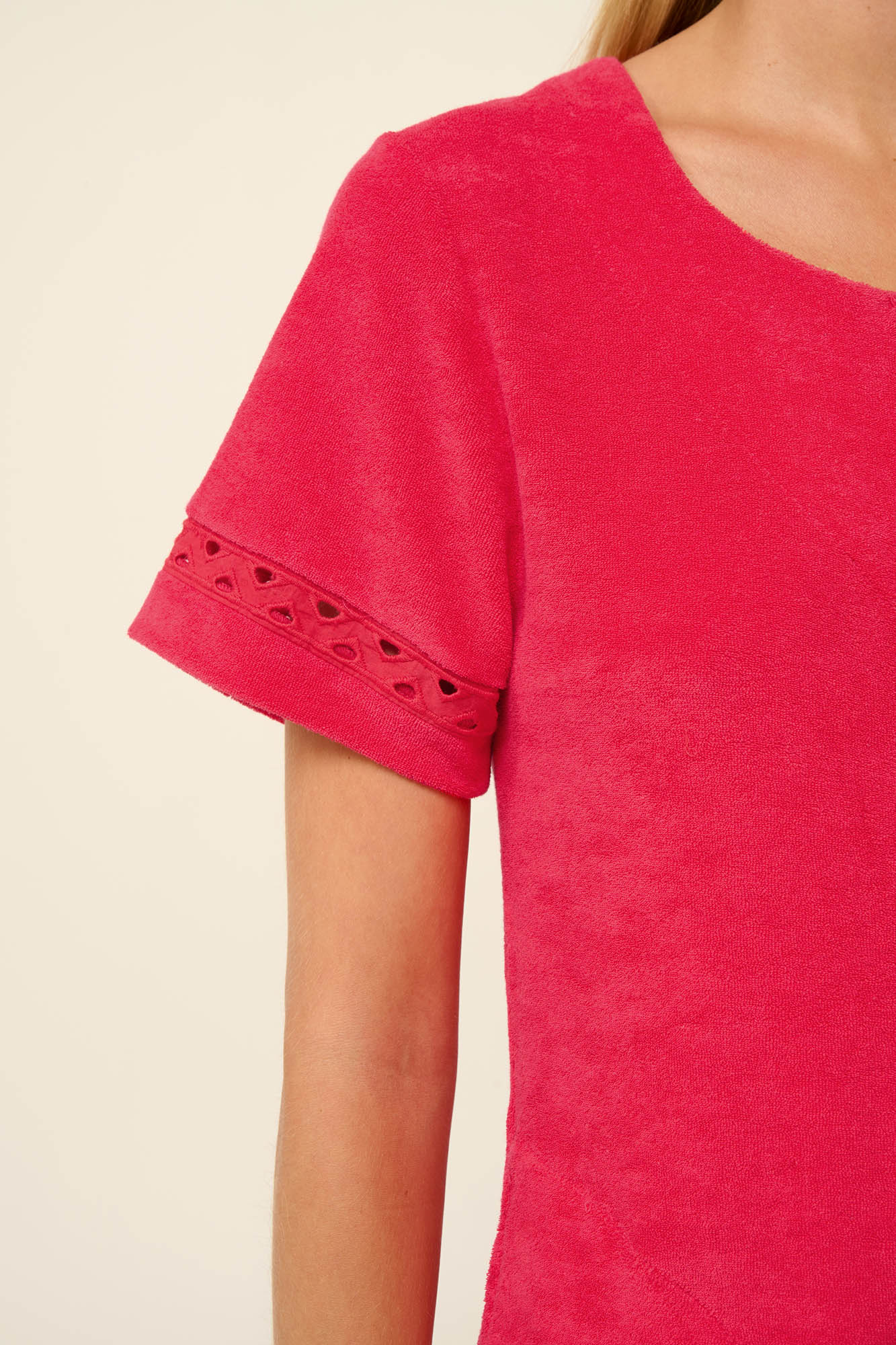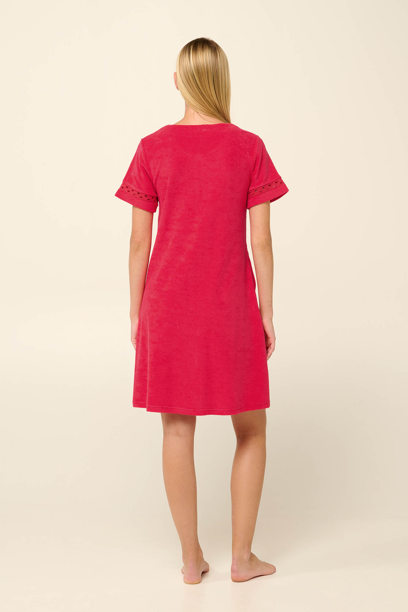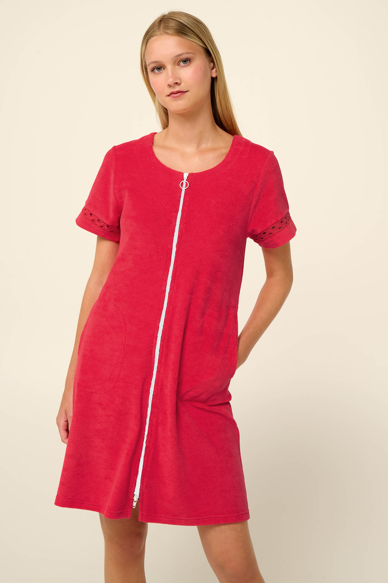 Προσθέστε στη γκαρνταρόμπα σας ένα μονόχρωμο frottee φόρεμα, κατασκευασμένο από ύφασμα με υψηλή περιεκτικότητα σε βαμβάκι που προσφέρει εξαιρετική απορροφητικότητα και διαπνοή. Είναι σχεδιασμένο με φερμουάρ μπροστά, κοντά μανίκια με διακριτικές διάτρητες λεπτομέρειες και άνετη εφαρμογή. Οι τσέπες στο πλάι προσθέτουν πρακτικότητα, καθιστώντας το ιδανικό για περιπάτους στη παραλία μετά από μια δροσερή βουτιά.