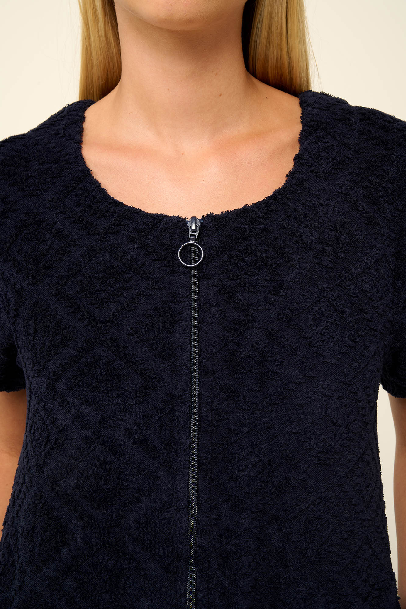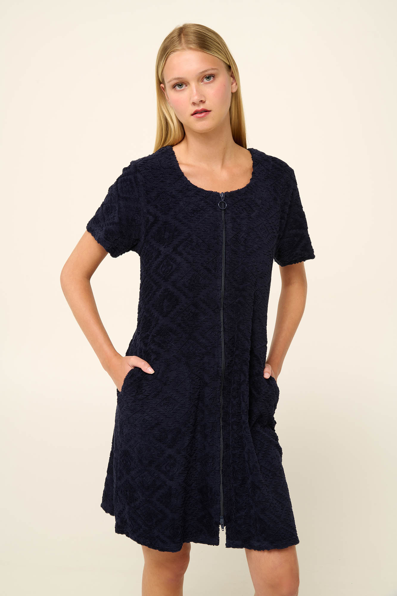 Προσθέστε στη γκαρνταρόμπα σας ένα μονόχρωμο frottee φόρεμα, κατασκευασμένο από ύφασμα με υψηλή περιεκτικότητα σε ανάγλυφο βαμβάκι που προσφέρει εξαιρετική απορροφητικότητα και διαπνοή. Είναι σχεδιασμένο με φερμουάρ μπροστά, κοντά μανίκια και άνετη εφαρμογή. Οι τσέπες στο πλάι προσθέτουν πρακτικότητα, καθιστώντας το ιδανικό για περιπάτους στη παραλία μετά από μια δροσερή βουτιά.