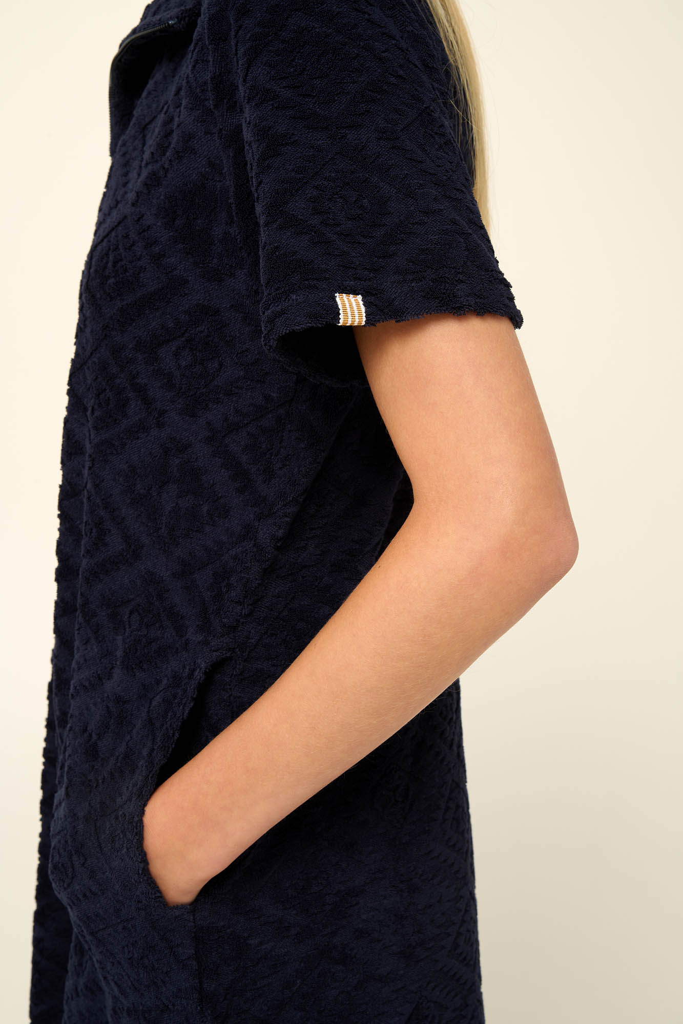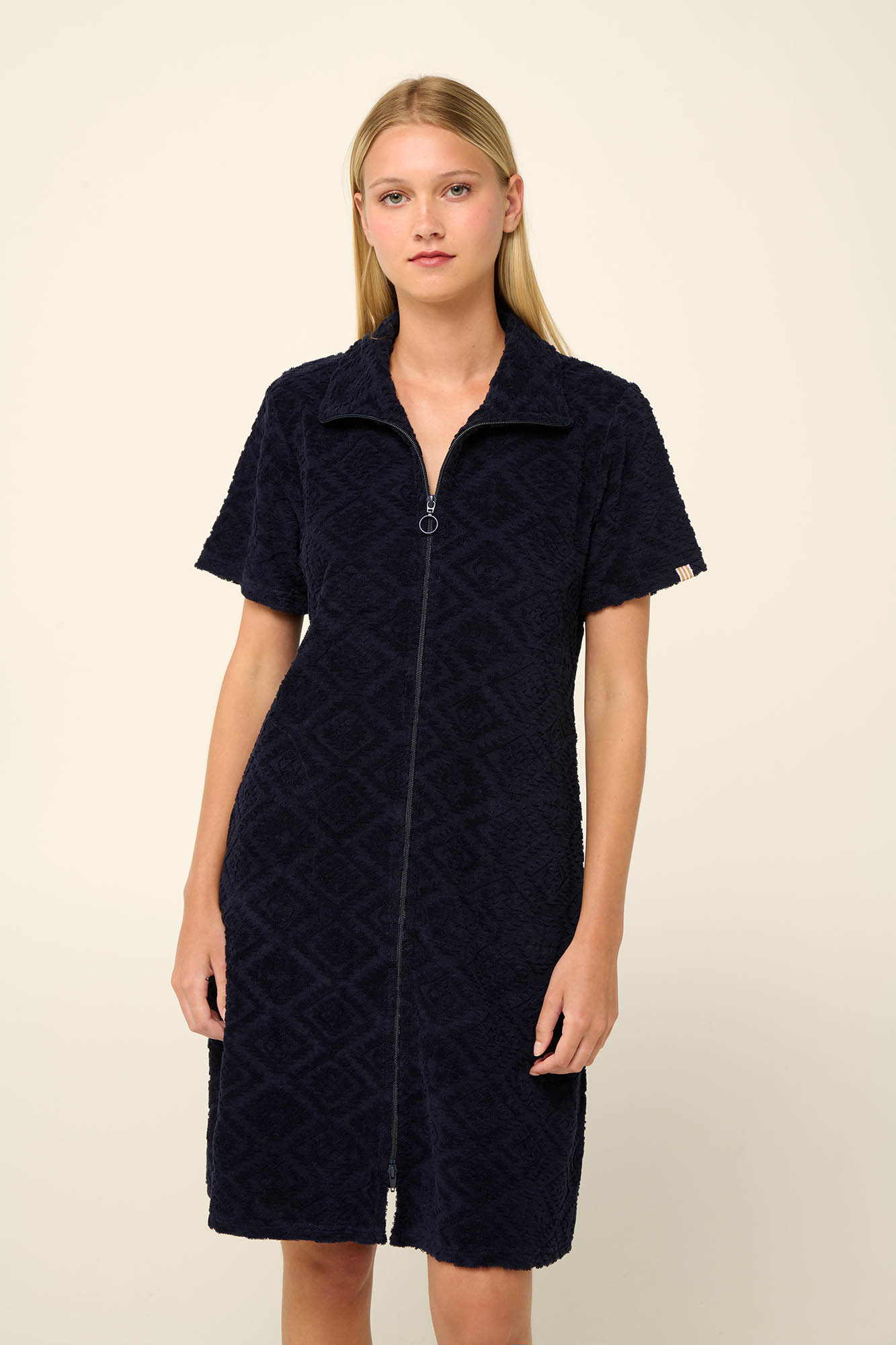 Προσθέστε στις αποσκευές σας ένα μονόχρωμο ανάγλυφο frottee φόρεμα θαλάσσης, κατασκευασμένο από ύφασμα με υψηλή περιεκτικότητα σε βαμβάκι που προσφέρει εξαιρετική απορροφητικότητα και διαπνοή. Διαθέτει φερμουάρ σε όλο το μήκος μπροστά, κοντά μανίκια με διακριτικές διάτρητες λεπτομέρειες και άνετη εφαρμογή. Οι τσέπες στο πλάι προσθέτουν πρακτικότητα, καθιστώντας το ιδανικό για την παραλία ή την πισίνα.