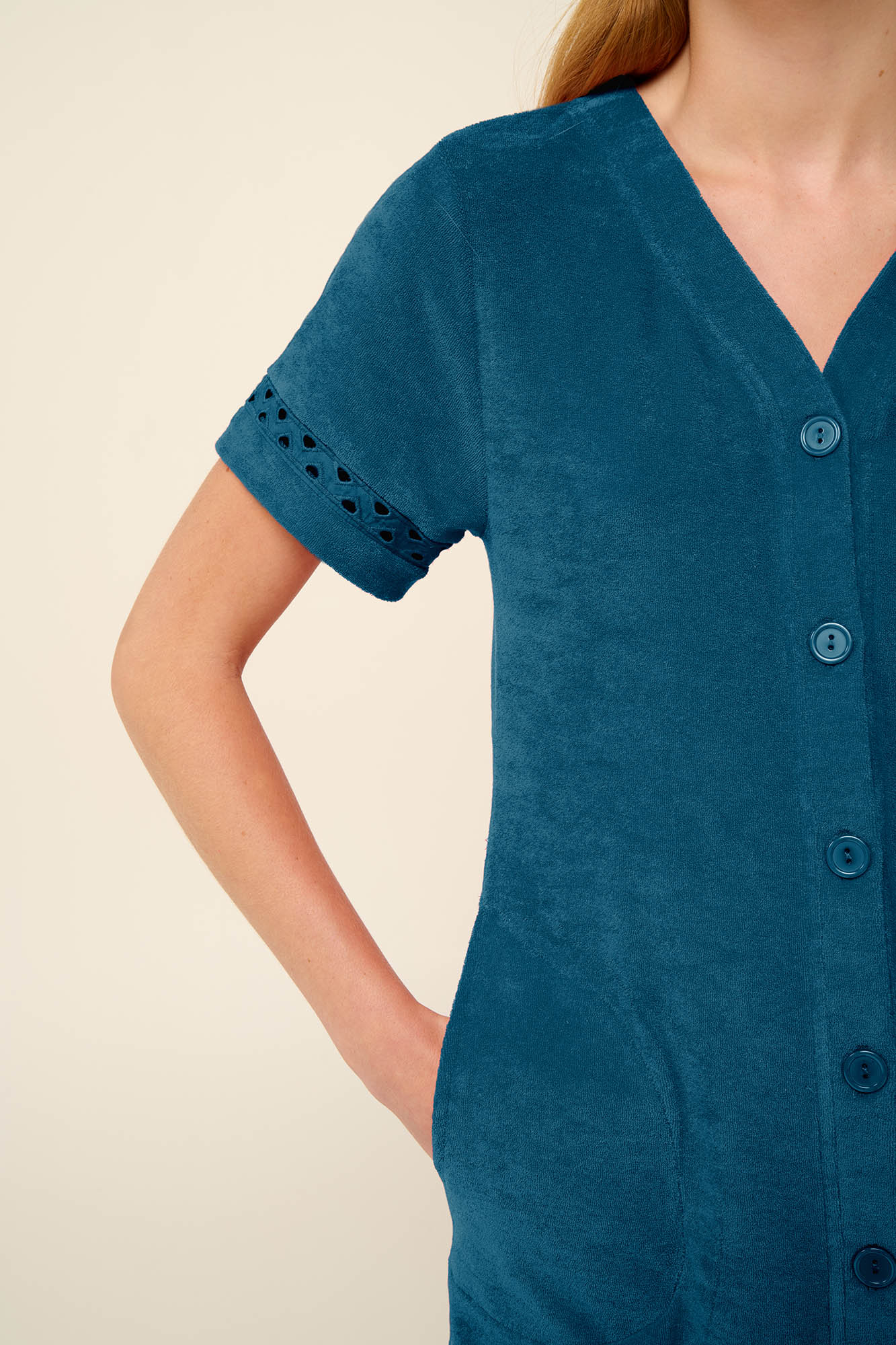 Απολαύστε άνεση και καλοκαιρινό στυλ με ένα μονόχρωμο frottee φόρεμα θαλάσσης. Είναι φτιαγμένο από απαλό ύφασμα με υψηλή περιεκτικότητα σε βαμβάκι που προσφέρει διαπνοή και απορροφητικότητα. Σχεδιασμένο με κουμπωτό μπροστινό μέρος και λαιμόκοψη V και κοντά μανίκια με διακριτικές διάτρητες λεπτομέρειες. Κατασκευασμένο σε άνετη γραμμή και πρακτικές τσέπες, είναι ιδανικό για την παραλία ή χαλαρές καλοκαιρινές εμφανίσεις.